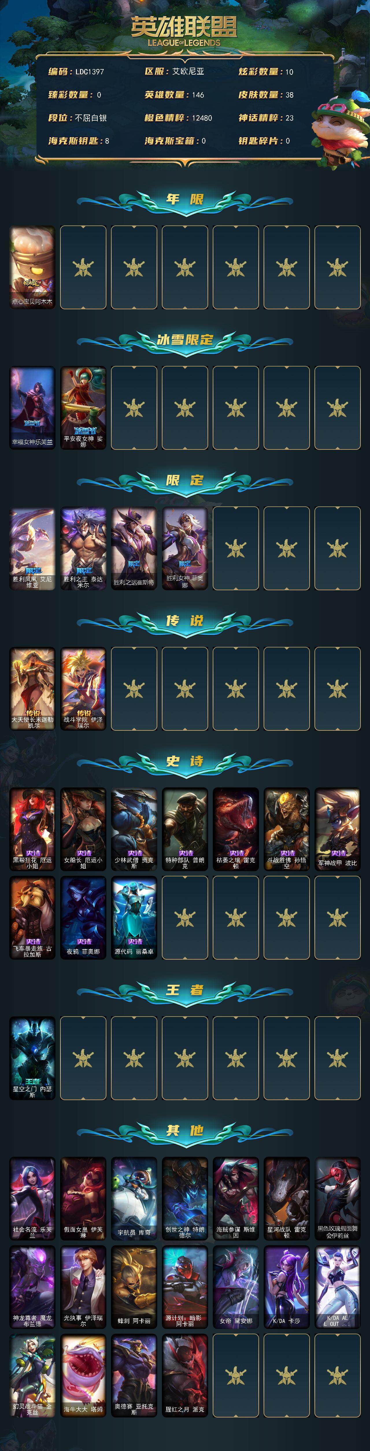 【ldc1397】146英雄/38皮肤/7限定/10炫彩/2传说/10史诗/白银/点心宝贝阿木木/幸福女神乐芙兰/平安夜女神娑娜/胜利凤凰艾尼维亚/胜利之王泰达米尔/胜利之运崔斯特/胜利女神菲奥娜/大天使长米迦勒凯尔/战斗学院伊泽瑞尔/黑帮狂花厄运小姐/女船长厄运小姐/少林武僧贾克斯/特种部队普朗克/枯萎之壤雷克顿/斗战胜佛孙悟空/军神战甲波比/飞车暴走族古拉加斯/夜鸦菲奥娜/源代码丽桑卓/星空之门内瑟斯/社会名流乐芙兰/假面女皇伊芙琳/宇航员库奇/创世之神特朗德尔/海贼参谋斯维因/星河战队雷克顿/黑色玫瑰假面舞会伊莉丝/神龙尊者魔龙布兰德/光执事伊泽瑞尔/蜂刺阿卡丽/源计划暗影阿卡丽/女帝黛安娜/kda卡莎/kdaallout卡莎/幻灵战斗猫金克丝/海牛大大塔姆/奥德赛亚托克斯/腥红之月派克