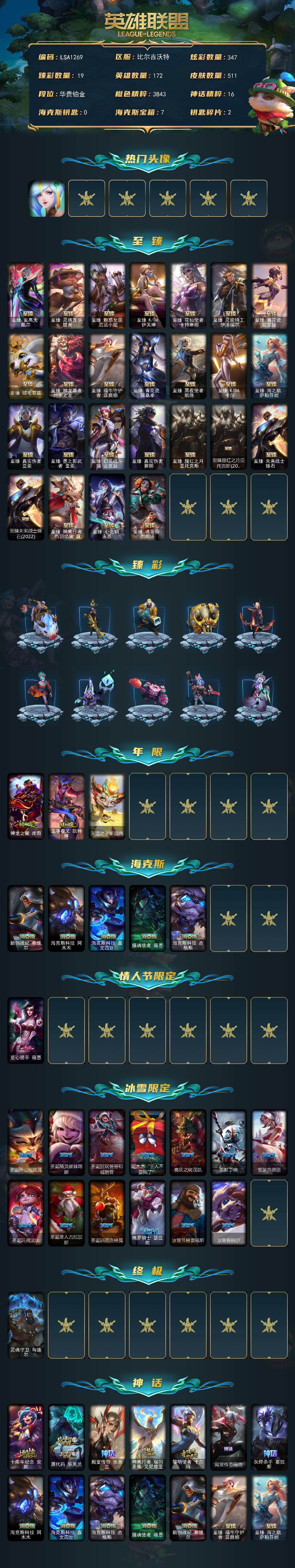 【lsa1269】172英雄/511皮肤/1终极/37神话/52限定/19臻彩/347炫彩/43传说/121史诗/铂金账号等级:729/春晖神女头像/至臻至高天凯尔/至臻灵魂莲华提莫/至臻魅惑女巫厄运小姐/至臻kda伊芙琳/至臻花仙使者卡特琳娜/至臻灵能特工伊泽瑞尔/至臻青花瓷拉克丝/至臻绒毛菲兹/至臻神龙尊者均衡之龙沃利贝尔/至臻福牛守护者菲奥娜/至臻青花瓷丽桑卓/至臻黑夜使者凯隐/至臻kda卡莎/至臻海之歌萨勒芬妮/至臻真实伤害亚索/至臻墨之影武者亚索/至臻幻灵战斗猫金克丝/至臻真实伤害赛娜/至臻腥红之月亚托克斯/至臻腥红之月亚托克斯2022/至臻未来战士锤石/至臻未来战士锤石2022/至臻神凰行者烈羽焰凰霞/至臻心之钢永恩/至臻魂蔷薇烈娜塔/天龙之子卡莎飞龙乘云/无畏骑士瑟庄妮赤子初心/玉净夜叉凯特琳炫金神机/冰雪节格雷福斯炫金/墨之影武者亚索金墨耀影/征服者阿利斯塔炫金/源计划联合艾希红莲之弓/灵魂莲华锐雯流火/最终boss维迦里大魔王/可爱可爱粉红红布里茨/幻灵战斗队长厄运小姐勇气赞歌/殿堂传奇乐芙兰登神/咖啡甜心格温酒醉樱桃/魔女阿卡丽虚荣/净雪之月莫甘娜冬虹/红莲之刃锐雯/心之钢伊泽瑞尔天纵才华/神龙之翼库奇/玉净夜叉凯特琳/天龙之子斯莫德/新创战纪希维尔/海克斯科技阿木木/海克斯科技嘉文四世/摄魂使者薇恩/海克斯科技吉格斯/觅心猎手薇恩/圣诞开心鬼提莫/圣诞精灵崔丝塔娜/圣诞狂欢努努和威朗普/阿木木“主人不要我了”/喜庆之树茂凯/雪默丁格/雪装奈德丽/圣诞玩偶波比/圣诞老人古拉加斯/圣诞驯鹿克格莫/魄罗骑士瑟庄妮/冰雪节格雷福斯/冰雪兽纳尔/灵魂守卫乌迪尔/十周年纪念安妮/源代码乐芙兰/殿堂传奇乐芙兰/神凰行者瑞羽圣凰艾尼维亚/黎明使者卡尔玛/殿堂传奇薇恩/灰烬杀手塞拉斯/至臻未来战士锤石2022/至臻腥红之月亚托克斯2022/冠军之刃锐雯2016/fnatic迦娜/fnatic嘉文四世/暗杀星慎/sktt1劫/ssw图奇/sktt1阿兹尔/sktt1雷克顿/sktt1瑞兹/sktt1伊莉丝/sktt1辛德拉/sktt1扎克/ssg洛/f墨菲特/dwg蕾欧娜/玉剑传说无劫/暗裔英雄盖伦/胜利之王泰达米尔/胜利巨口克格莫/胜利女神娑娜/胜利剑圣易/胜利之运崔斯特/胜利女神菲奥娜/海贼瑞兹/密林猎手提莫/暗影沃里克/奥德赛吉格斯/野兽猎人泰达米尔/电玩战魂赫卡里姆/都铎王朝图奇/玉剑传说舞龙卫/钢铁之翼艾尼维亚/防暴天使凯尔/惊悚派对费德提克/警用试作体k9内瑟斯/铁哥们儿奥拉夫/地狱之门卫士加里奥/魔幻卡牌崔斯特/战地机甲厄加特/源计划林易/霸天零式赛恩/提莫约德尔人的一大步/约德尔国队长提莫/烈焰雄心崔丝塔娜/驯龙炮手崔丝塔娜/合金巨兽努努和威朗普/源计划联合艾希/至尊魔女莫甘娜/律政大亨蒙多/冰霜之刃艾瑞莉娅/女主播迦娜/红色男爵库奇/最终boss维迦/苹果机器人布里茨/冰川巨兽墨菲特/上古战魂魔腾/地狱行者孙悟空/神拳李青/第三类接触黑默丁格/驯龙学者黑默丁格/屠龙勇士潘森/钢铁军团盖伦/黎明使者锐雯/黯黑魔龙希瓦娜/偶像歌手阿狸/灵魂莲华阿狸/符文战熊沃利贝尔/苍穹之光韦鲁斯/宇航员诺提勒斯/女校长菲奥娜/泳池派对吉格斯/霸天异形卡兹克/神王德莱厄斯/西部天使赛娜/西部魔影卢锡安/天煞劫/暗星锤石/星之守护者霞/冰霜烈焰安妮/安伯斯与提妮/科学怪熊的新娘安妮/腥红之月崔斯特/屠龙勇士赵信/铁钩船长费德提克/重生之沙费德提克/侍魂易/铁血剑豪易/战争机器赛恩/战场公主希维尔/月光女神阿忒弥斯索拉卡/兔宝宝提莫/火箭达人崔丝塔娜/黑帮狂花厄运小姐/女船长厄运小姐/紫晶射手艾希/国王泰达米尔/刀锋女王莫甘娜/黑色荆棘莫甘娜/死神卡尔萨斯/卡尔萨斯祸害之光/小小骑士阿木木/殇之机器人阿木木/熔火之心拉莫斯/贵族血统萨科/飞越疯人院萨科/武动巅峰萨科/战争血统蒙多/五杀摇滚键盘手娑娜/掠星魔刃卡萨丁/夜刃艾瑞莉娅/夜行义贼艾瑞莉娅/寒冰女皇迦娜/星之守护者迦娜/恐惧新星普朗克/穿着正装的恶魔维迦/北领前线斯维因/驯龙大师斯维因/抵抗军天使凯特琳/黑曜石守护者墨菲特/无畏号墨菲特/暗夜猫女卡特琳娜/源计划雄心卡特琳娜/凯旋英雄嘉文四世/灵骨工匠奥莉安娜/三昧真火孙悟空/v字仇杀者布兰德/防弹武僧李青/屠龙勇士薇恩/苍穹之光薇恩/深海妖姬卡西奥佩娅/战地机甲斯卡纳/生化博士黑默丁格/法老王朝内瑟斯/铁血猎手奈德丽/四神之力乌迪尔/大夏武士潘森/冰川勇者伊泽瑞尔/实习护士阿卡丽/银色之牙阿卡丽/腥红之月凯南/孤高游侠盖伦/钢铁烈阳蕾欧娜/源计划山蕾欧娜/至高君王玛尔扎哈/腥红之月泰隆/血色精锐锐雯/兔女郎锐雯/帝王斑蝶克格莫/侏罗纪化石克格莫/战地机甲克格莫/战国大名慎/odst地狱伞兵拉克丝/沙之守护泽拉斯/海牛猎手菲兹/虚空海灵菲兹/白色死神韦鲁斯/暗星韦鲁斯/皇家守卫菲奥娜/夜鸦菲奥娜/源计划火菲奥娜/驯龙女巫璐璐/星之守护者璐璐/死亡绽放卡兹克/暗星卡兹克/铁血帝皇德莱厄斯/天启骑士杰斯/刀锋女王丽桑卓/腥红之月黛安娜/血羽凤凰奎因/亚特兰蒂斯辛德拉/野火之藤婕拉/驯龙女巫婕拉/最后一只恐龙纳尔/萌侦探喵尔摩斯/邪恶魔人扎克/西部牛仔亚索/战地机甲维克兹/苍穹之光维克兹/弗雷尔卓德塔莉垭/源代码卡蜜尔/屠龙勇士布隆/西部牛仔烬/腥红之月烬/黯焰双魂千珏/黑帮狂花金克丝/五星大厨塔姆/职业杀手卢锡安/源计划雷卢锡安/源计划阴劫/爵士克烈/源计划