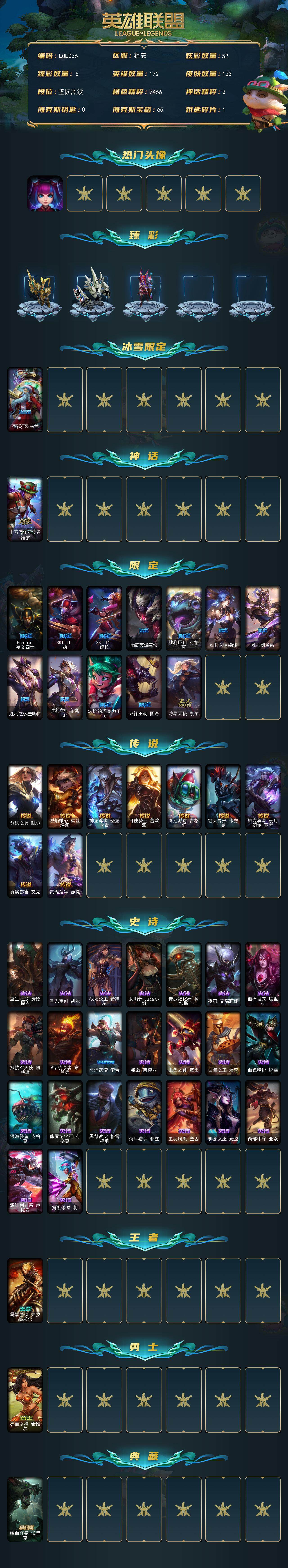 【lold36】172英雄/123皮肤/1神话/13限定/5臻彩/52炫彩/9传说/23史诗/未定级账号等级:600/银河魔装机神安妮头像/吕布奉先炫金战神/星之守护者奥莉安娜未来之光/霸天巨兽雪崩墨菲特/星之守护者霞烈羽/星之守护者阿卡丽热情之光/圣诞狂欢基兰/十五周年纪念希维尔/fnatic嘉文四世/sktt1劫/sktt1婕拉/暗裔英雄盖伦/胜利巨口克格莫/胜利女神娑娜/胜利剑圣易/胜利之运崔斯特/胜利女神菲奥娜/波比的巧克力工坊/都铎王朝图奇/防暴天使凯尔/钢铁之翼凯尔/烈焰雄心崔丝塔娜/神龙尊者圣龙李青/日蚀骑士蕾欧娜/泳池派对吉格斯/霸天异形卡兹克/神龙尊者夜月幻龙亚索/真实伤害艾克/灵魂莲华瑟提/重生之沙费德提克/圣光审判凯尔/战场公主希维尔/女船长厄运小姐/侏罗纪化石科加斯/夜刃艾瑞莉娅/血石诅咒塔里克/抵抗军天使凯特琳/v字仇杀者布兰德/防弹武僧李青/艳后奈德丽/血色之锤波比/面包之王潘森/血色精锐锐雯/深海怪鱼克格莫/侏罗纪化石克格莫/黑帮教父格雷福斯/海牛猎手菲兹/血羽凤凰奎因/驯龙女巫婕拉/西部牛仔亚索/源计划雷卢锡安/霓虹杀拳蔚/霹雳游侠弗拉基米尔/亮丽女神希维尔/嗜血狂暴沃里克/牛扒狂战奥拉夫/幽蓝梦魇加里奥/社会名流乐芙兰/魔女乐芙兰/学生会长弗拉基米尔/暗影易/无极执事易/部落精神瑞兹/黯晶战神赛恩/奥德赛希维尔/灵魂莲华提莫/荒野巨兽努努和威朗普/极地女神艾希/复仇武神贾克斯/光明骑士贾克斯/嘻哈精神基兰/冲浪高手辛吉德/黑暗女王伊芙琳/假面女皇伊芙琳/探戈灵魂伊芙琳/北风冻原图奇/铬金铠甲拉莫斯/极度深寒拉莫斯/健美教练蒙多/老兵普朗克/紫水晶意志塔里克/海贼参谋斯维因/戴一个表布里茨/三叶草墨菲特/赏金猎人卡特琳娜/烈焰古树茂凯/图腾古树茂凯/星河战队雷克顿/血石战神雷克顿/黑色玫瑰假面舞会伊莉丝/传统僧侣李青/武力全开乌迪尔/这货不是乌迪尔/万人敌潘森/破败军团潘森/失落的世界伊泽瑞尔/黑桃皇牌伊泽瑞尔/德玛西亚警官盖伦/刺客信条泰隆/荣誉使者慎/游侠法师拉克丝/欲望之主泽拉斯/怒之火炮格雷福斯/失落大陆菲兹/兔宝宝菲兹/警长沃利贝尔/坚韧不屈沃利贝尔/地狱火韦鲁斯/糖果女巫璐璐/魔域梦魇德莱文/幽魂骑士赫卡里姆/车骑之力赫卡里姆/西部魔影德莱厄斯/战斗学院杰斯/女帝黛安娜/光明哨兵黛安娜/鬼影森森婕拉/地下都市梦魇婕拉/神龙尊者玉境灵龙卡莎/断浪之刃亚索/荣誉使者阿克尚/源计划升华烬/夺命前锋卢锡安/正义之呛卢锡安/女警官蔚/西部魔影持呛女巫莎弥拉/黑暗骑士卡莉丝塔/窃魂修罗塞拉斯/星之守护者尼菈