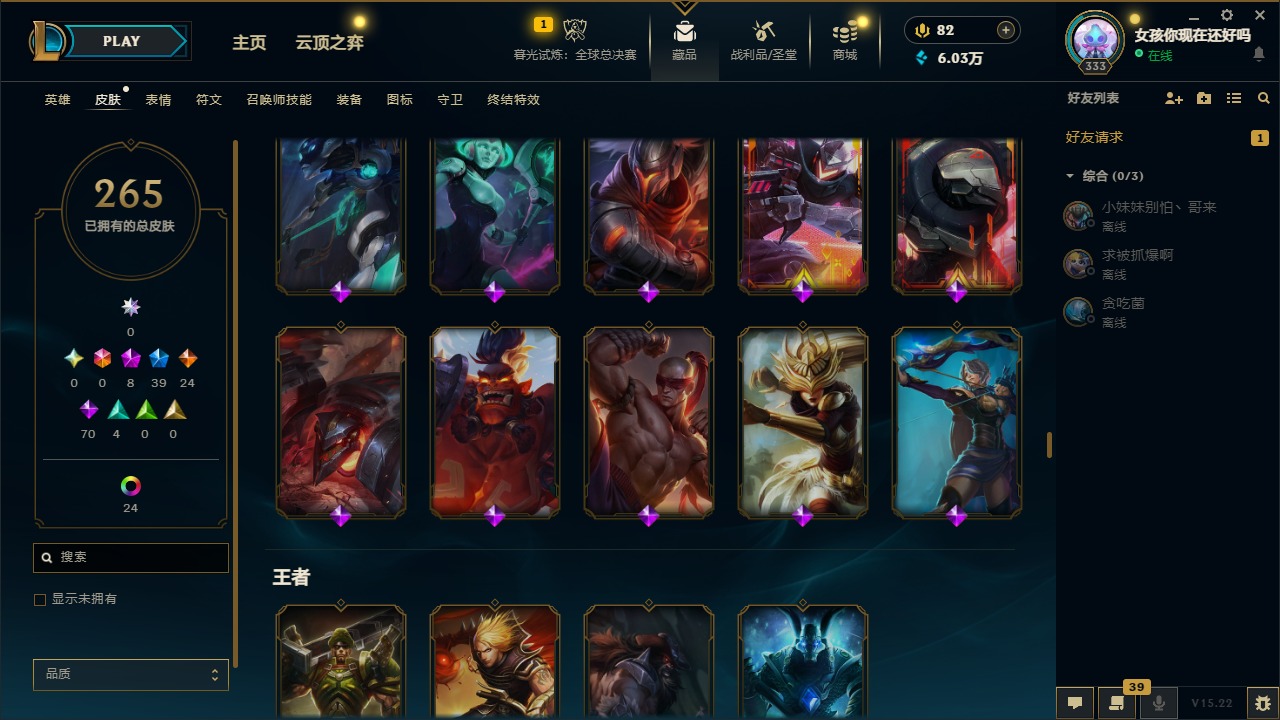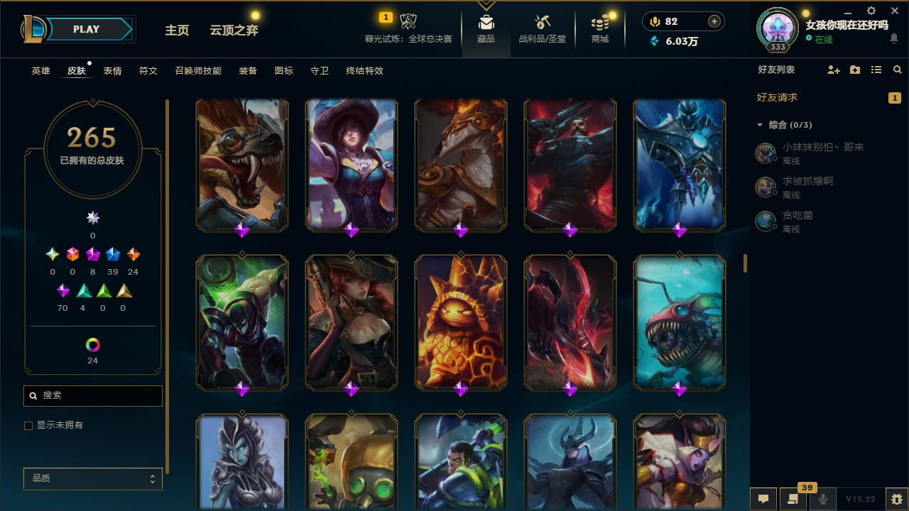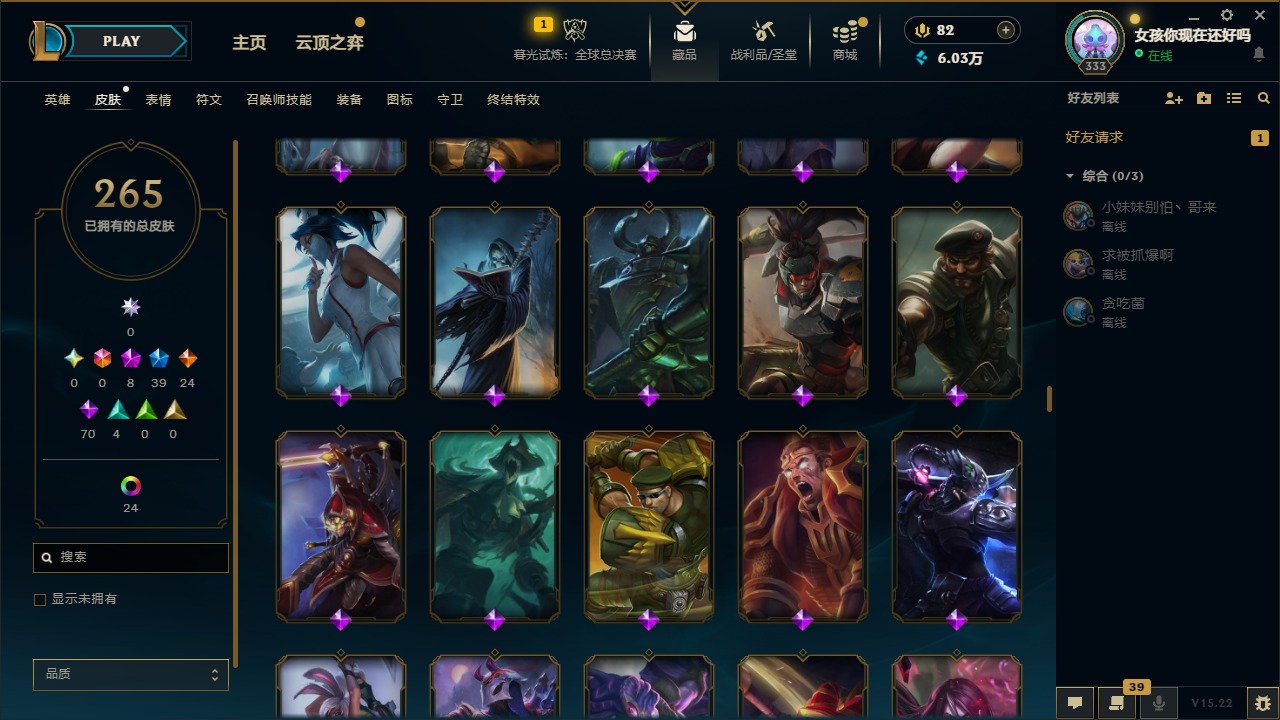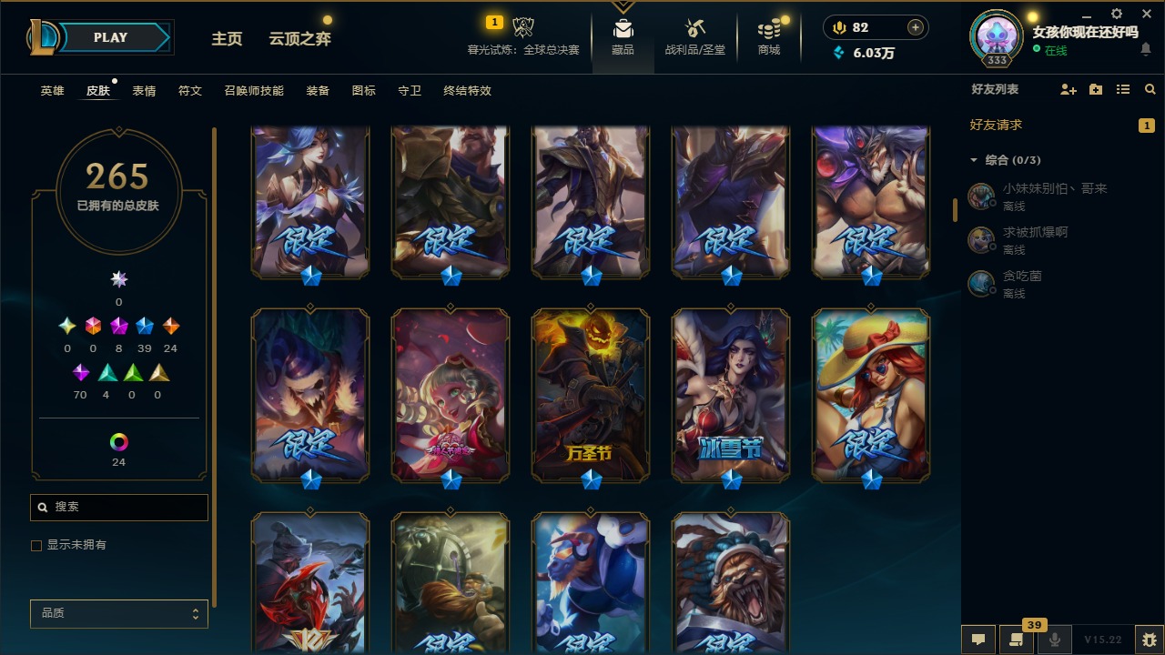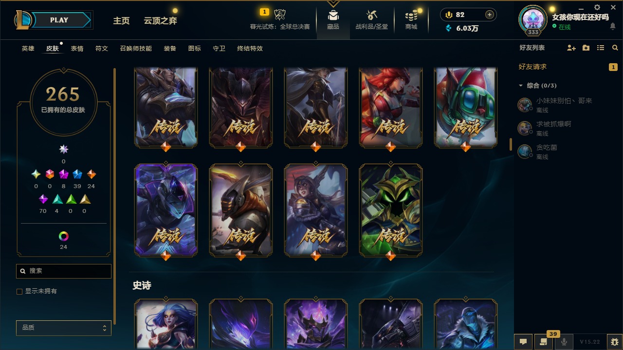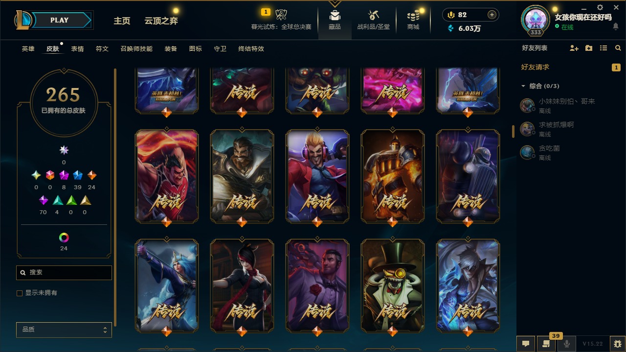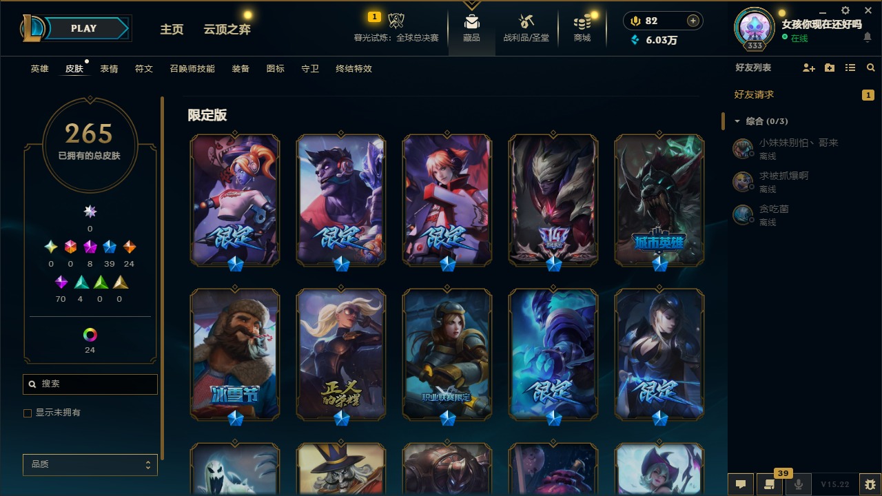 8神话 39限定 24传说 70史诗 265皮肤 34炫彩 171英雄 可二次 可修改实名 【至臻】:至臻 斗魂觉醒 派克至臻 暗星 墨菲特至臻 星之守护者 艾克至臻 星之守护者 辛德拉 【限定】:钢铁军团 拉克丝 【情人节限定】:甜心宝贝 安妮 【赛季限定皮】:胜利女神 娑娜胜利之王 泰