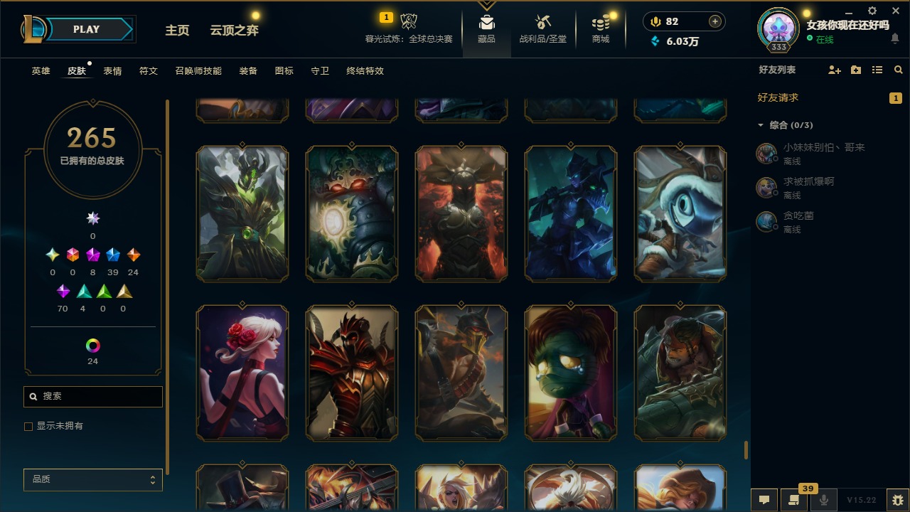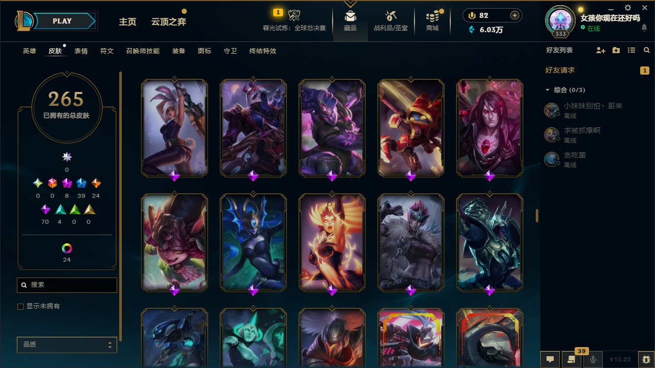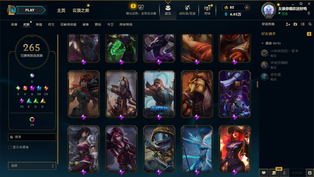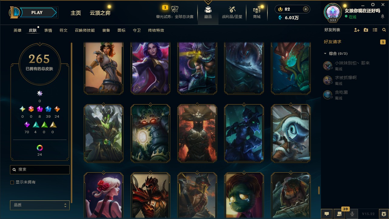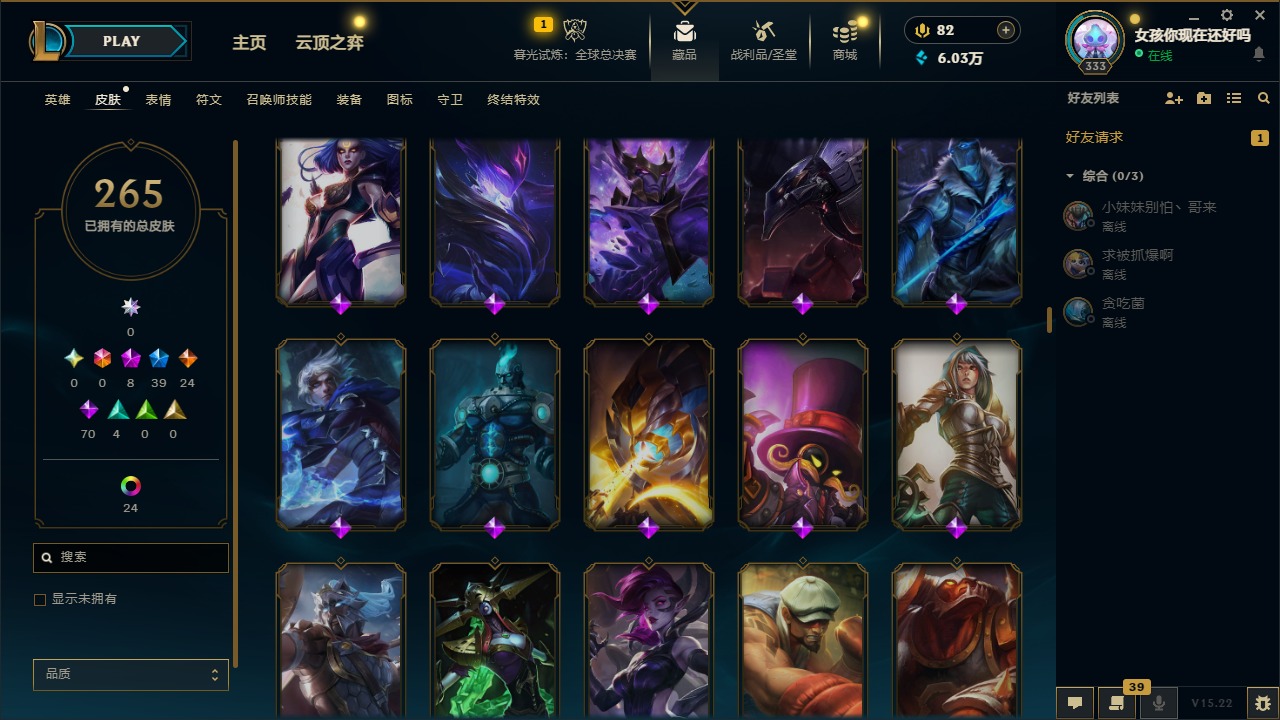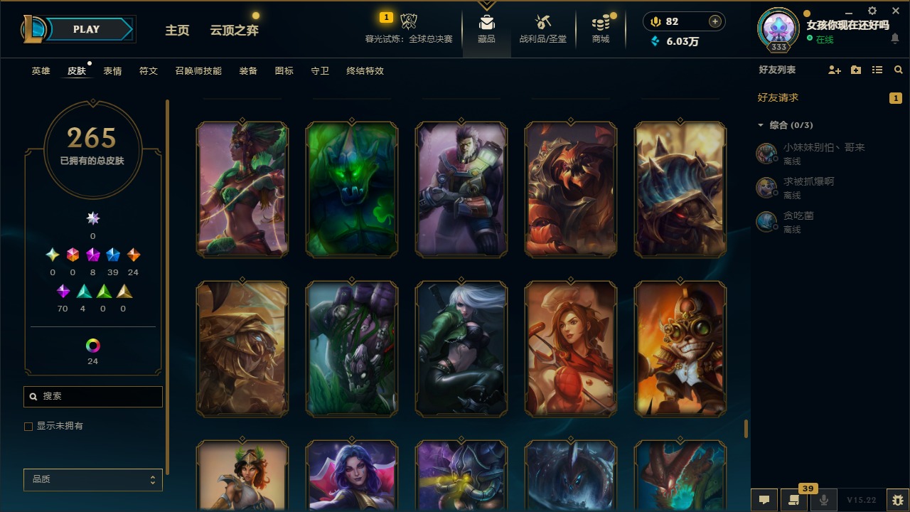 8神话 39限定 24传说 70史诗 265皮肤 34炫彩 171英雄 可二次 可修改实名 【至臻】:至臻 斗魂觉醒 派克至臻 暗星 墨菲特至臻 星之守护者 艾克至臻 星之守护者 辛德拉 【限定】:钢铁军团 拉克丝 【情人节限定】:甜心宝贝 安妮 【赛季限定皮】:胜利女神 娑娜胜利之王 泰