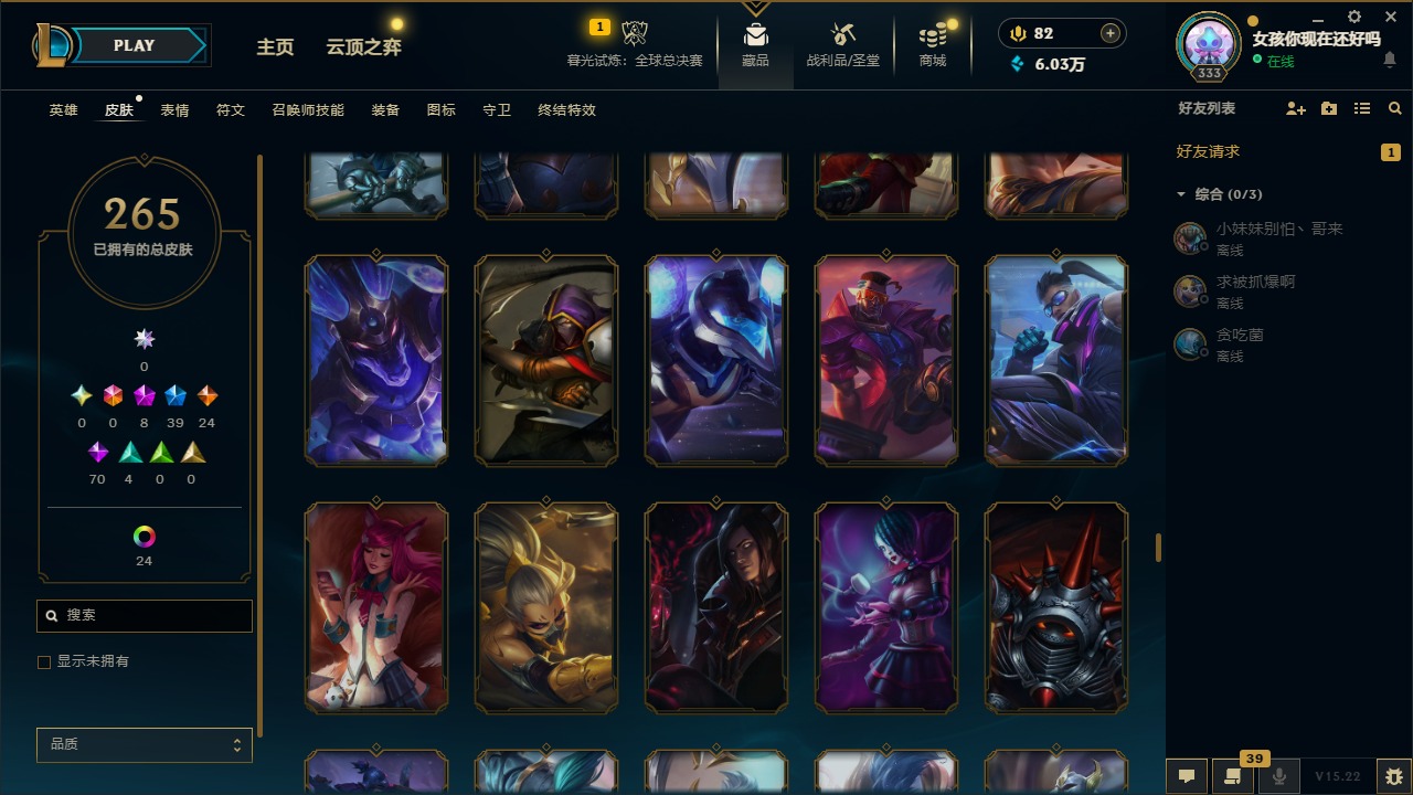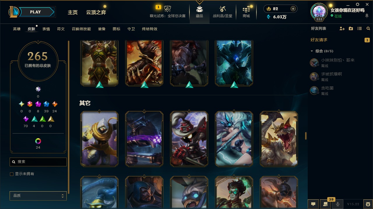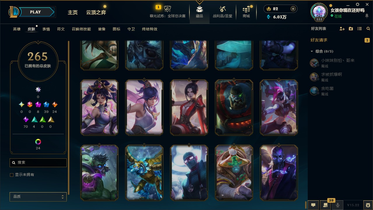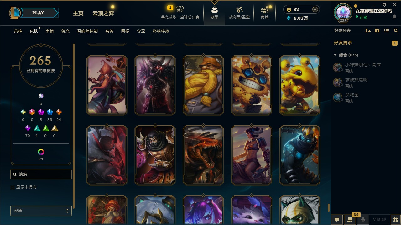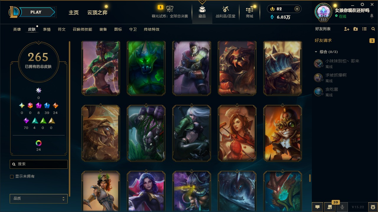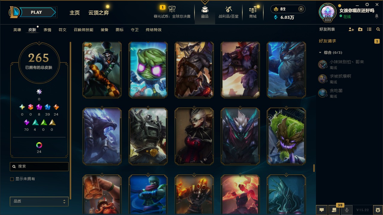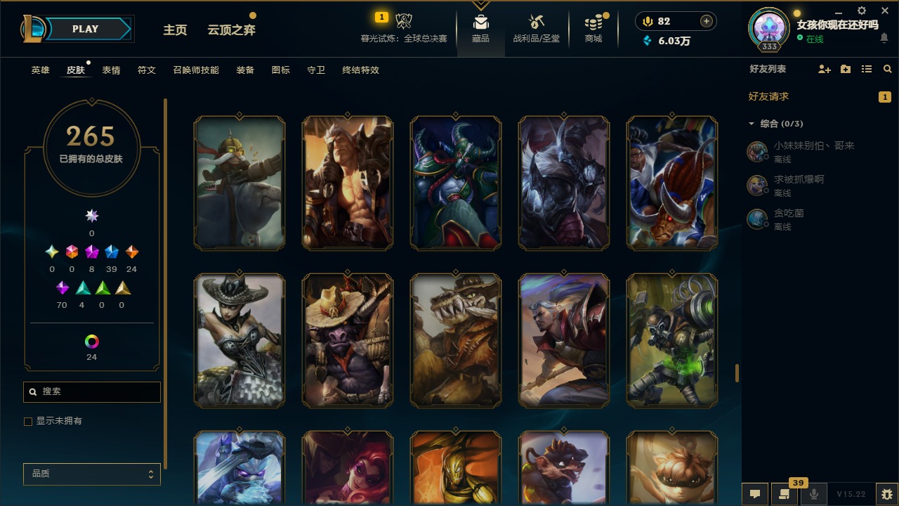 8神话 39限定 24传说 70史诗 265皮肤 34炫彩 171英雄 可二次 可修改实名 【至臻】:至臻 斗魂觉醒 派克至臻 暗星 墨菲特至臻 星之守护者 艾克至臻 星之守护者 辛德拉 【限定】:钢铁军团 拉克丝 【情人节限定】:甜心宝贝 安妮 【赛季限定皮】:胜利女神 娑娜胜利之王 泰
