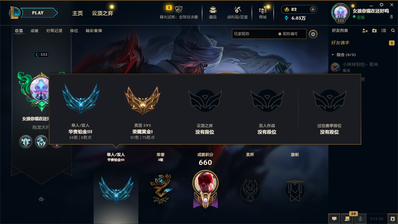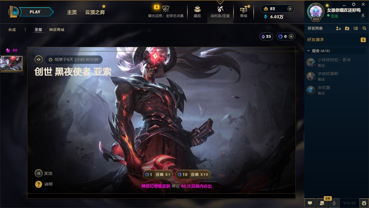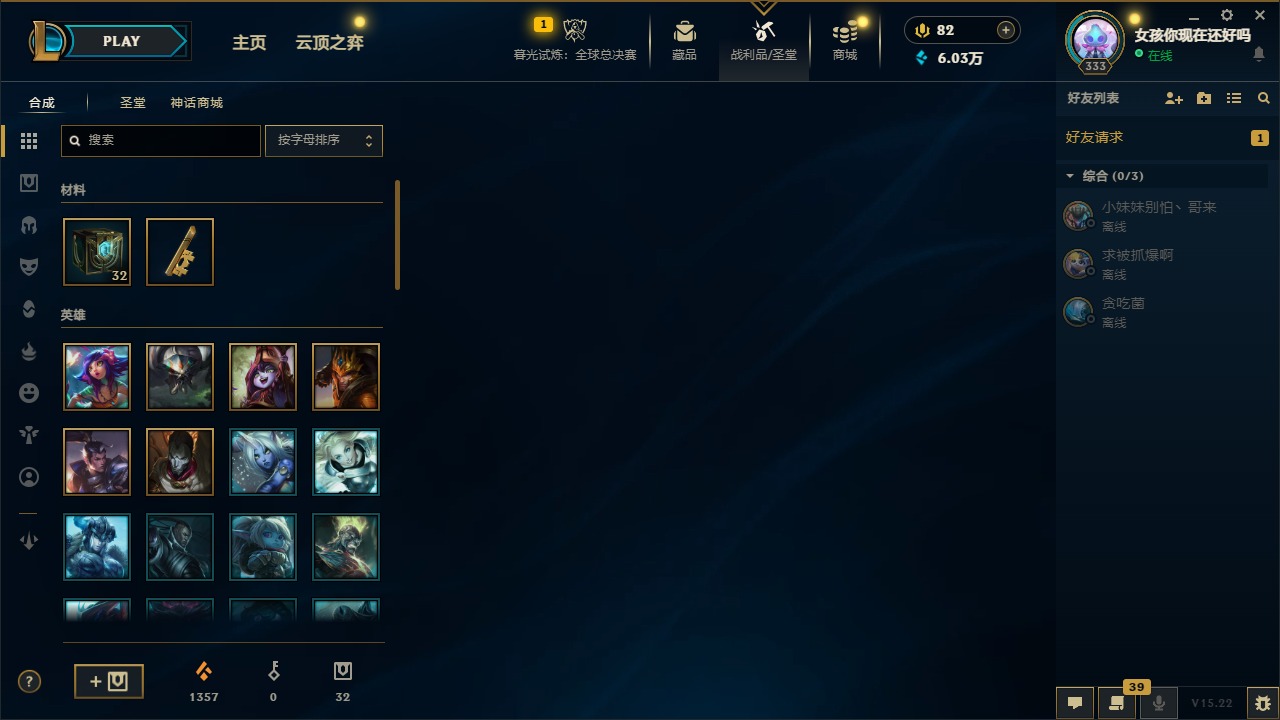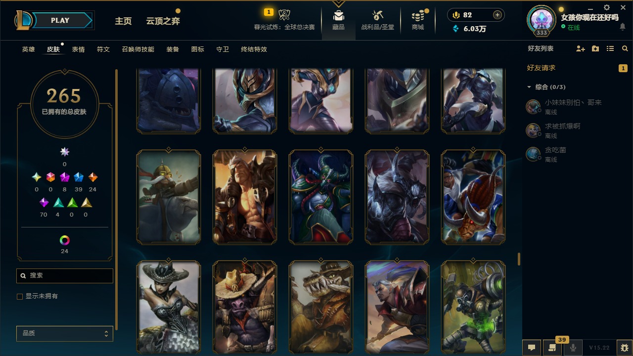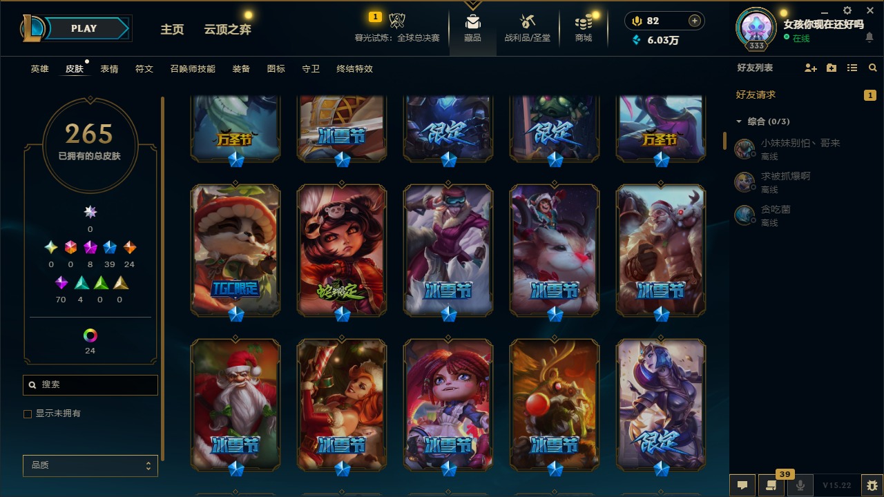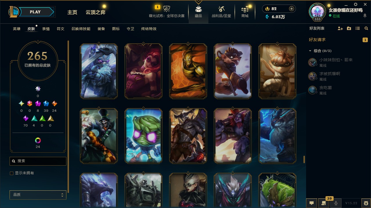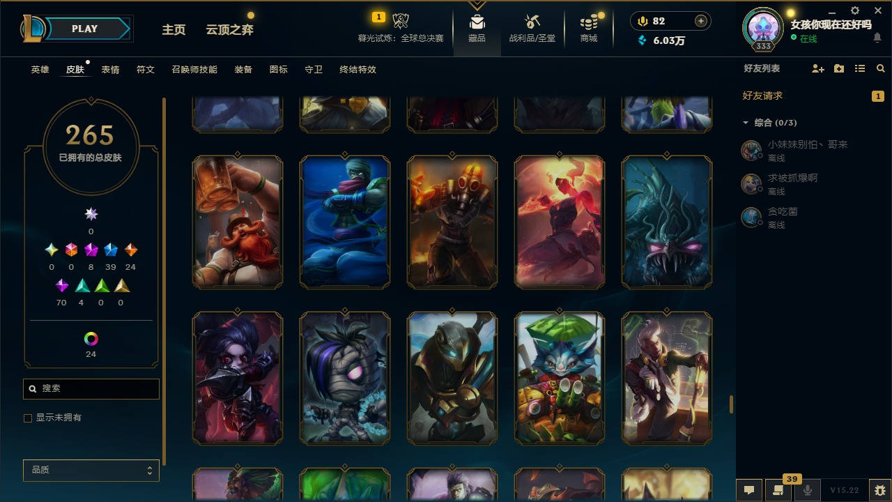 8神话 39限定 24传说 70史诗 265皮肤 34炫彩 171英雄 可二次 可修改实名 【至臻】:至臻 斗魂觉醒 派克至臻 暗星 墨菲特至臻 星之守护者 艾克至臻 星之守护者 辛德拉 【限定】:钢铁军团 拉克丝 【情人节限定】:甜心宝贝 安妮 【赛季限定皮】:胜利女神 娑娜胜利之王 泰