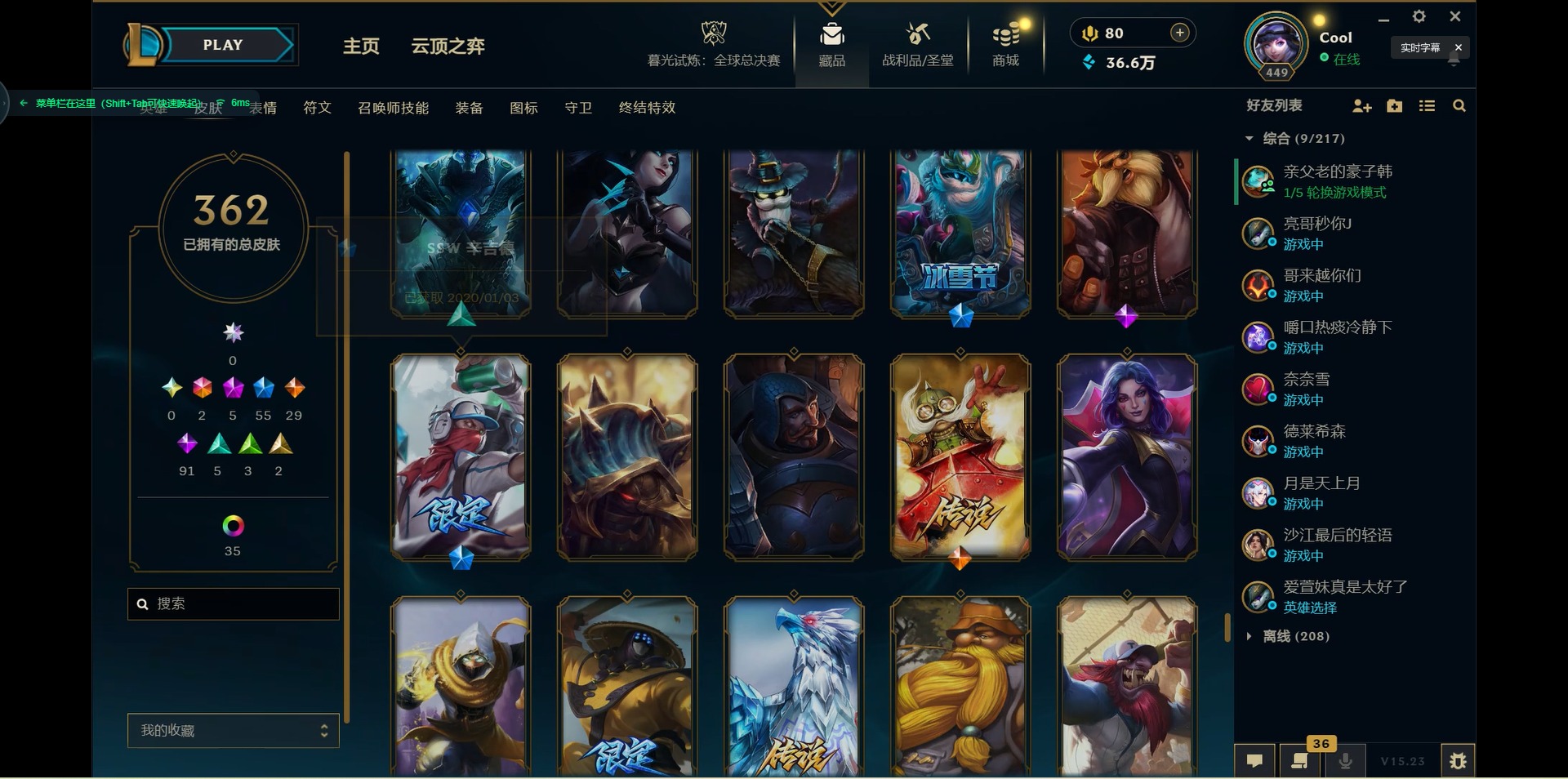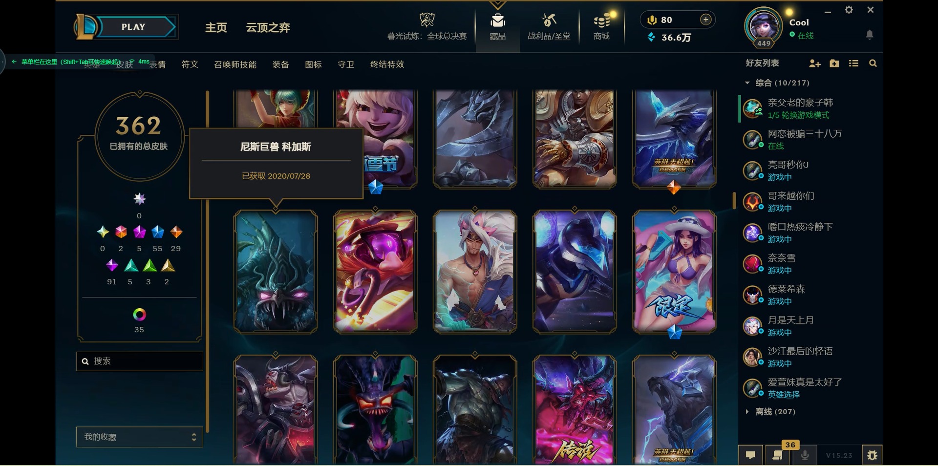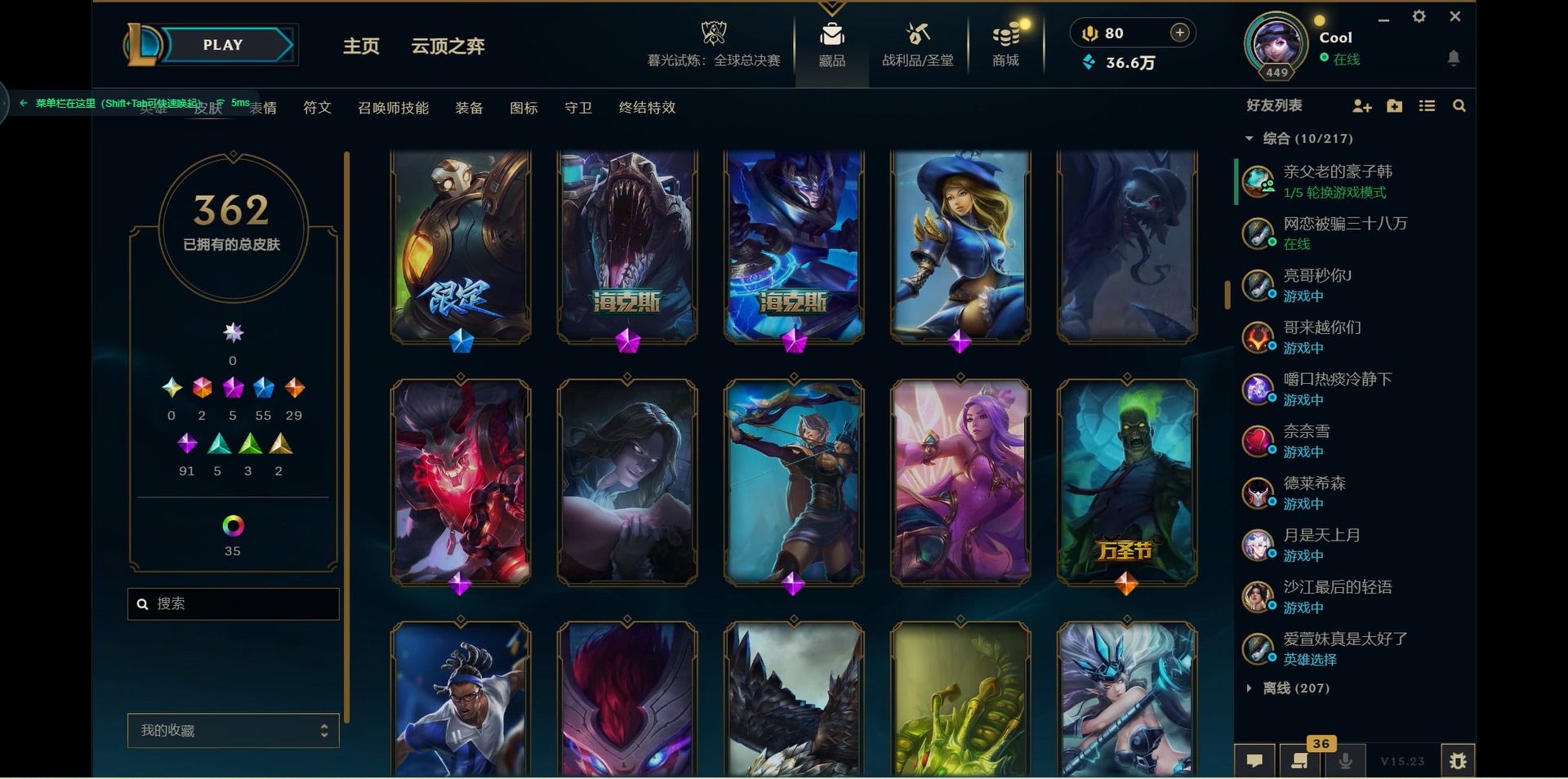 171英雄-362皮肤-[]2终极 5神话 55限定 29传说 91史诗 362皮肤 46炫彩 171英雄 可二次 可修改实名 【海克斯】:海克斯 嘉文四世海克斯 雷克顿 【赛季限定皮】:胜利女神-菲奥娜胜利之运 崔斯特胜利剑圣 易胜利女神 娑娜胜利巨口 克格莫胜利之树 茂凯胜利机器人 布里