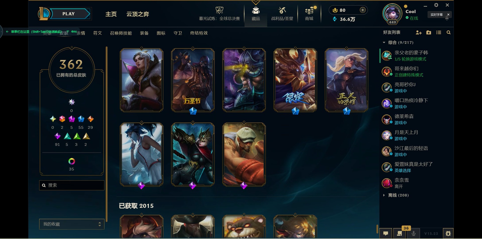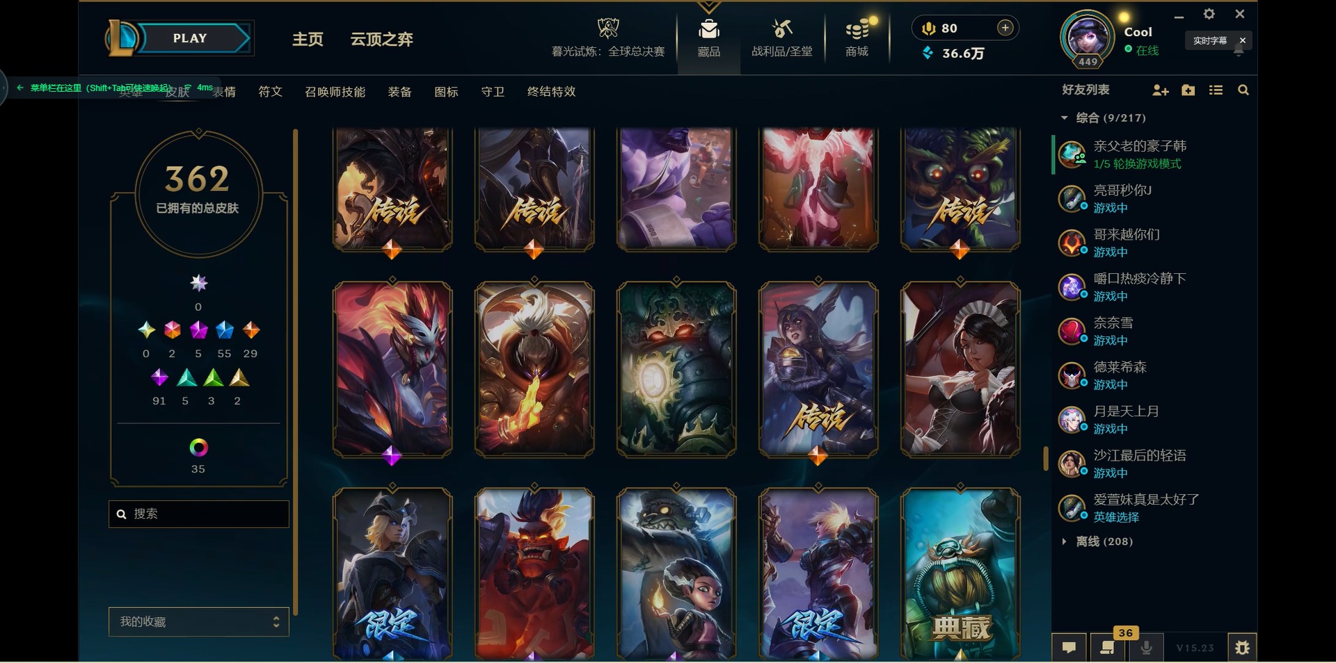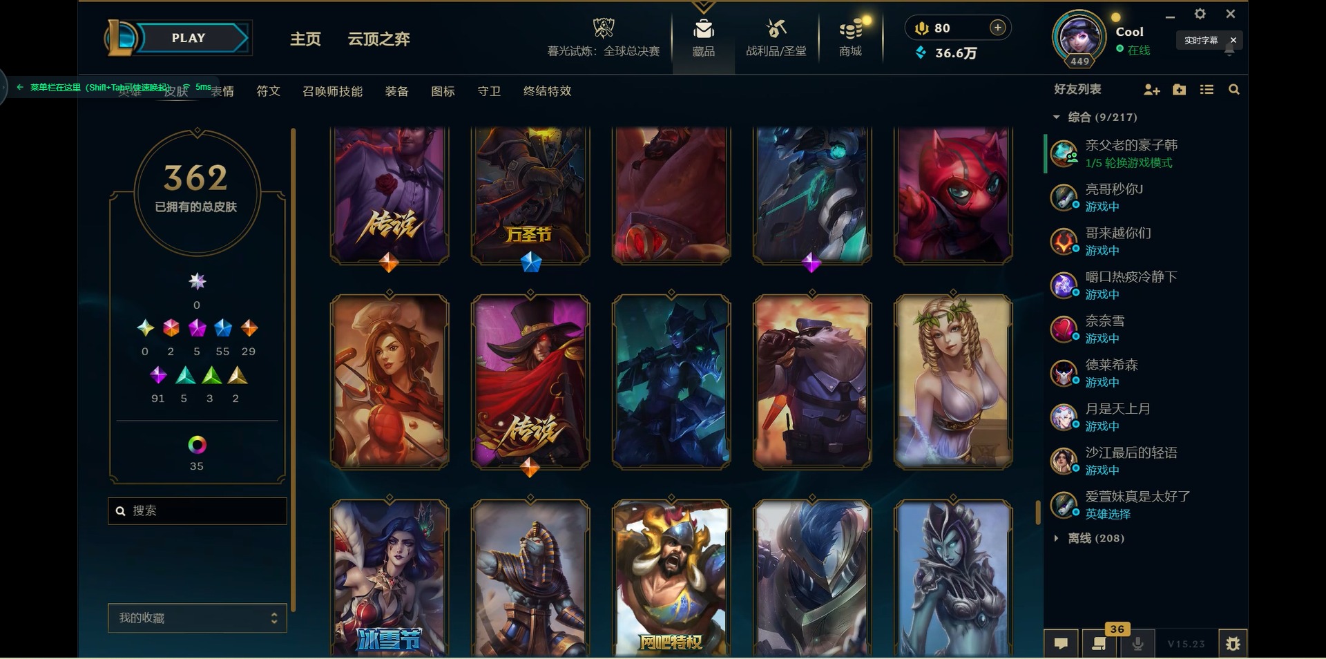 171英雄-362皮肤-[]2终极 5神话 55限定 29传说 91史诗 362皮肤 46炫彩 171英雄 可二次 可修改实名 【海克斯】:海克斯 嘉文四世海克斯 雷克顿 【赛季限定皮】:胜利女神-菲奥娜胜利之运 崔斯特胜利剑圣 易胜利女神 娑娜胜利巨口 克格莫胜利之树 茂凯胜利机器人 布里