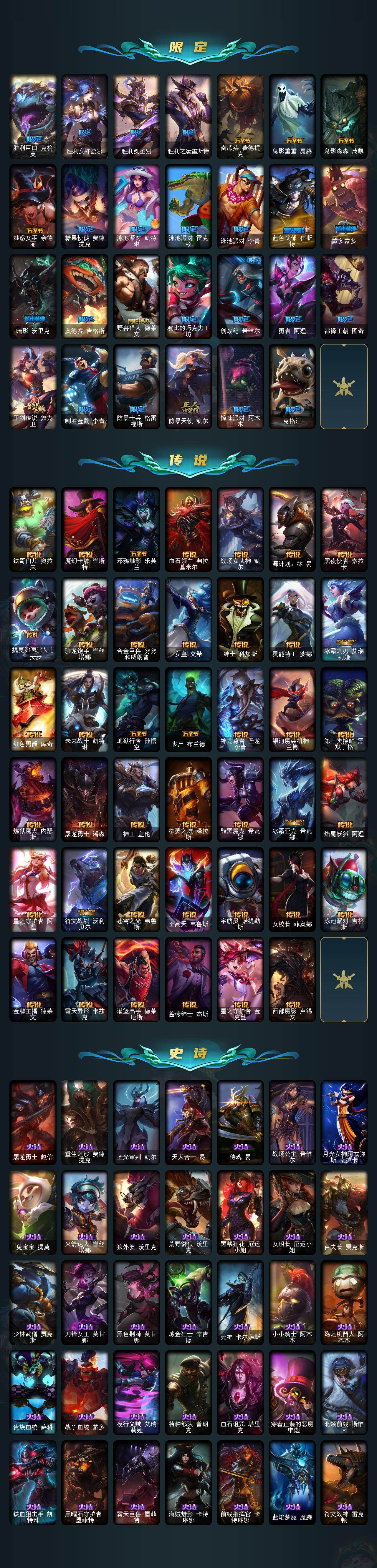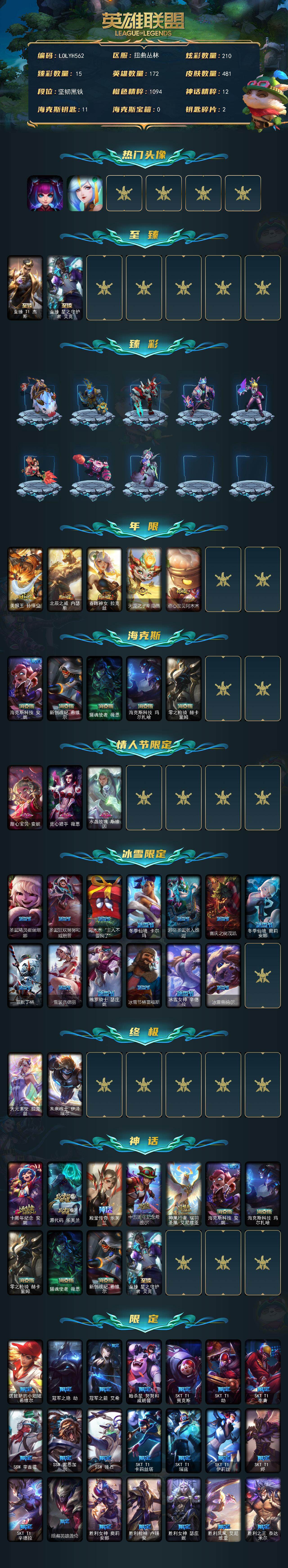 172英雄-481皮肤-【lolyh562】172英雄/481皮肤/2终极/12神话/70限定/15臻彩/210炫彩/41传说/110史诗/未定级/银河魔装机神安妮头像/春晖神女头像/至臻t1杰斯/至臻星之守护者艾克/天龙之子卡莎飞龙乘云/无畏骑士瑟庄妮赤子初心/墨之影武者亚索金墨耀影/冠军之刃锐雯2016凯旋圣装/冠军典狱长锤石凯旋圣装/霸天战士雷恩加尔星啸天火/幻灵战斗狼塞拉斯梦幻强袭/幻灵战斗兔锐雯梦幻强袭/玉