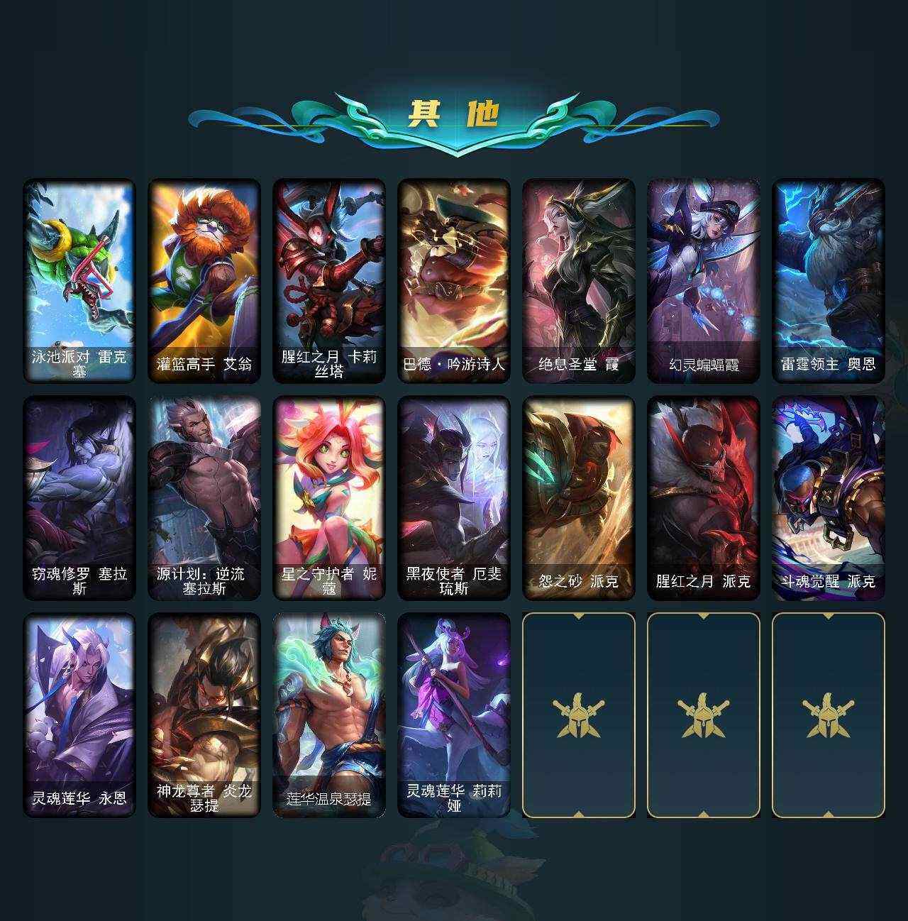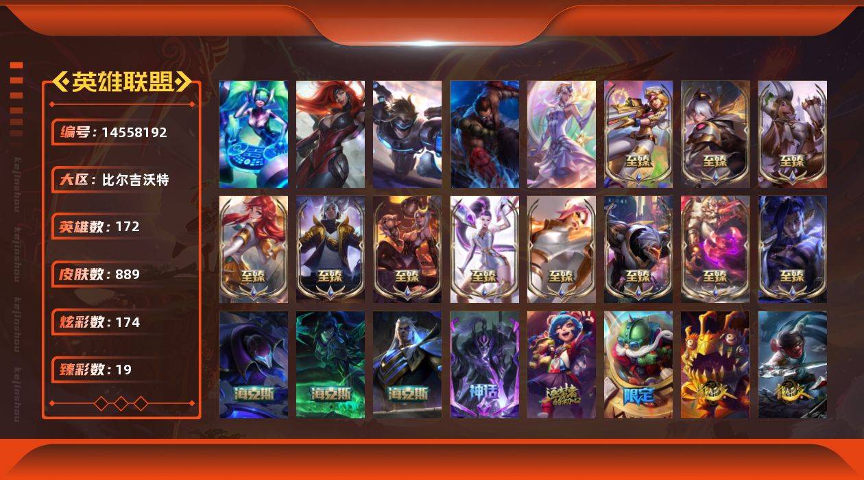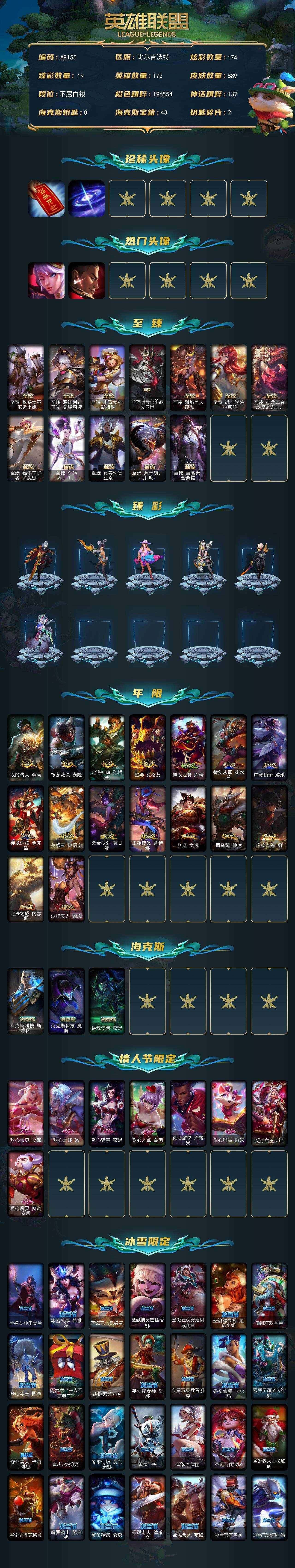 [14558192]a9391/可二次/比尔吉沃特【白银段位-172英雄-889皮肤-174炫彩-5终极-17神话-160限定-81传说-210史诗 】【至臻皮肤】:至臻魅惑女巫厄运小姐,至臻源计划正义艾瑞莉娅,至臻电玩女神凯特琳,至臻暗裔英雄嘉文四世,至臻烈焰美人薇恩,至臻战斗学院拉克丝,至臻神龙尊者均衡之龙沃利贝尔,至臻福牛守护者菲奥娜,至臻kdaallout卡莎,至臻真实伤害亚索,至臻源计划阴劫,至臻至高天奎桑提 【臻彩皮肤】:银龙裁决泰隆夜中血影,剪纸仙灵嘉文四世日进斗金,天龙之子卡莎飞龙乘云,墨之影武者亚索金墨耀影,雾雨之刃锐雯,泳池派对凯特琳粉红冰川,战斗学院卡特琳娜盛典礼服,咖啡甜心金克丝核桃巴菲,源计划火菲奥娜惩戒,魔女阿卡丽虚荣,净雪之月莫甘娜冬虹,幻灵战斗兔阿萝拉梦幻强袭,这货不是银狐库奇,霸天异形卡兹克丛林灾厄,北极星钢影卡蜜尔智慧纽带,心之钢伊泽瑞尔天纵才华 【年限皮肤】:龙的传人李青,银龙裁决泰隆,定海神珍孙悟空,醒狮克格莫,神龙之翼库奇,替父从军花木兰,广寒仙子嫦娥,神龙烈焰金克丝,美猴王孙悟空,紫金罗刹莫甘娜,玉净夜叉凯特琳,张辽文远,司马懿仲达,虎痴之拳蔚,北辰之威内瑟斯,烈焰美人薇恩 【海克斯皮肤】:海克斯科技斯维因,海克斯科技魔腾,摄魂使者薇【情人节限定】:甜心宝贝娑娜,甜心之翎洛,觅心猎手薇恩,觅心之翼奎因,觅心游侠卢锡安,觅心猫猫悠米,觅心女王艾希,觅心魔灵奥莉安娜 【冰雪限定】:幸福女神乐芙兰,冰雪风暴希维尔,圣诞开心鬼提莫,圣诞精灵崔丝塔娜,圣诞狂欢努努和威朗普,圣诞糖果棒厄运小姐,圣诞狂欢基兰,狂心冰王图奇,阿木木“主人不要我了”,胡桃夹子萨科,平安夜女神娑娜,英勇玩具兵普朗克,冬季仙境卡尔玛,邪恶圣诞老人维迦,夺命美人卡特琳娜,喜庆之树茂凯,冬季仙境奥莉安娜,雪默丁格,雪装奈德丽,圣诞玩偶波比,圣诞老人古拉加斯,圣诞驯鹿克格莫,魄罗骑士瑟庄妮,寒冬精灵璐璐,圣诞老人德莱文,圣诞老人布隆,冰雪节辛吉德,冰雪节玛尔扎哈,冰雪女神辛德拉冰雪兽纳尔 终极皮肤】:大元素使拉克丝,dj娑娜,灵魂守卫乌迪尔,未来战士伊泽瑞尔,武装战姬厄运小姐 【神话皮肤】:十周年纪念安妮,灰烬征服者潘森,海克斯科技魔腾,海克斯科技斯维因,摄魂使者薇恩,至臻真实伤害亚索,至臻至高天奎桑提,至臻电玩女神凯特琳,至臻福牛守护者菲奥娜,至臻kdaallout卡莎,至臻烈焰美