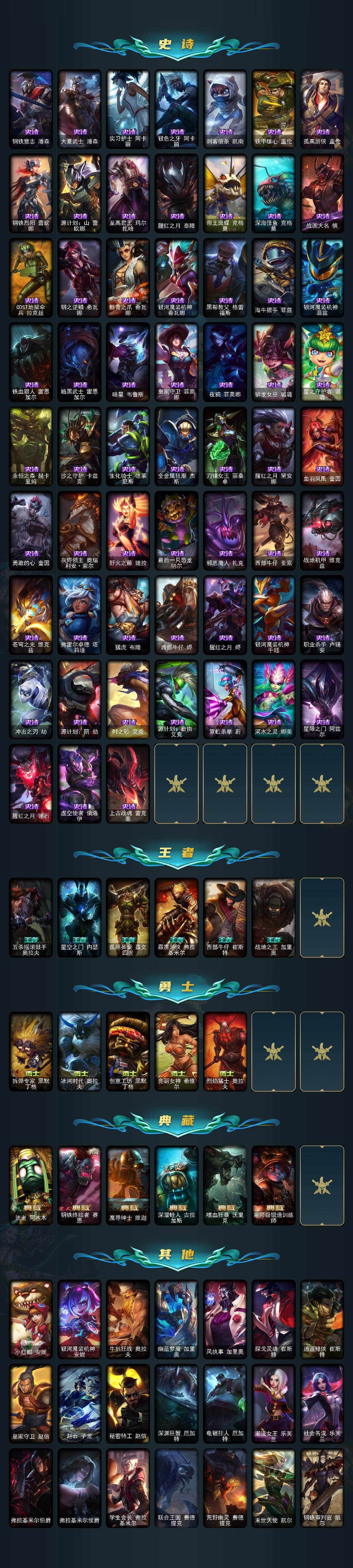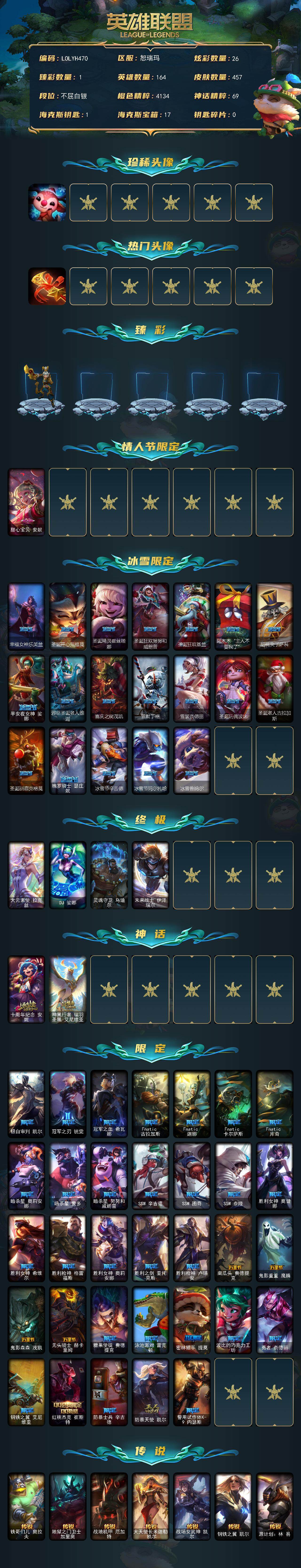 164英雄-457皮肤-【lolyh470】164英雄/457皮肤/4终极/2神话/53限定/1臻彩/26炫彩/43传说/122史诗/白银账号等级:310/至爱的鹿头像/卡特琳娜的匕首头像/替父从军花木兰炫金龙刃/甜心宝贝安妮/幸福女神乐芙兰/圣诞开心鬼提莫/圣诞精灵崔丝塔娜/圣诞狂欢努努/圣诞狂欢基兰/“主人不要我了”阿木木/胡桃夹子小丑/平安夜女神琴女/邪恶圣诞老人维迦/喜庆之树茂凯/雪默丁格/雪装豹女/圣诞玩偶