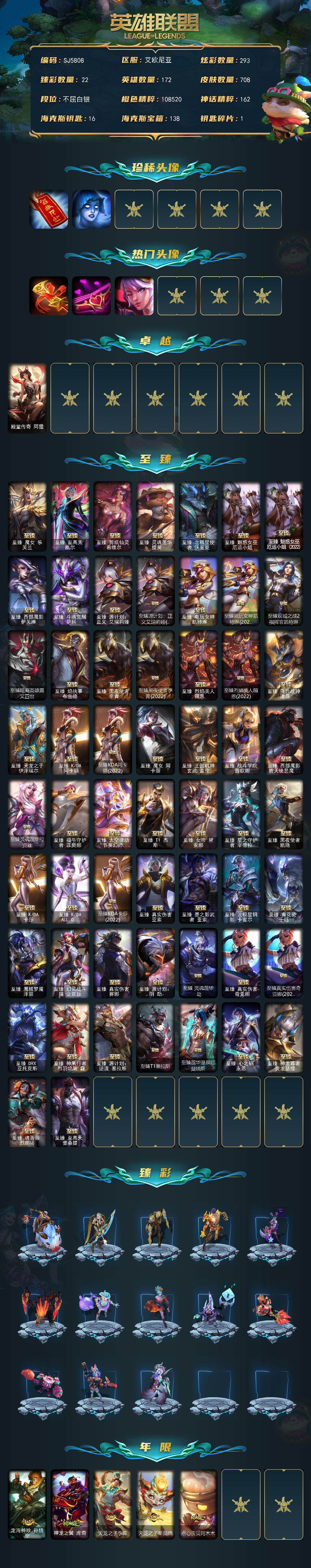 172英雄-708皮肤-【sj5808】172英雄/708皮肤/2终极/74神话/99限定/22臻彩/293炫彩/66传说/137史诗/白银账号等级:772/红包头像/女巫头头像/卡特琳娜的匕首头像/爱情之歌头像/觅心之翼奎因头像/殿堂传奇阿狸/至臻 魔女 妖姬/至臻至高天凯尔/至臻 剪纸仙灵 希维尔/至臻 灵魂莲华 提莫/至臻北极星使者沃里克/至臻魅惑女巫女呛/至臻魅惑女巫 2022女呛/至臻西部魔影伊芙琳/至