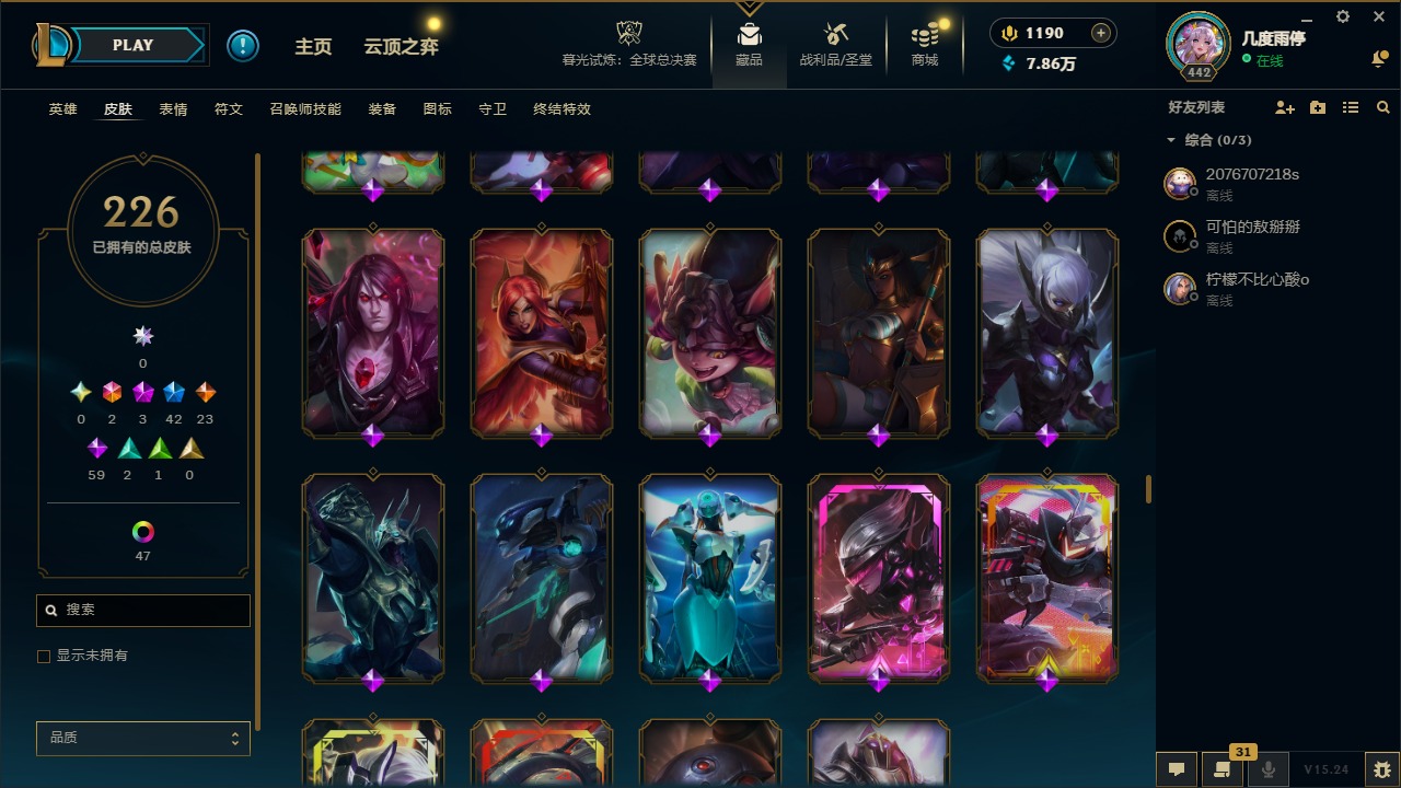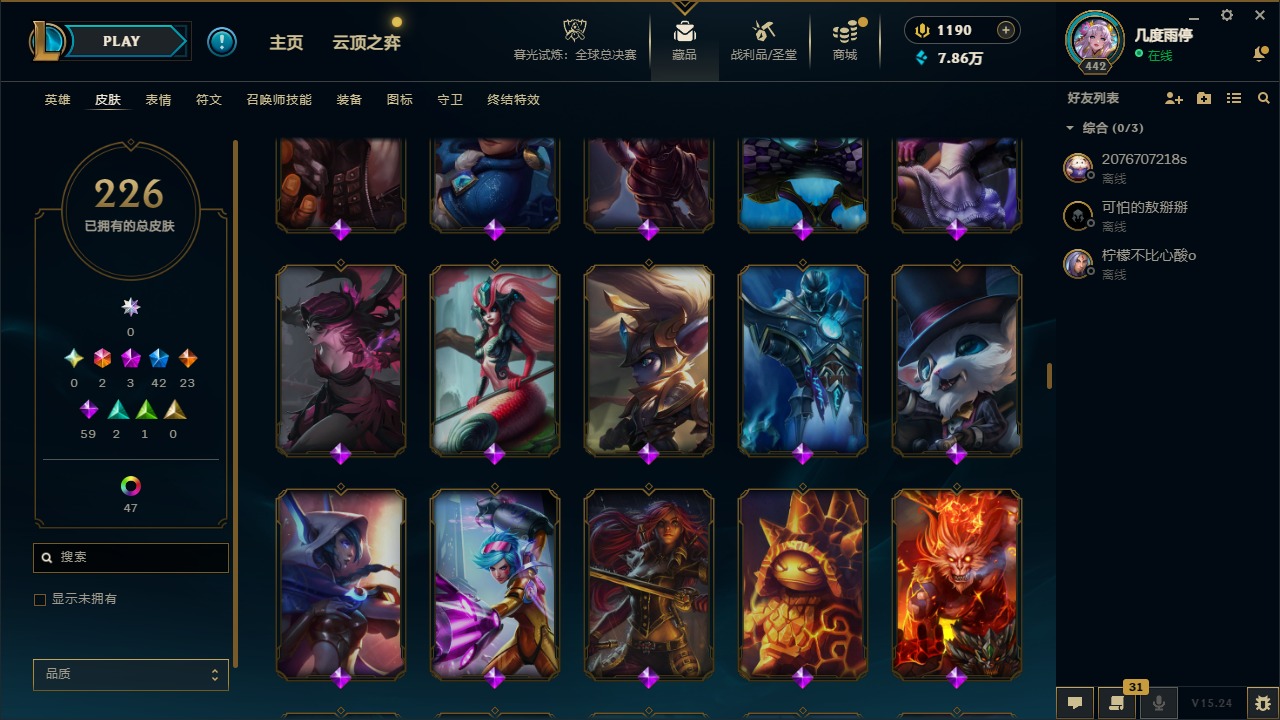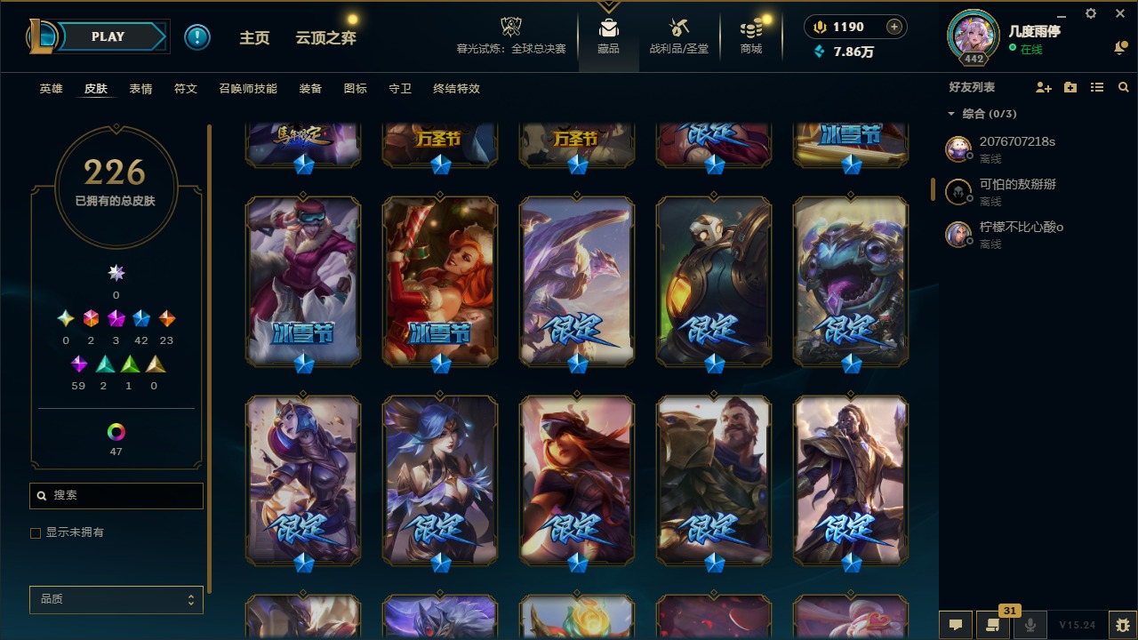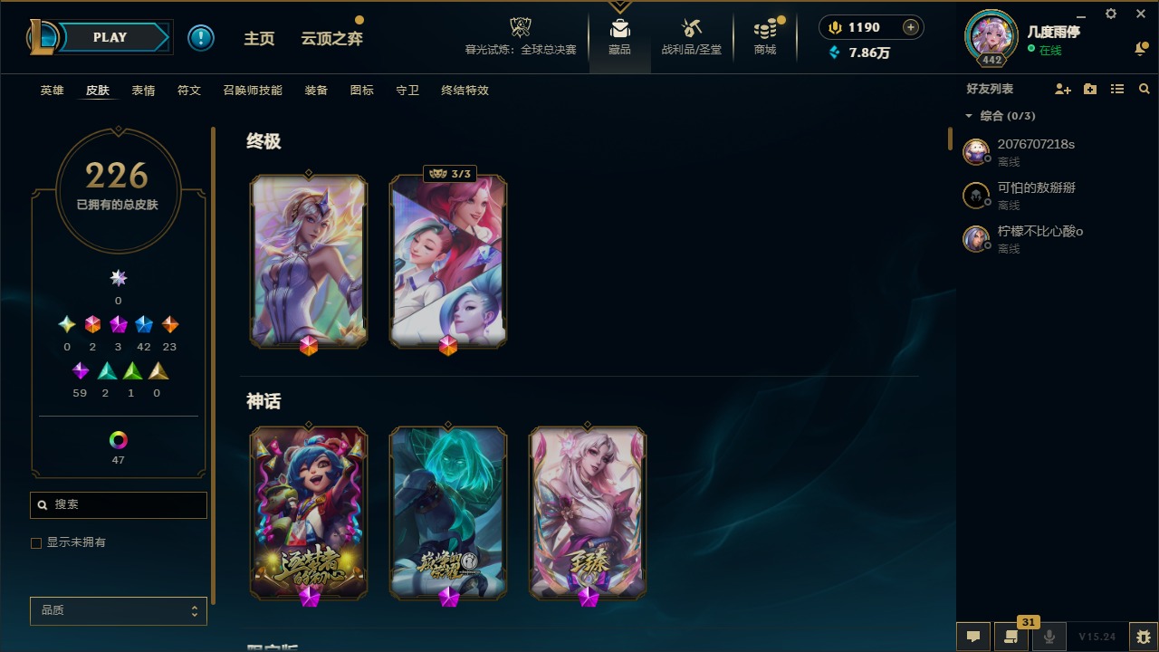 170英雄-226皮肤-2终极 3神话 42限定 23传说 59史诗 226皮肤 70炫彩 170英雄 可二次 可修改实名 【至臻】:至臻 灵魂莲华 拉克丝 【情人节限定】:甜心宝贝 安妮甜心宝贝 娑娜 【赛季限定皮】:胜利凤凰 艾尼维亚胜利女神 娑娜胜利巨口 克格莫胜利之王 泰达米尔胜利女