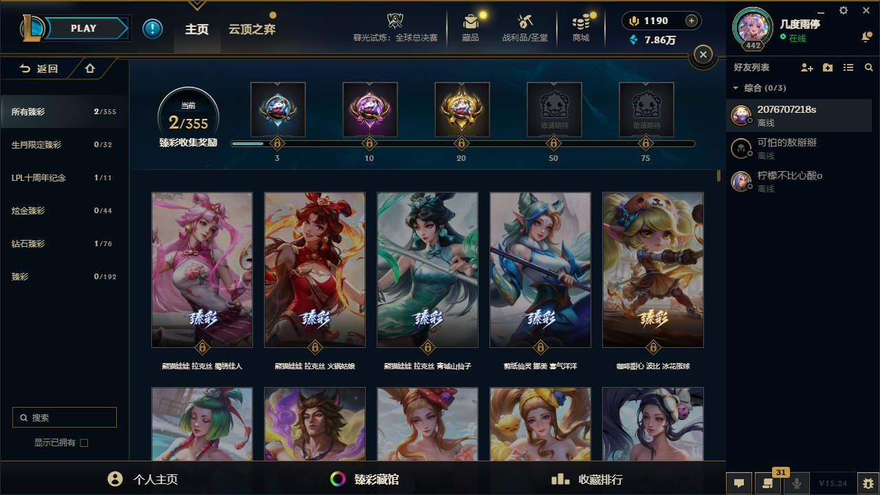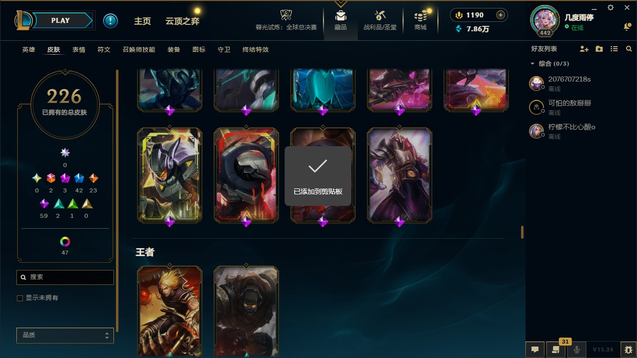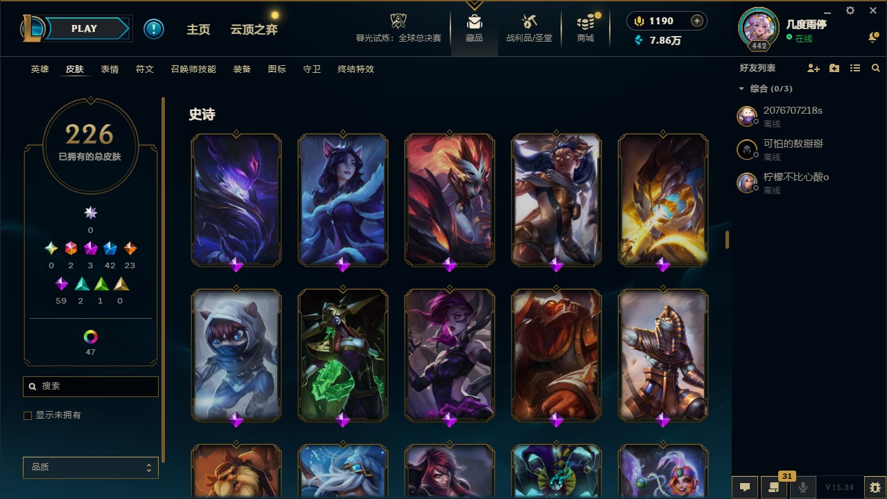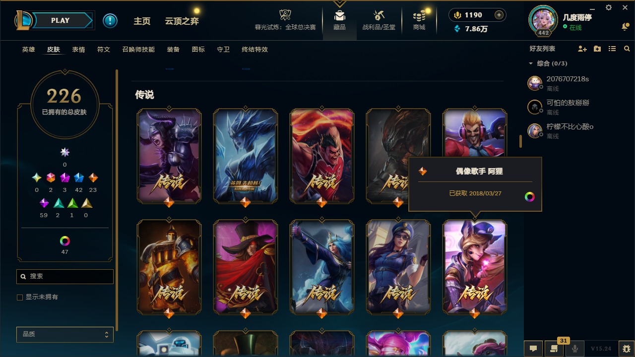 170英雄-226皮肤-2终极 3神话 42限定 23传说 59史诗 226皮肤 70炫彩 170英雄 可二次 可修改实名 【至臻】:至臻 灵魂莲华 拉克丝 【情人节限定】:甜心宝贝 安妮甜心宝贝 娑娜 【赛季限定皮】:胜利凤凰 艾尼维亚胜利女神 娑娜胜利巨口 克格莫胜利之王 泰达米尔胜利女