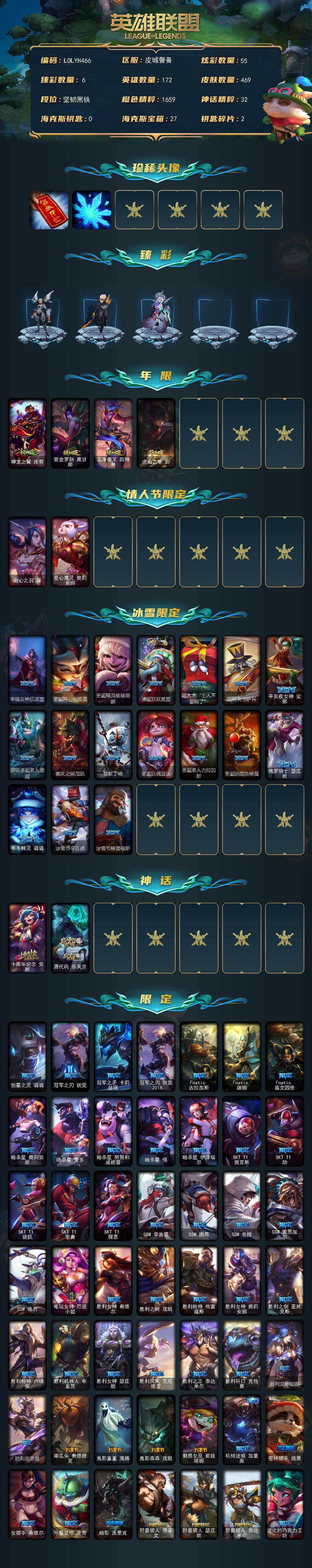 【lolyh466】172英雄/469皮肤/2神话/79限定/6臻彩/55炫彩/33传说/117史诗/未定级/红包头像/雪花头像/天龙之子 卡莎 飞龙乘云/墨之影武者 亚索 金墨耀影/弹幕天使卡莎炽天使公正/源计划火菲奥娜惩戒/魔女 阿卡丽 虚荣/净雪之月莫甘娜冬虹/神龙之翼库奇/猴年莫甘娜/猴年凯特琳/鸡年蔚/甜心之羽霞/觅心魔灵奥利安娜/幸福女神乐芙兰/圣诞开心鬼提莫/圣诞精灵崔丝塔娜/圣