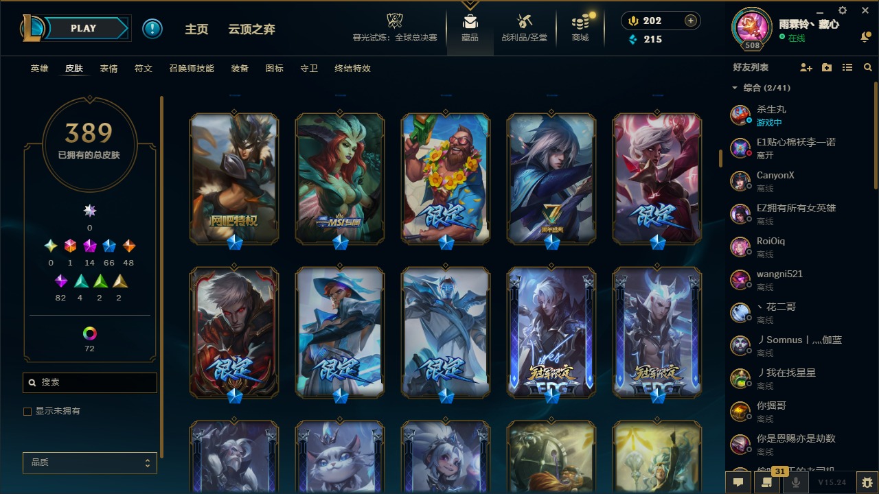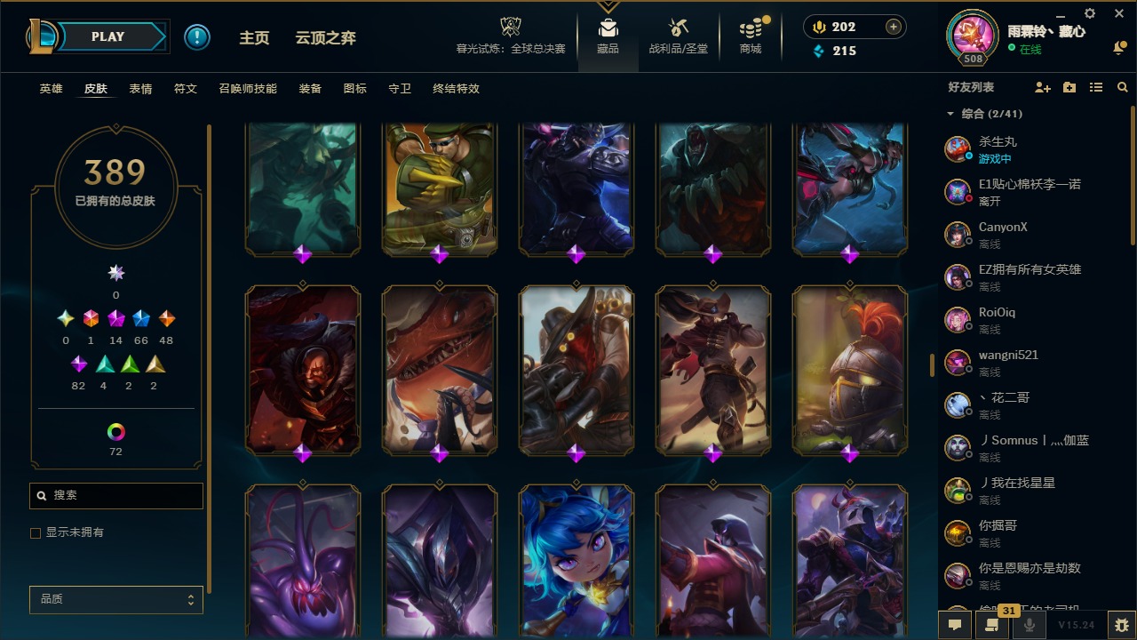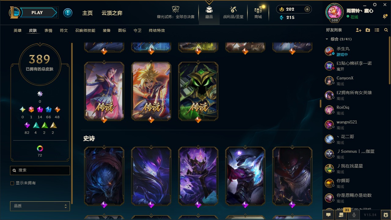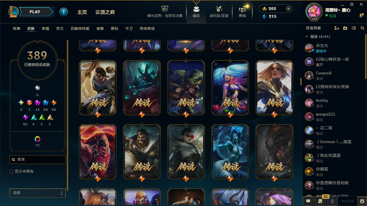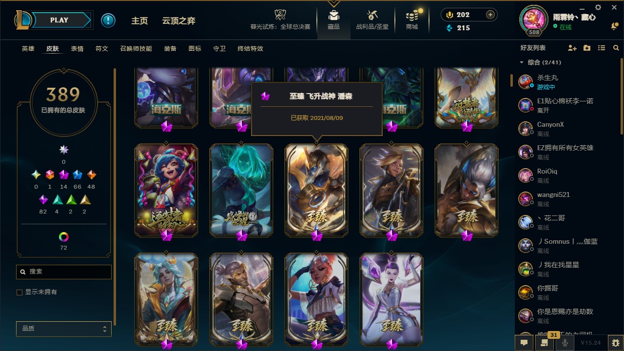 1终极 14神话 66限定 48传说 82史诗 389皮肤 77炫彩 169英雄 可二次 可修改实名 【至臻】:至臻 天龙之子 伊泽瑞尔至臻 真实伤害 奇亚娜至臻 神龙尊者 炎龙瑟提至臻 灵能特工 伊泽瑞尔至臻 k/da all out卡莎至臻 源计划:逆流 塞拉斯至臻 飞升战神 潘森