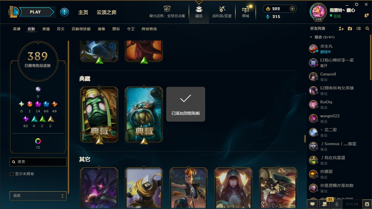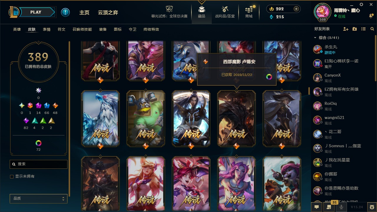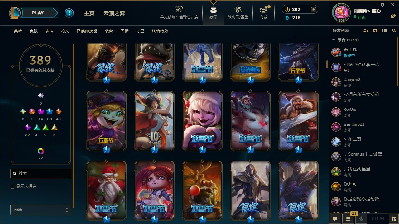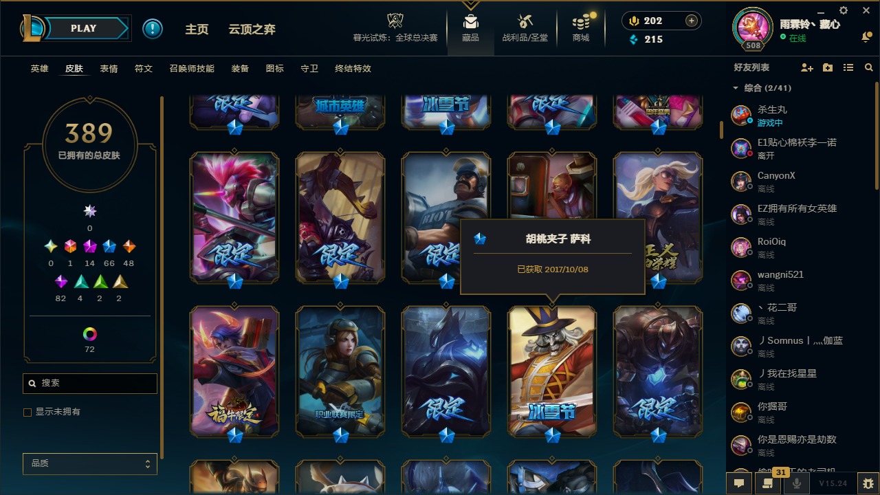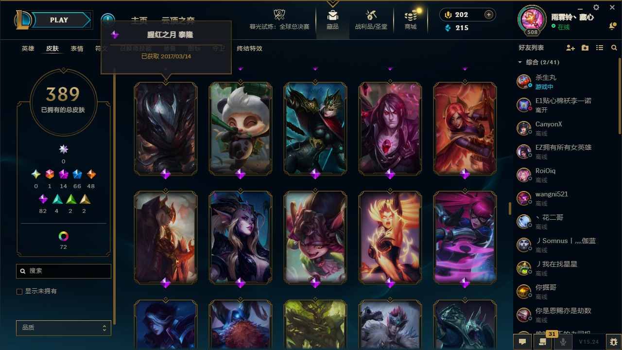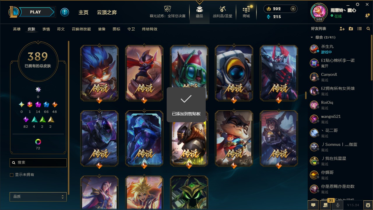 1终极 14神话 66限定 48传说 82史诗 389皮肤 77炫彩 169英雄 可二次 可修改实名 【至臻】:至臻 天龙之子 伊泽瑞尔至臻 真实伤害 奇亚娜至臻 神龙尊者 炎龙瑟提至臻 灵能特工 伊泽瑞尔至臻 k/da all out卡莎至臻 源计划:逆流 塞拉斯至臻 飞升战神 潘森