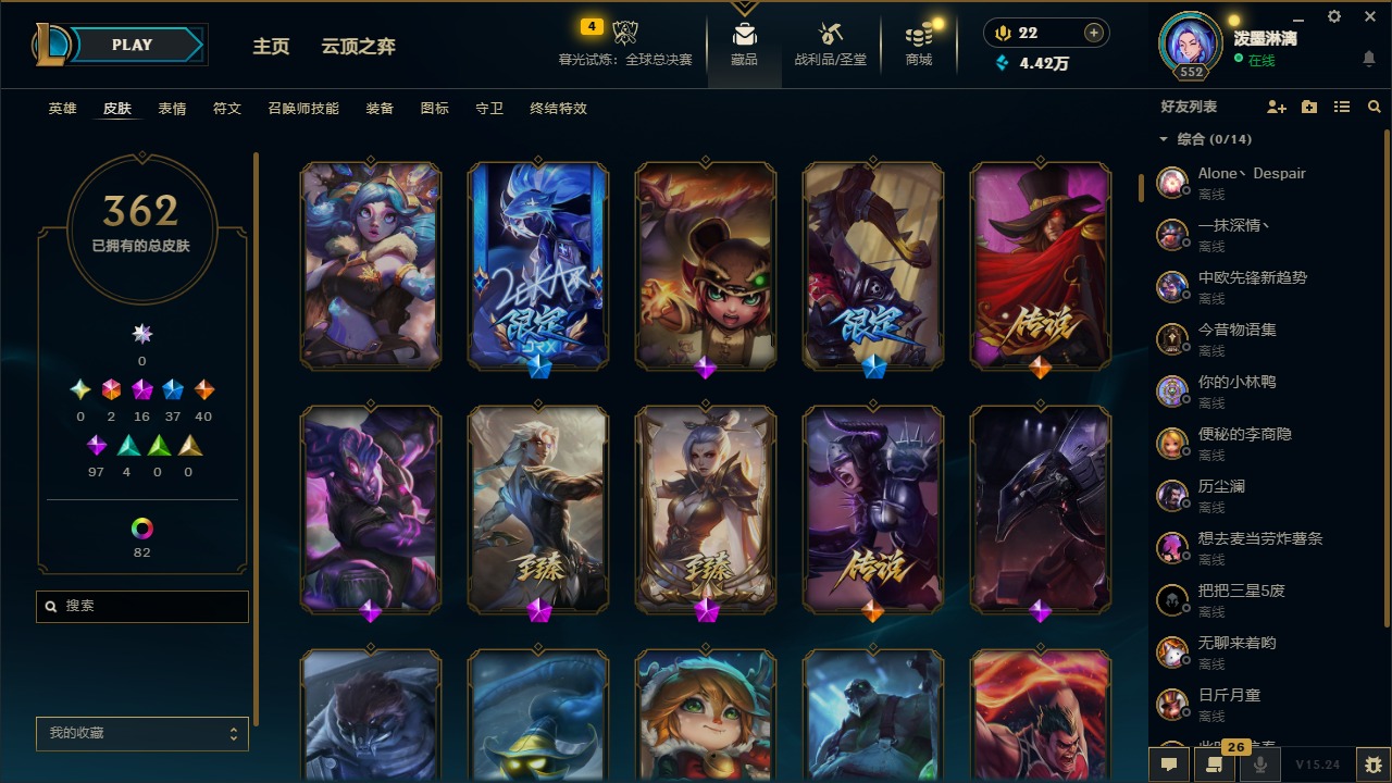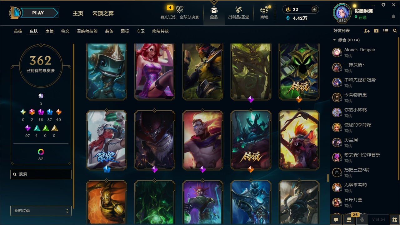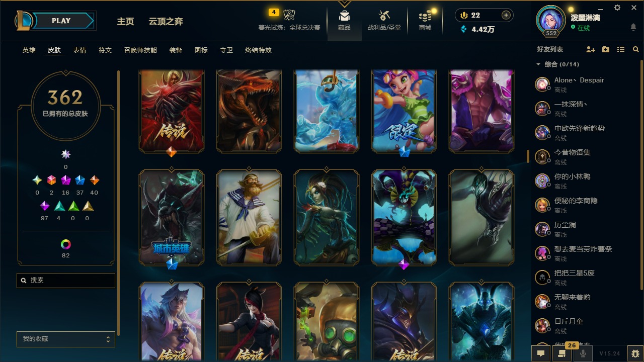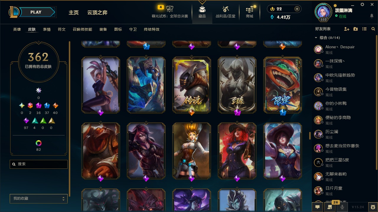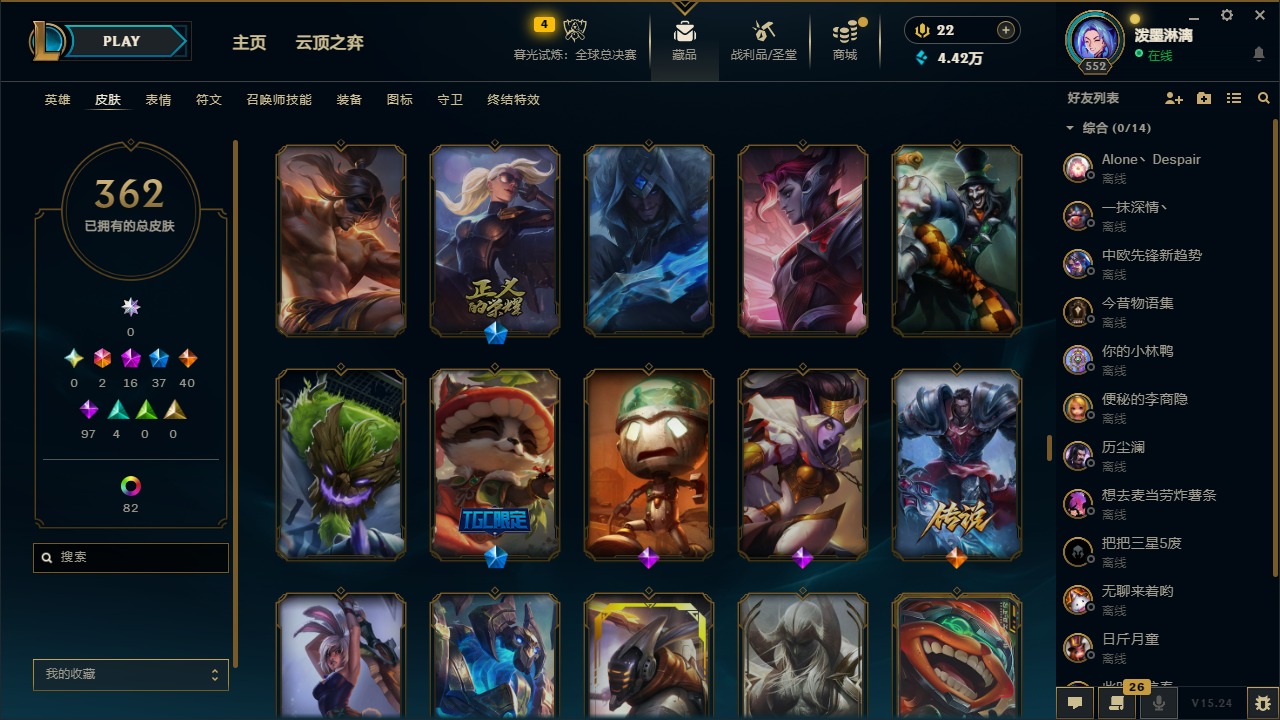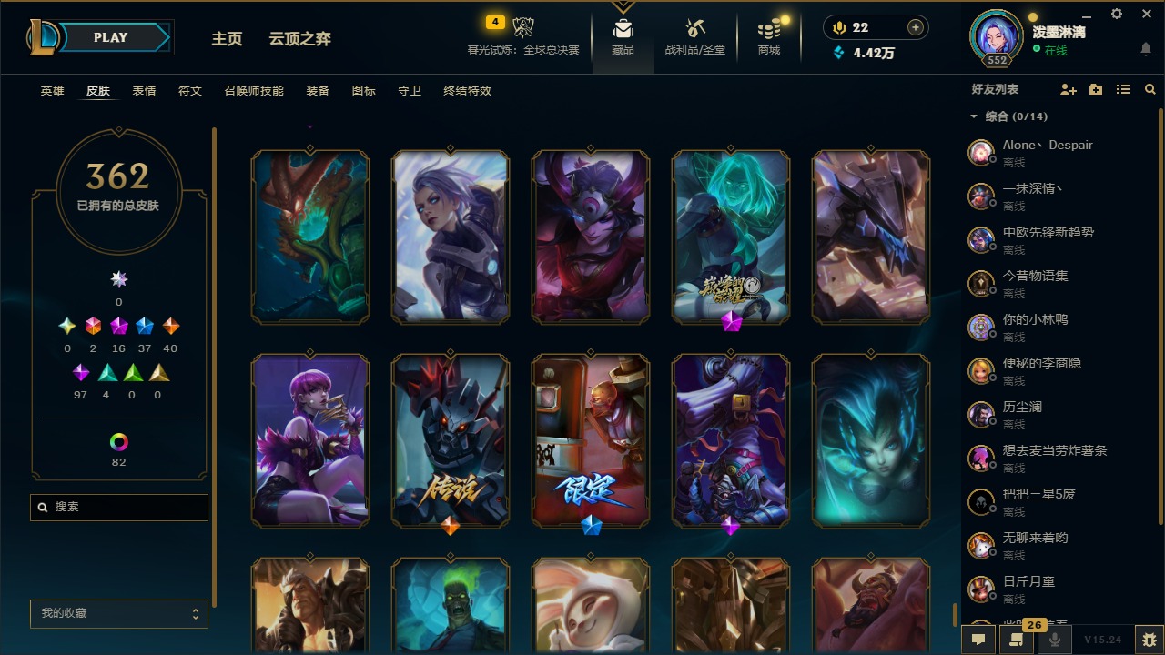 2终极 16神话 37限定 40传说 97史诗 362皮肤 97炫彩 172英雄 可二次 可修改实名 【至臻】:至臻 腥红之月 亚托克斯2022至臻 绒毛 菲兹2022至臻 玉剑传说 武剑仙2022至臻 腥红之月 亚托克斯至臻 绒毛菲兹至臻 玉剑传说 武剑仙至臻 真实伤害