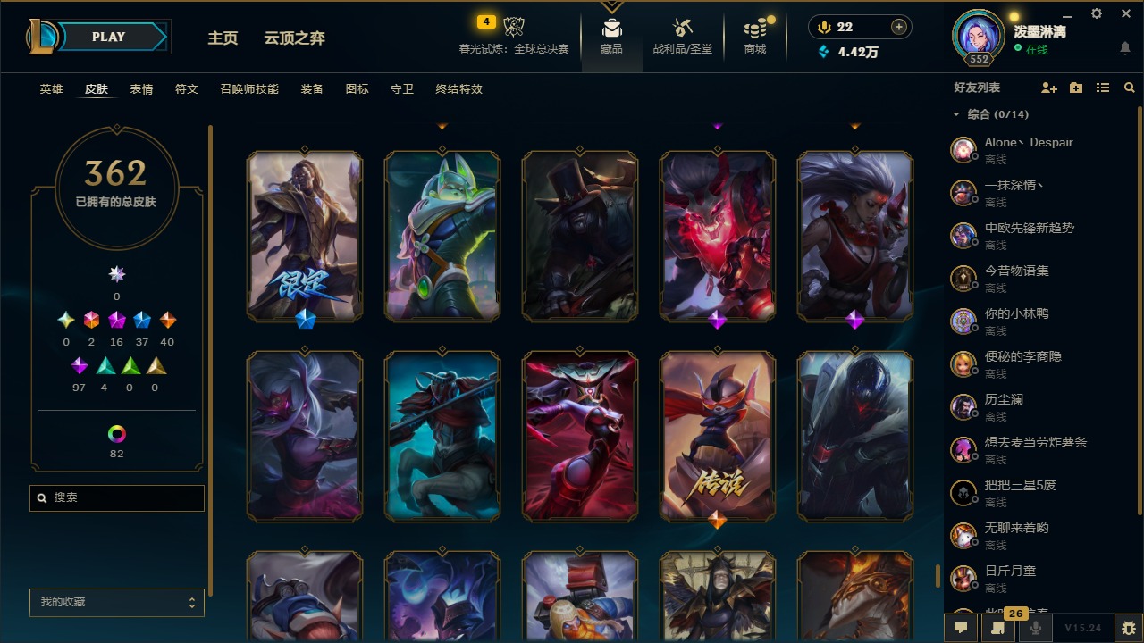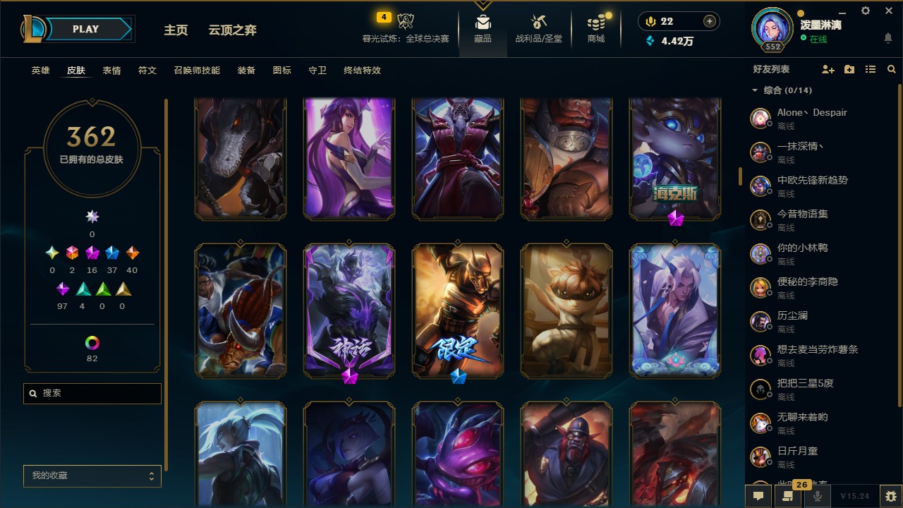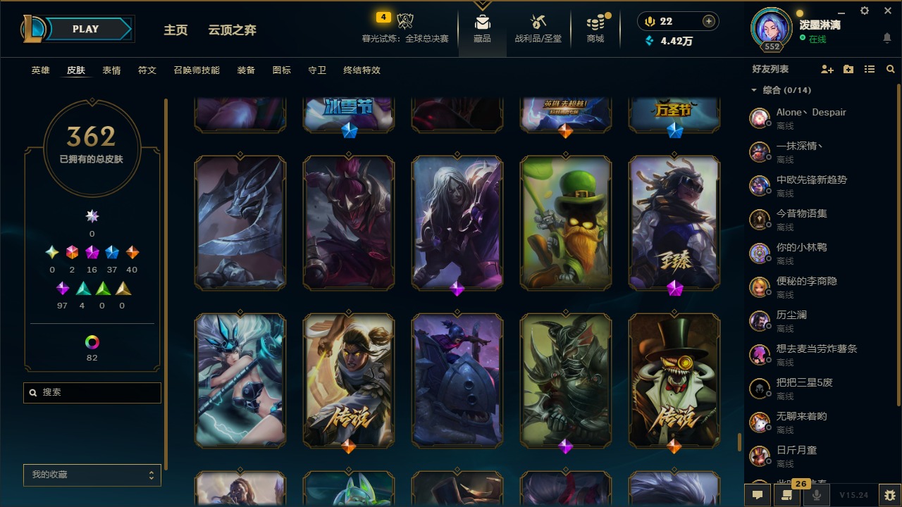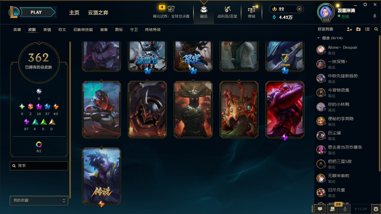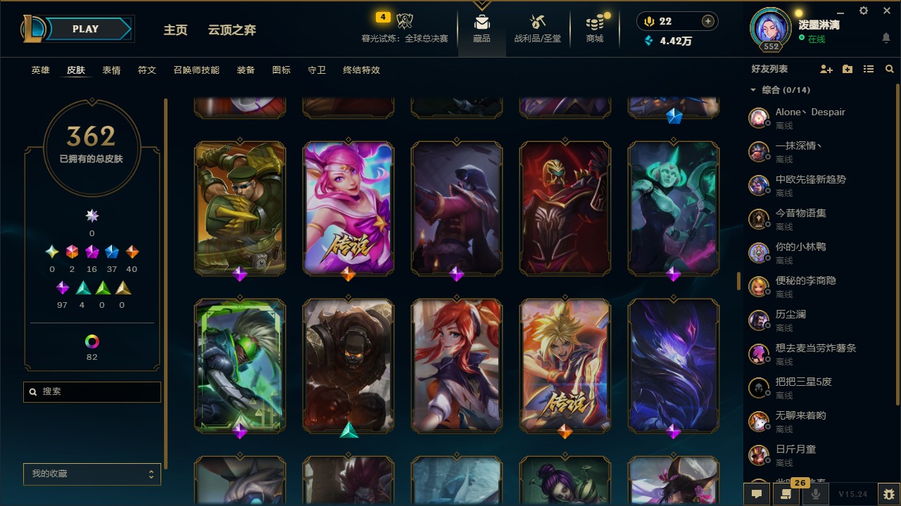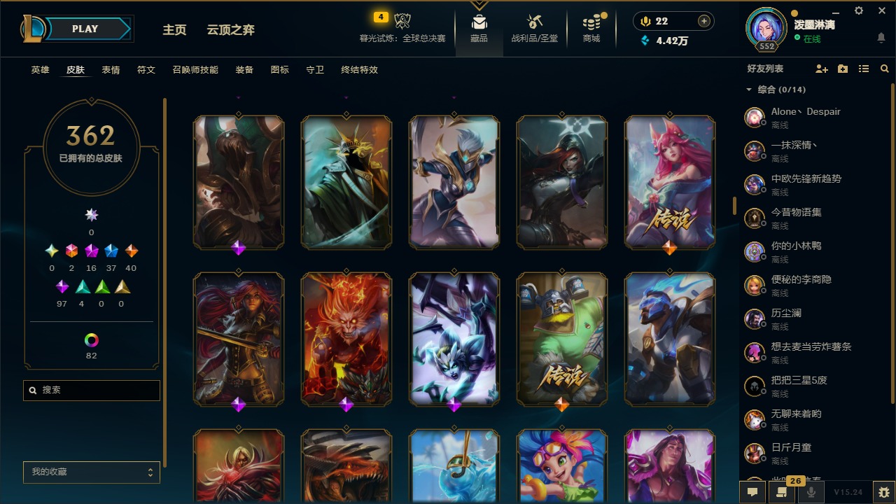 2终极 16神话 37限定 40传说 97史诗 362皮肤 97炫彩 172英雄 可二次 可修改实名 【至臻】:至臻 腥红之月 亚托克斯2022至臻 绒毛 菲兹2022至臻 玉剑传说 武剑仙2022至臻 腥红之月 亚托克斯至臻 绒毛菲兹至臻 玉剑传说 武剑仙至臻 真实伤害