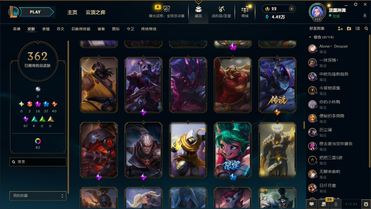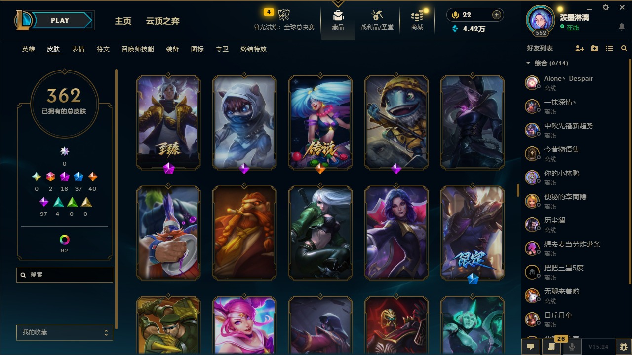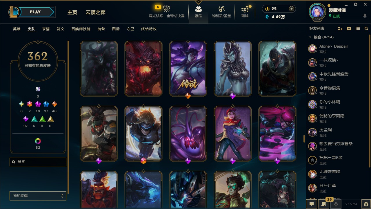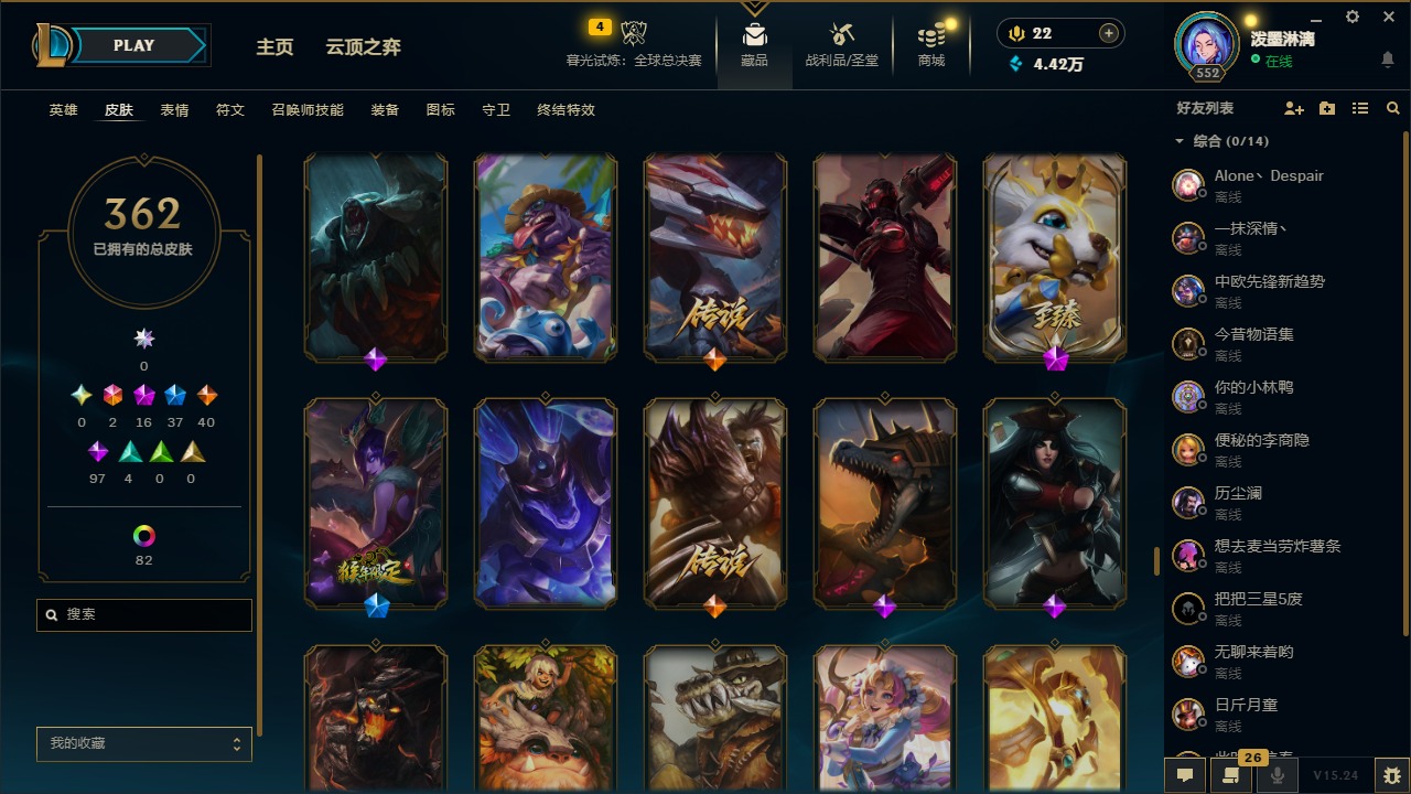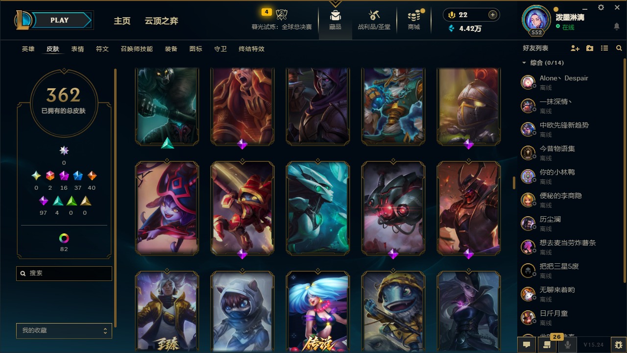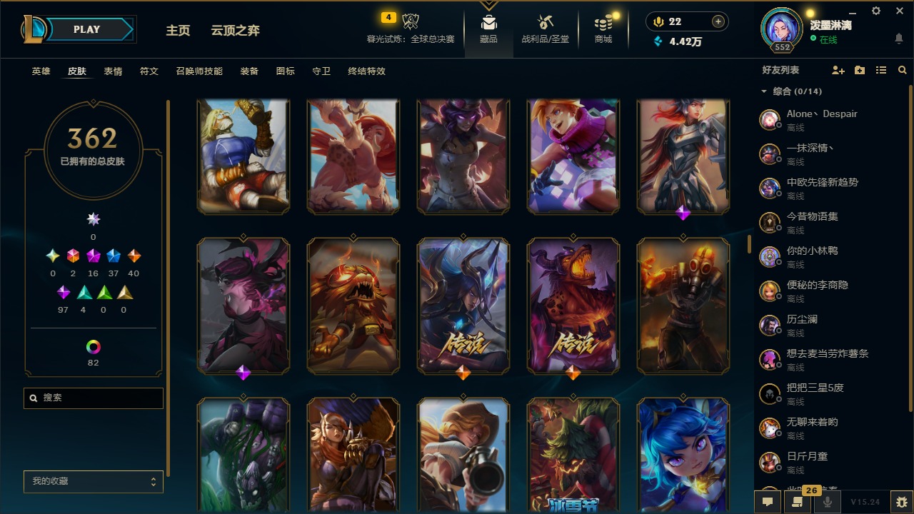 2终极 16神话 37限定 40传说 97史诗 362皮肤 97炫彩 172英雄 可二次 可修改实名 【至臻】:至臻 腥红之月 亚托克斯2022至臻 绒毛 菲兹2022至臻 玉剑传说 武剑仙2022至臻 腥红之月 亚托克斯至臻 绒毛菲兹至臻 玉剑传说 武剑仙至臻 真实伤害