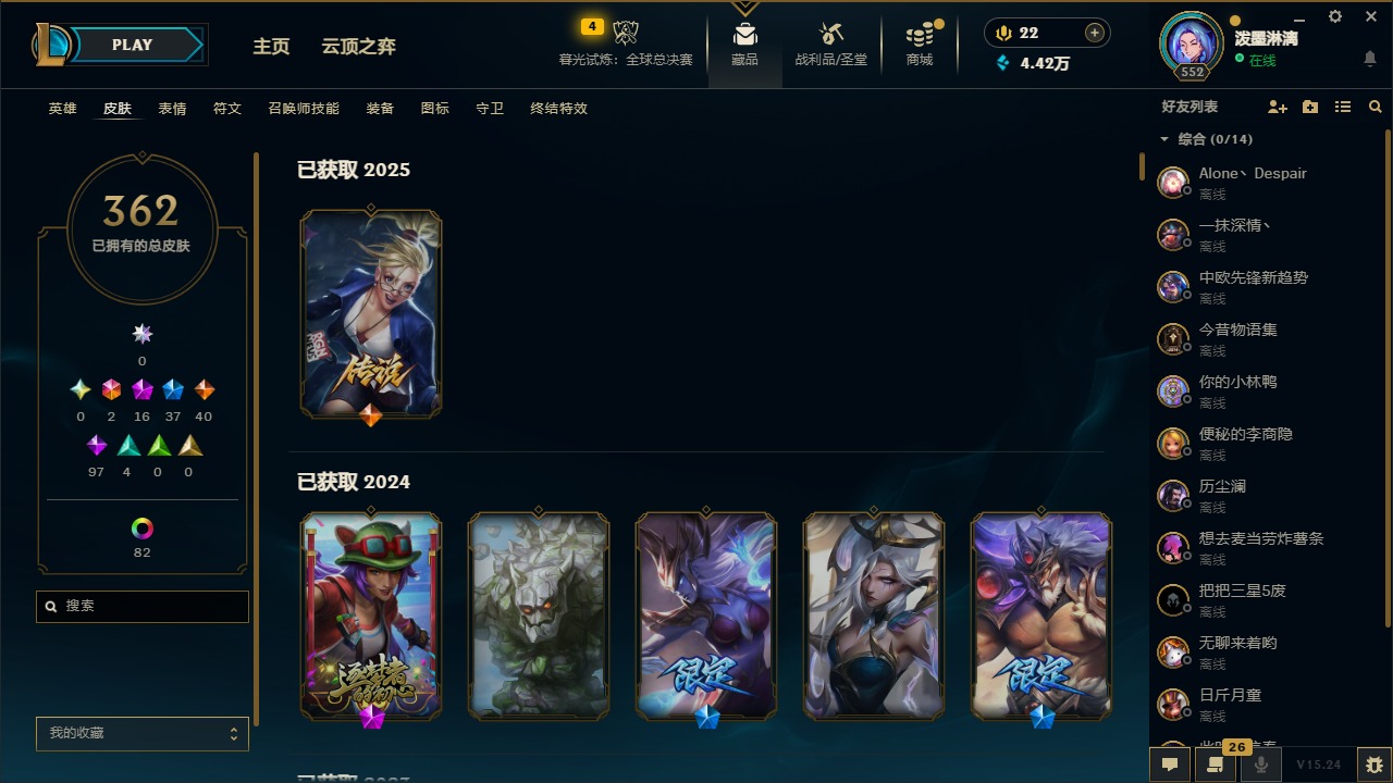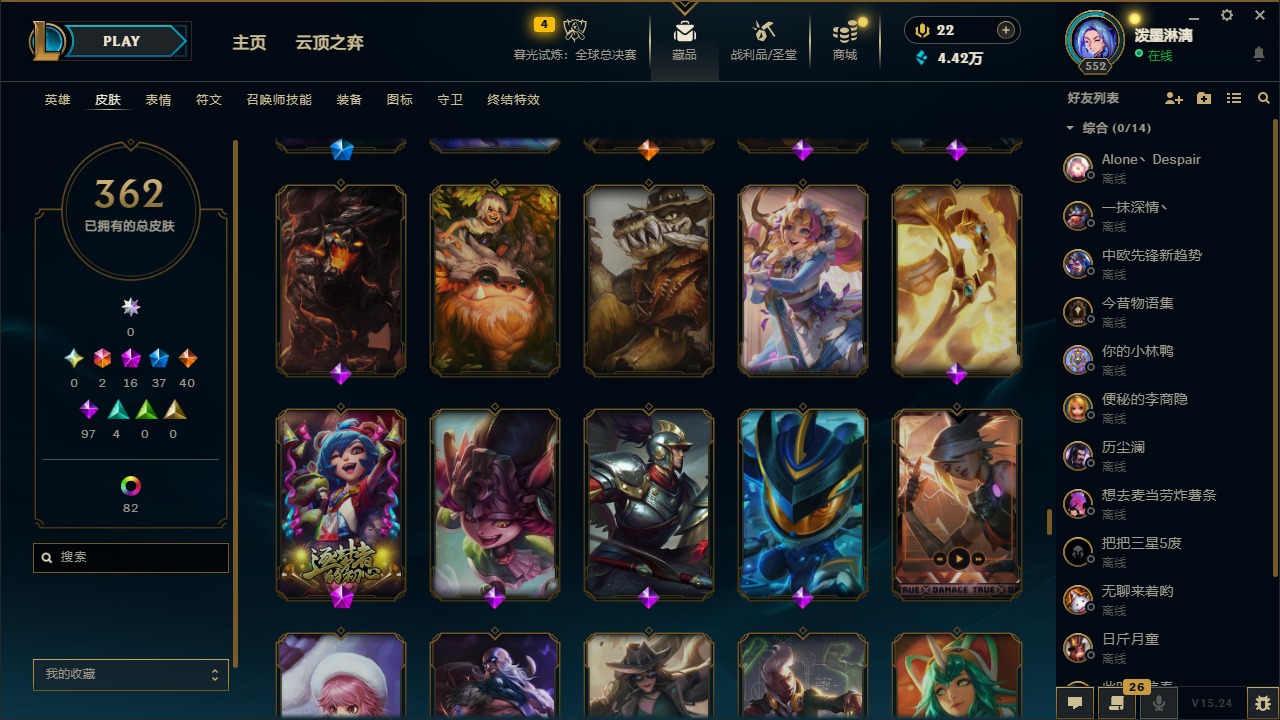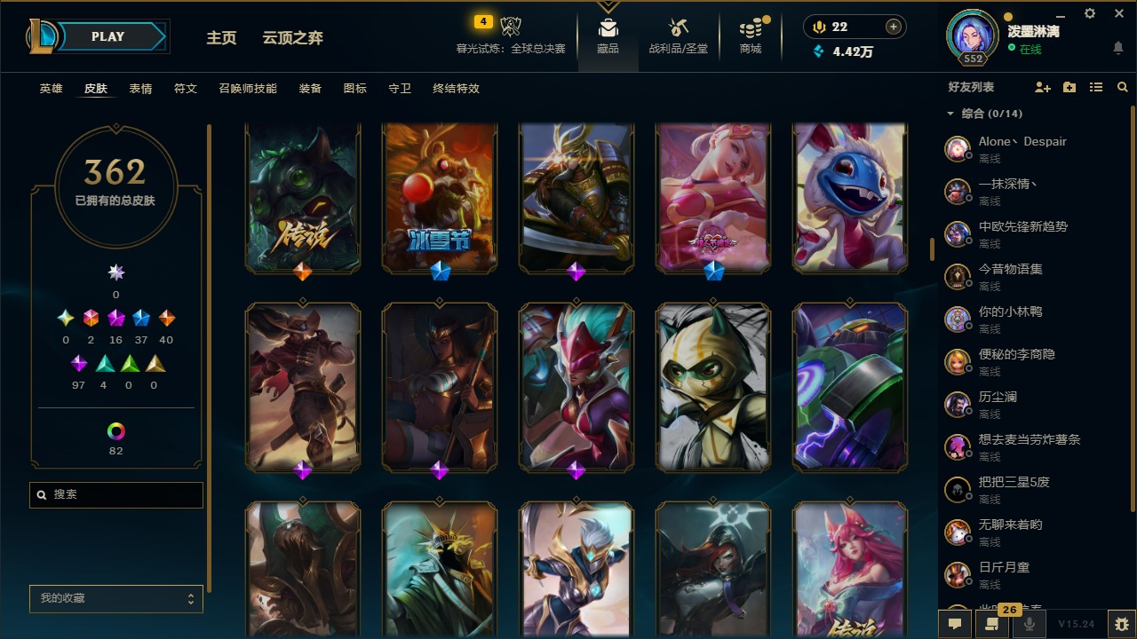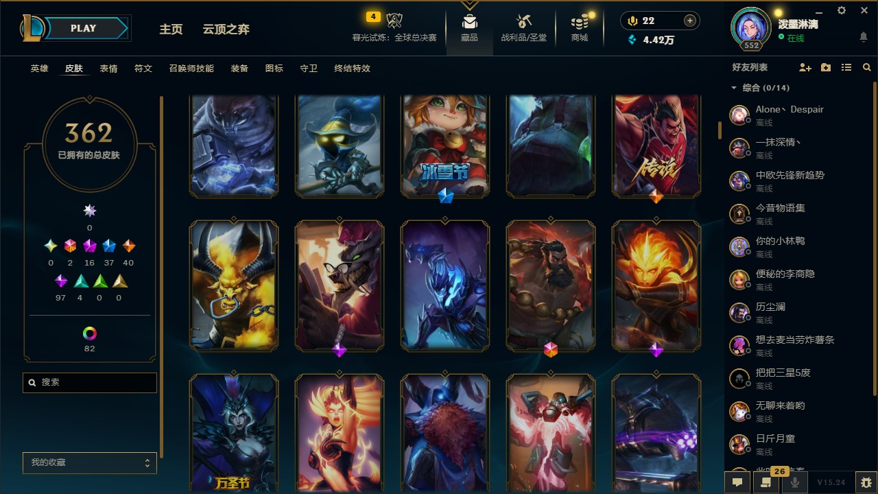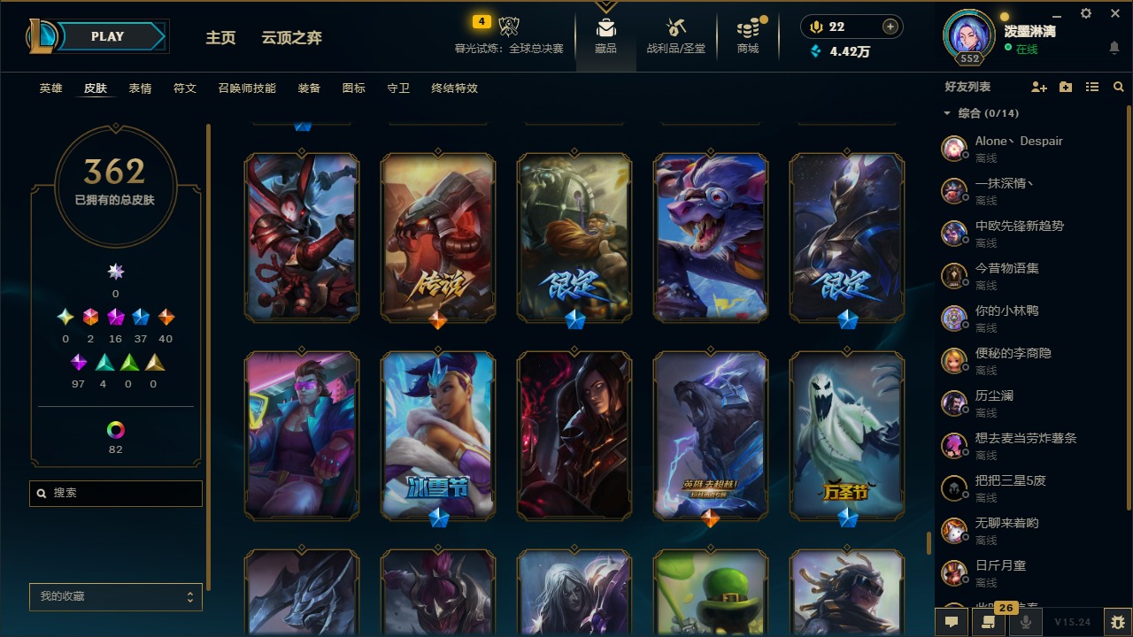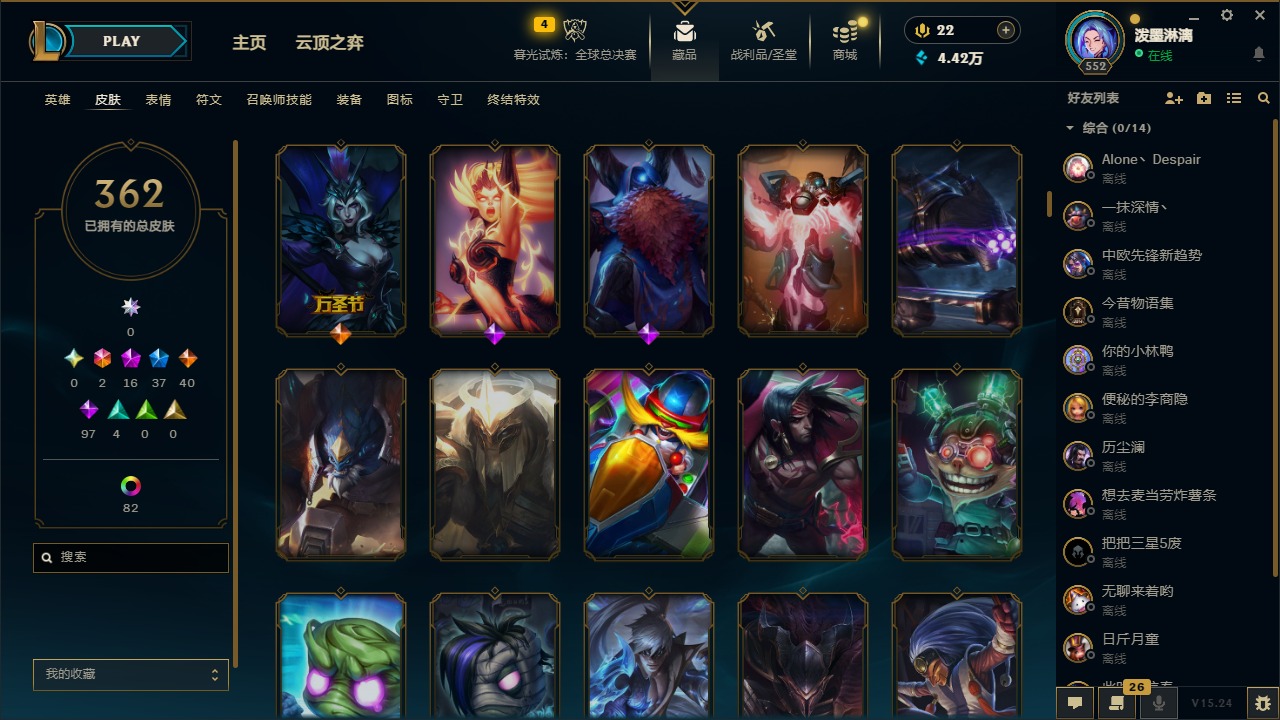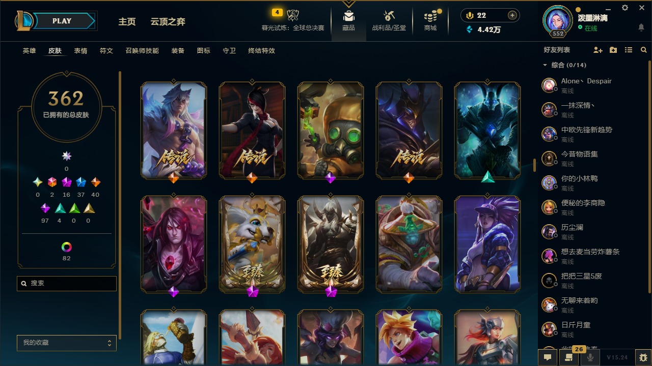 2终极 16神话 37限定 40传说 97史诗 362皮肤 97炫彩 172英雄 可二次 可修改实名 【至臻】:至臻 腥红之月 亚托克斯2022至臻 绒毛 菲兹2022至臻 玉剑传说 武剑仙2022至臻 腥红之月 亚托克斯至臻 绒毛菲兹至臻 玉剑传说 武剑仙至臻 真实伤害