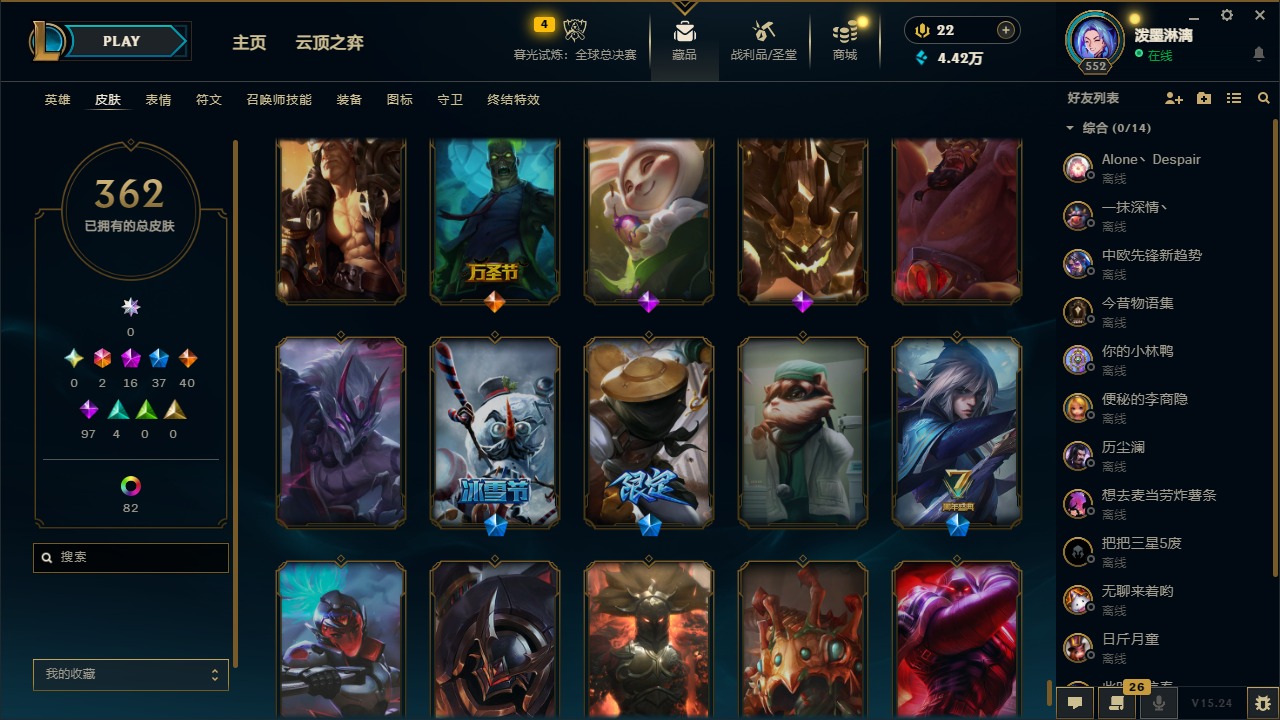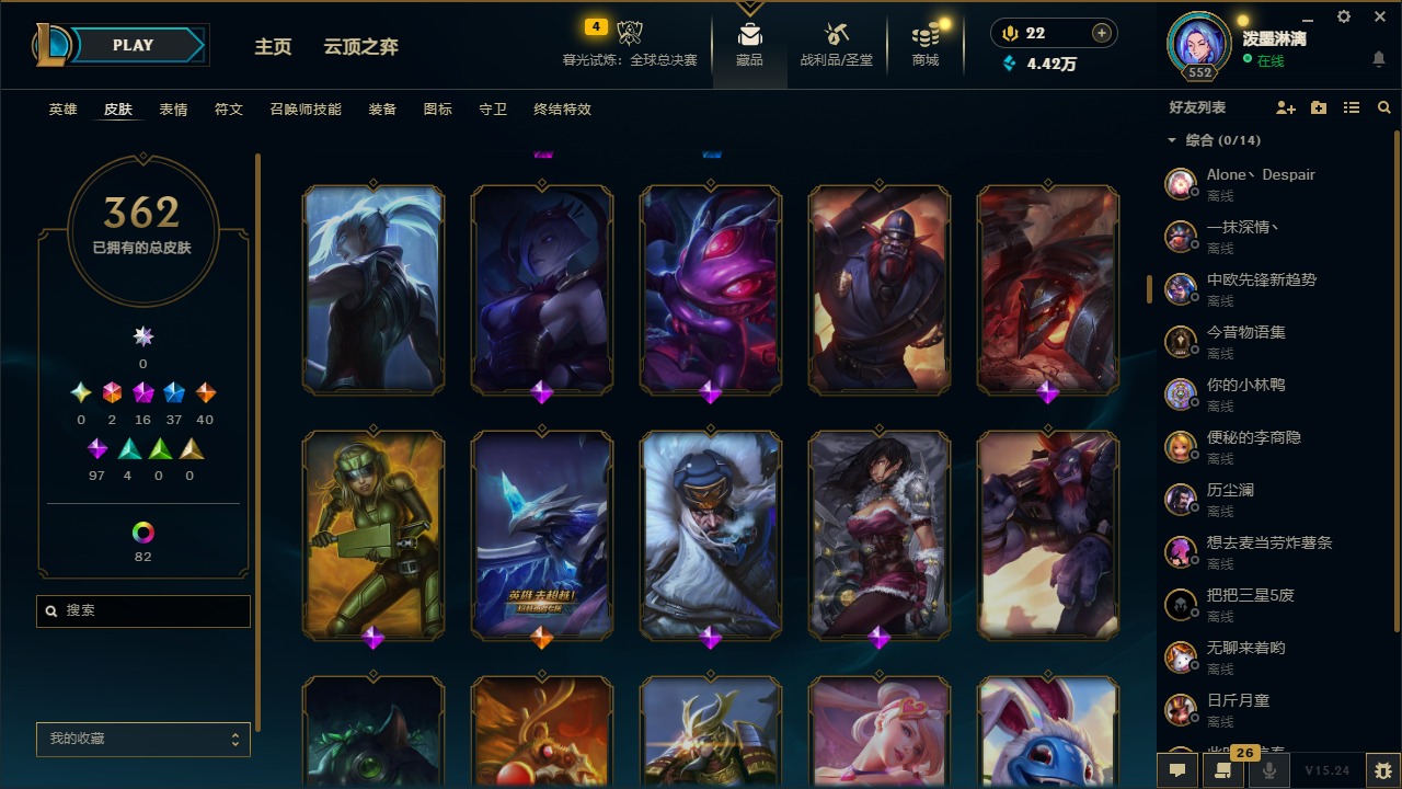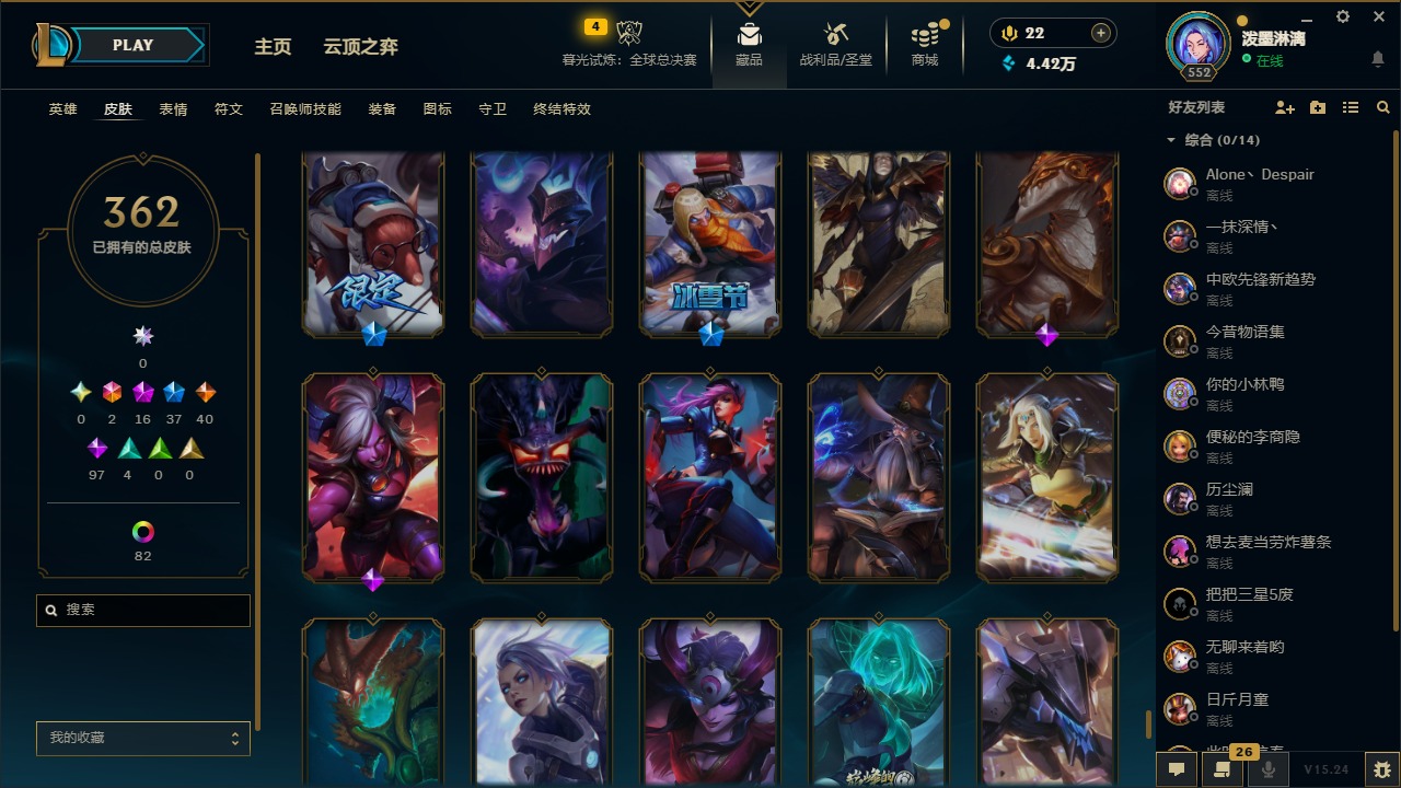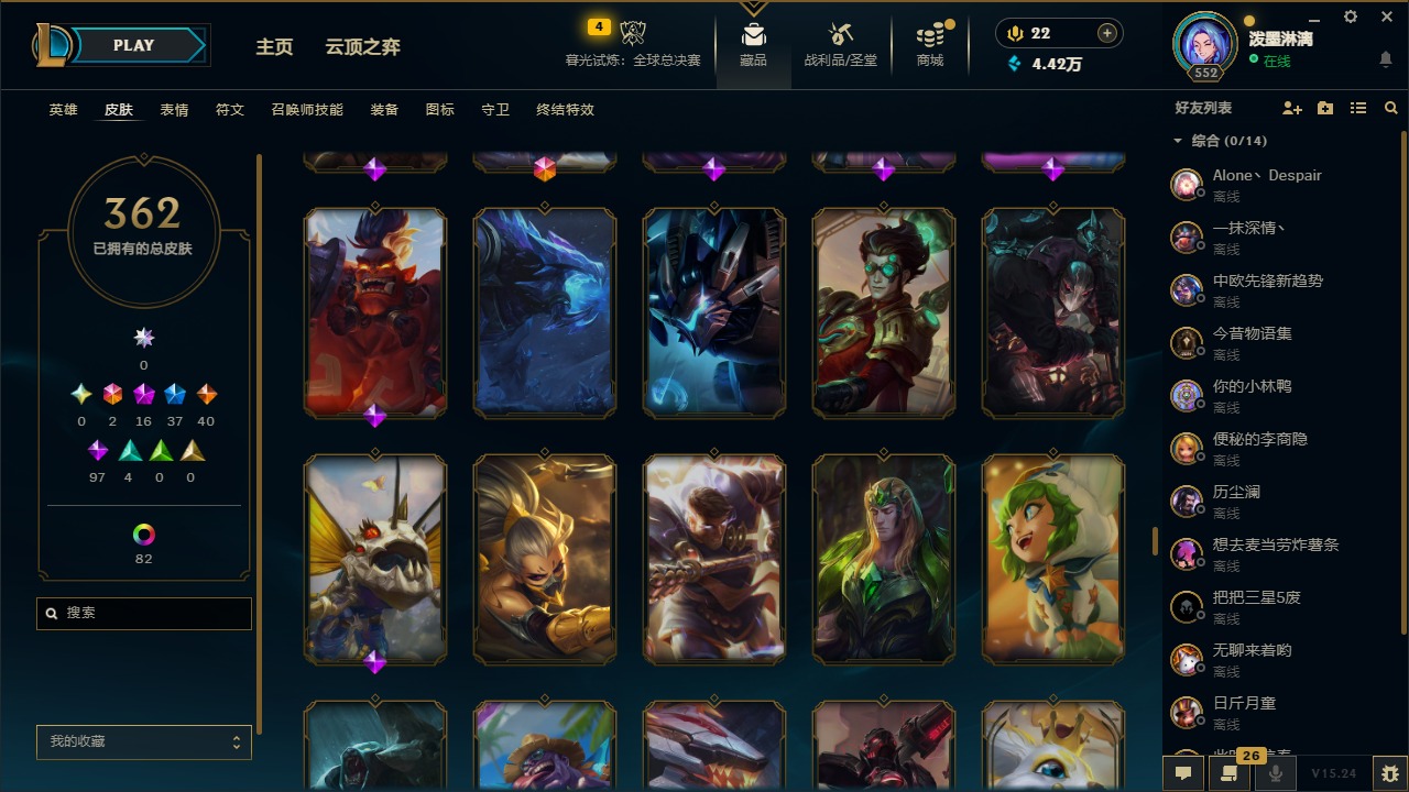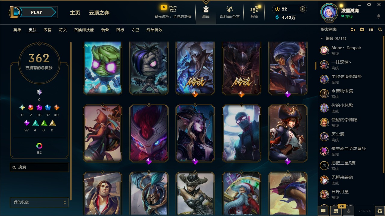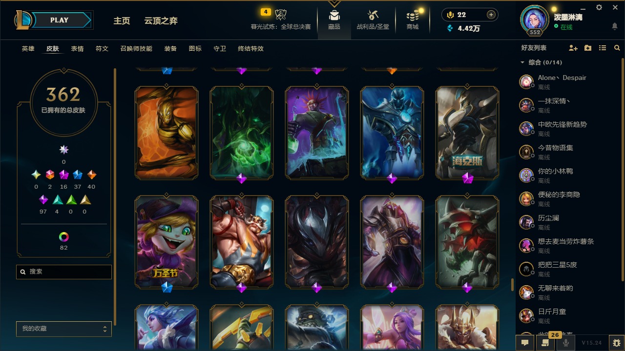 2终极 16神话 37限定 40传说 97史诗 362皮肤 97炫彩 172英雄 可二次 可修改实名 【至臻】:至臻 腥红之月 亚托克斯2022至臻 绒毛 菲兹2022至臻 玉剑传说 武剑仙2022至臻 腥红之月 亚托克斯至臻 绒毛菲兹至臻 玉剑传说 武剑仙至臻 真实伤害