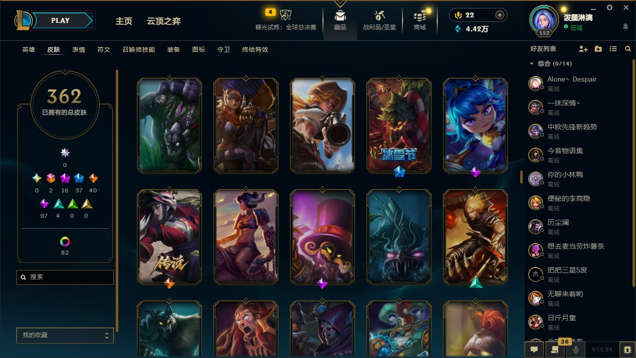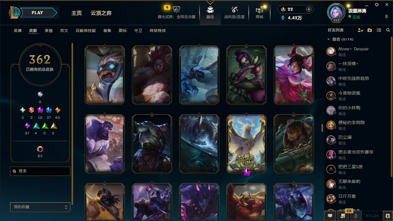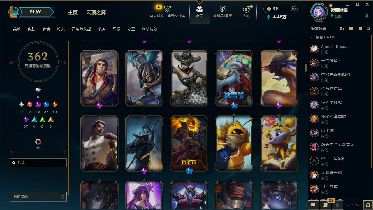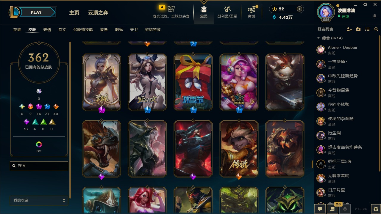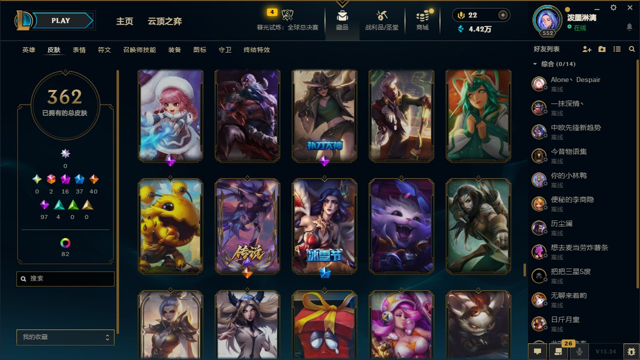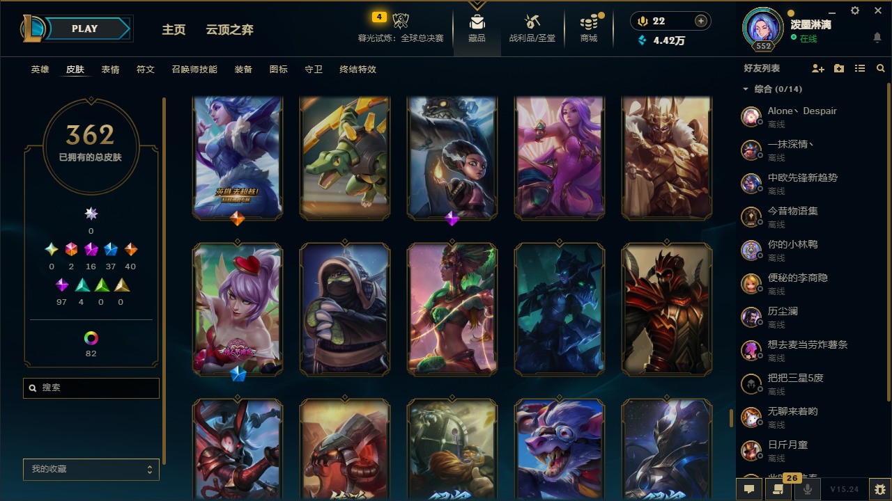 2终极 16神话 37限定 40传说 97史诗 362皮肤 97炫彩 172英雄 可二次 可修改实名 【至臻】:至臻 腥红之月 亚托克斯2022至臻 绒毛 菲兹2022至臻 玉剑传说 武剑仙2022至臻 腥红之月 亚托克斯至臻 绒毛菲兹至臻 玉剑传说 武剑仙至臻 真实伤害