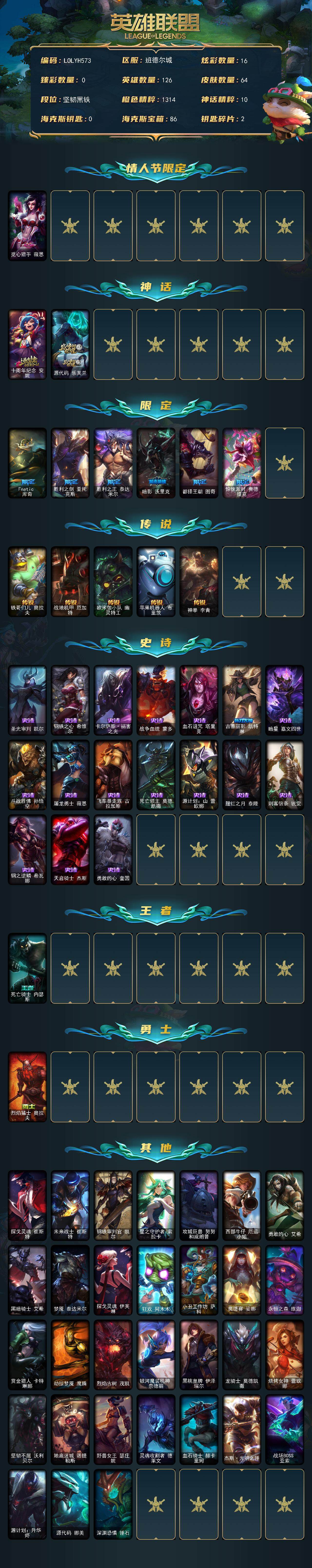 【lolyh573】126英雄/64皮肤/2神话/7限定/16炫彩/5传说/17史诗/未定级/觅心猎手薇恩/十周年纪念安妮/源代码乐芙兰/fnatic库奇/胜利之剑亚托克斯/胜利之王泰达米尔/暗影沃里克/都铎王朝图奇/惊悚派对费德提克/铁哥们儿奥拉夫/战地机甲厄加特/欧米伽小队幽灵特工/苹果机器人布里茨/神拳李青/圣光审判凯尔/钢铁之心希维尔/卡尔萨斯祸害之光/战争血统蒙多/血石诅咒塔里克/古墓丽影凯特琳/暗星嘉文四世/斗战胜佛孙悟空/屠龙勇士薇恩/飞车暴走族古拉加斯/死亡领主莫德凯撒/源计划山蕾欧娜/腥红之月泰隆/刺客信条锐雯/钢之逆鳞希瓦娜/天启骑士杰斯/勇敢的心奎因/死亡骑士内瑟斯/烈焰猛士奥拉夫/探戈灵魂崔斯特/未来战士崔斯特/钢铁审判官凯尔/星之守护者索拉卡/攻城巨兽努努和威朗普/西部牛仔厄运小姐/勇敢的心艾希/黑暗骑士艾希/梦魇泰达米尔/探戈灵魂伊芙琳/狂欢阿木木/小丑工作坊萨科/奥德赛娑娜/永恒之森维迦/赏金猎人卡特琳娜/劫掠梦魇魔腾/烈焰古树茂凯/银河魔装机神奈德丽/黑桃皇牌伊泽瑞尔/龙骑士莫德凯撒/烧烤女神蕾欧娜/坚韧不屈沃利贝尔/地底迷城诺提勒斯/野兽女王瑟庄妮/灵魂收割者德莱文/血石骑士赫卡里姆/杰斯光明之锤/战场boss亚索/源计划升华烬/源代码娜美/深渊恐惧锤石