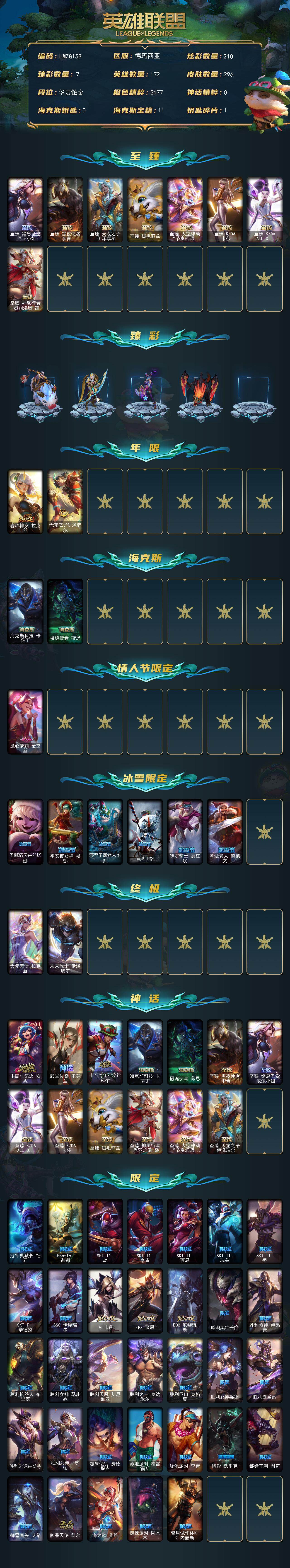 【lmzg158】172英雄/296皮肤/2终极/13神话/42限定/7臻彩/210炫彩/42传说/53史诗/铂金/至臻绝息圣堂厄运小姐/至臻黑夜使者李青/至臻天龙之子伊泽瑞尔/至臻绒毛菲兹/至臻太空律动节奏幻师璐璐/至臻kda卡莎/至臻kdaallout卡莎/至臻神凰行者烈羽焰凰霞/无畏骑士瑟庄妮赤子初心/冠军之箭艾希凯旋圣装/星之守护者金克丝黑洞/幻灵战斗蝠薇恩梦幻强袭/山海绘卷科加斯朱红/殿堂传奇乐芙兰登神/春晖神女拉克丝/天龙之子伊泽瑞尔/海克斯科技卡萨丁/摄魂使者薇恩/觅心萝莉金克丝/圣诞精灵崔丝塔娜/平安夜女神娑娜/邪恶圣诞老人维迦/雪默丁格/魄罗骑士瑟庄妮/圣诞老人德莱文/大元素使拉克丝/未来战士伊泽瑞尔/十周年纪念安妮/殿堂传奇乐芙兰/十五周年纪念希维尔/冠军典狱长锤石/fnatic迦娜/sktt1劫/sktt1李青/sktt1薇恩/sktt1瑞兹/sktt1烬/sktt1辛德拉/ssg伊泽瑞尔/ig卡莎/f薇恩/edg厄斐琉斯/暗裔英雄盖伦/胜利呛神卢锡安/胜利机器人布里茨/胜利女神瑟庄妮/胜利凤凰艾尼维亚/胜利之王泰达米尔/胜利巨口克格莫/胜利女神娑娜/胜利剑圣易/胜利之运崔斯特/胜利女神菲奥娜/糖果使徒费德提克/泳池派对格雷福斯/泳池派对李青/暗影沃里克/都铎王朝图奇/御星魔矢艾希/防暴天使凯尔/海之歌艾希/惊悚派对阿木木/警用试作体k9内瑟斯/战地机甲厄加特/血石领主弗拉基米尔/大天使长米迦勒凯尔/战场女武神凯尔/恶魔男爵瑞兹/约德尔国队长提莫/烈焰雄心崔丝塔娜/女皇艾希/源计划联合艾希/恶魔之刃泰达米尔/鬼魂新娘莫甘娜/至尊魔女莫甘娜/绅士科加斯/双重冰晶艾尼维亚/律政大亨蒙多/电玩女神娑娜/女主播迦娜/最终boss维迦/未来战士凯特琳/太空律动猫猫布里和里茨/冰川巨兽墨菲特/神拳李青/源计划净化薇恩/炼狱魔犬内瑟斯/战斗学院伊泽瑞尔/源计划超体莫德凯撒/腥红之月鬼武姬阿卡丽/星之守护者阿卡丽/钢铁军团盖伦/冰霜亚龙希瓦娜/符文战熊沃利贝尔/宇航员诺提勒斯/霸天异形卡兹克/灌篮高手德莱厄斯/星之守护者卡莎/黑夜使者亚索/暗星尊烬/星之守护者金克丝/西部魔影卢锡安/星之守护者洛/星之守护者净化之羽霞/黎明使者永恩/安伯斯与提妮/圣光审判凯尔/地狱火阿利斯塔/战场公主希维尔/火箭达人崔丝塔娜/少林武僧贾克斯/殇之机器人阿木木/夜刃艾瑞莉娅/夜行义贼艾瑞莉娅/穿着正装的恶魔维迦/抵抗军天使凯特琳/古墓丽影凯特琳/铁血狙击手凯特琳/龙骑统帅嘉文四世/暗星嘉文四世/v字仇杀者布兰德/至高之拳李青/屠龙勇士薇恩/战地机甲斯卡纳/生化博士黑默丁格/军神战甲波比/飞车暴走族古拉加斯/钢铁意志潘森/面包之王潘森/冰川勇者伊泽瑞尔/死亡领主莫德凯撒/刺客信条凯南/钢铁烈阳蕾欧娜/帝王斑蝶克格莫/侏罗纪化石克格莫/战地机甲克格莫/银河魔装机神希瓦娜/黑帮教父格雷福斯/虚空海灵菲兹/铁血猎人雷恩加尔/白色死神韦鲁斯/奥术大师吉格斯/天启骑士杰斯/邪恶魔人扎克/源计划风亚索/苍穹之光维克兹/腥红之月烬/黯焰双魂千珏/银河魔装机神千珏/五星大厨塔姆/职业杀手卢锡安/源计划雷卢锡安/时之砂艾克/霓虹杀拳蔚/霸天剑魔亚托克斯/河水之灵娜美/上古战魂雷克塞/糖果之王艾翁/霹雳游侠弗拉基米尔/死亡骑士内瑟斯/创意工坊黑默丁格/亮丽女神希维尔/银河魔装机神安妮/牛扒狂战奥拉夫/屠龙勇士奥拉夫/风执事加里奥/未来战士崔斯特/西部魔影厄加特/社会名流乐芙兰/学生会长弗拉基米尔/绝息圣堂弗拉基米尔/幽魂费德提克/金牛座阿利斯塔/斗牛士阿利斯塔/后场堡垒阿利斯塔/瑞兹白须/武仙座海格力斯赛恩/原野伐木工赛恩/创世之神赛恩/光明骑士希维尔/蕉泥座人索拉卡/游击队员崔丝塔娜/约德尔海贼团崔丝塔娜/源计划末日沃里克/脏兮兮努努和威朗普/西部牛仔厄运小姐/特工狂花厄运小姐/破败军团厄运小姐/绝息圣堂厄运小姐/黑暗骑士艾希/魔女艾希/关羽云长/黑夜使者泰达米尔/宗师级钓鱼训练师贾克斯/光明骑士贾克斯/玉剑传说苍鸾/黎明使者莫甘娜/嘻哈精神基兰/时间机器基兰/冲浪高手辛吉德/北风冻原图奇/横行霸道图奇/梦魇科加斯/山海绘卷科加斯/极度深寒拉莫斯/沙之守护拉莫斯/小丑工作坊萨科/战栗之毒蒙多/泳池派对蒙多/深海一号卡萨丁/源计划正义艾瑞莉娅/西部天使艾瑞莉娅/电玩上校库奇/柯基库奇/日冕女神卡尔玛/绿野仙踪维迦/欧米伽小队天雷爆破手/我怒角维迦/里尔击球手特朗德尔/垃圾场特朗德尔/海贼参谋斯维因/荒野治安官凯特琳/戴一个表布里茨/古神墨菲特/赏金猎人卡特琳娜/战斗学院卡特琳娜/图腾古树茂凯/星河战队雷克顿/血石战神雷克顿/哥特女仆奥莉安娜/苍穹之光布兰德/神龙尊者魔龙布兰德/摩登骇客薇恩/独眼海盗兰博/蛇发女妖卡西奥佩娅/创世之神内瑟斯/丛林猎豹奈德丽/武力全开乌迪尔/这货不是乌迪尔/乡村农夫古拉加斯/品酒大师古拉加斯/狂热球迷古拉加斯/足球先生伊泽瑞尔/失落的世界伊泽瑞尔/电玩勇者伊泽瑞尔/龙骑士莫德凯撒/五杀摇滚吉他手莫德凯撒/苍穹之光约里克/喵里克/足球宝贝阿卡丽/刺身之拳阿卡丽/银色闪电凯南/空手道凯南/奈落之炎凯南/战神阿瑞斯盖伦/荣誉使者玛尔扎哈/玉剑传说武剑仙/光明哨兵锐雯/荣誉使者慎/风纪委员阿狸/失落大陆菲兹/绒毛菲兹/警长沃利贝尔/怒熊沃利贝尔/坚韧不屈沃利贝尔/韦鲁斯迅箭/源计划天眼韦鲁斯/失落大陆诺提勒斯/玉剑传说无