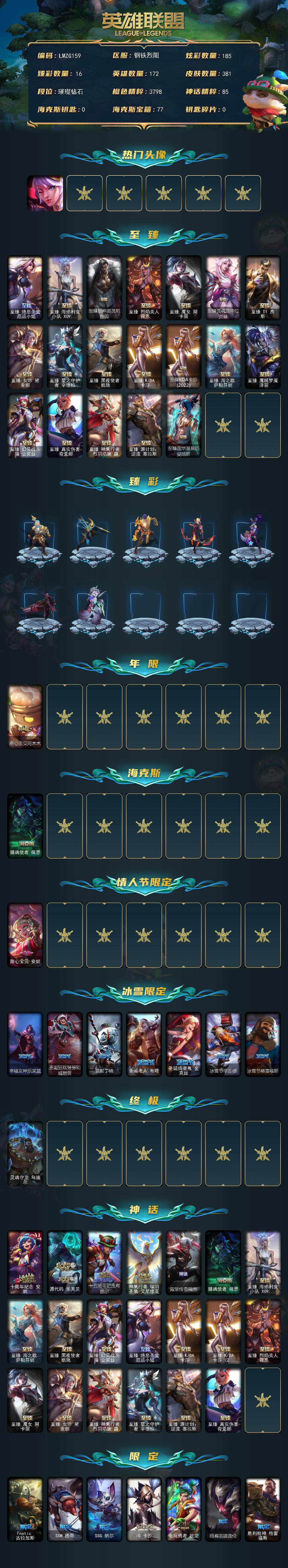 【zg159】172英雄/381皮肤/1终极/25神话/44限定/16臻彩/185炫彩/47传说/68史诗/钻石账号等级:1114/觅心之翼奎因头像/至臻绝息圣堂厄运小姐/至臻 海珀利安小队x09-星环灵风迦娜/至臻 狼神英灵 斯维因/至臻烈焰美人薇恩/至臻魔女-阿卡丽/至臻灵魂莲华拉克丝/至臻 t1 杰斯/至臻女帝黛安娜/至臻星之守护者辛德拉/至臻 黑夜使者 凯隐/至臻 k/da 卡莎/