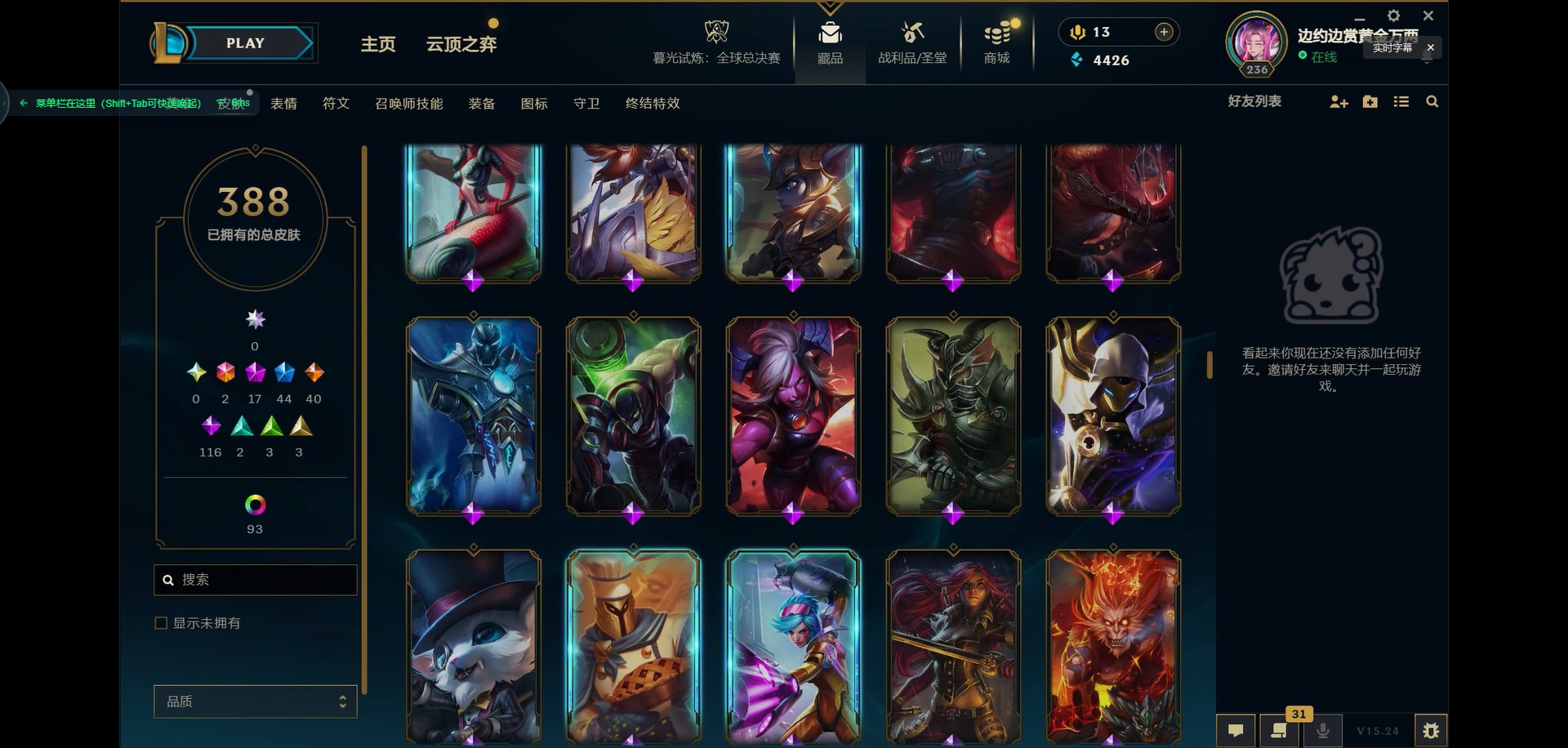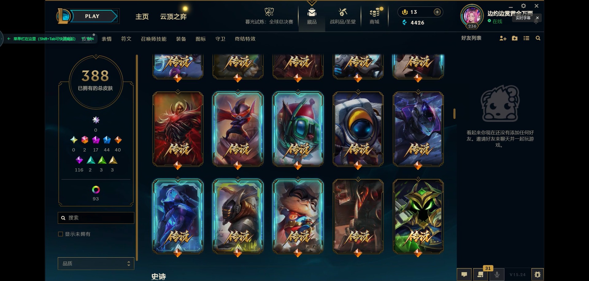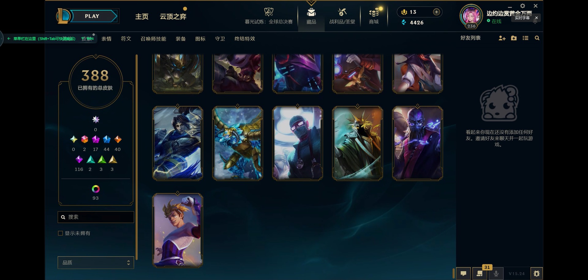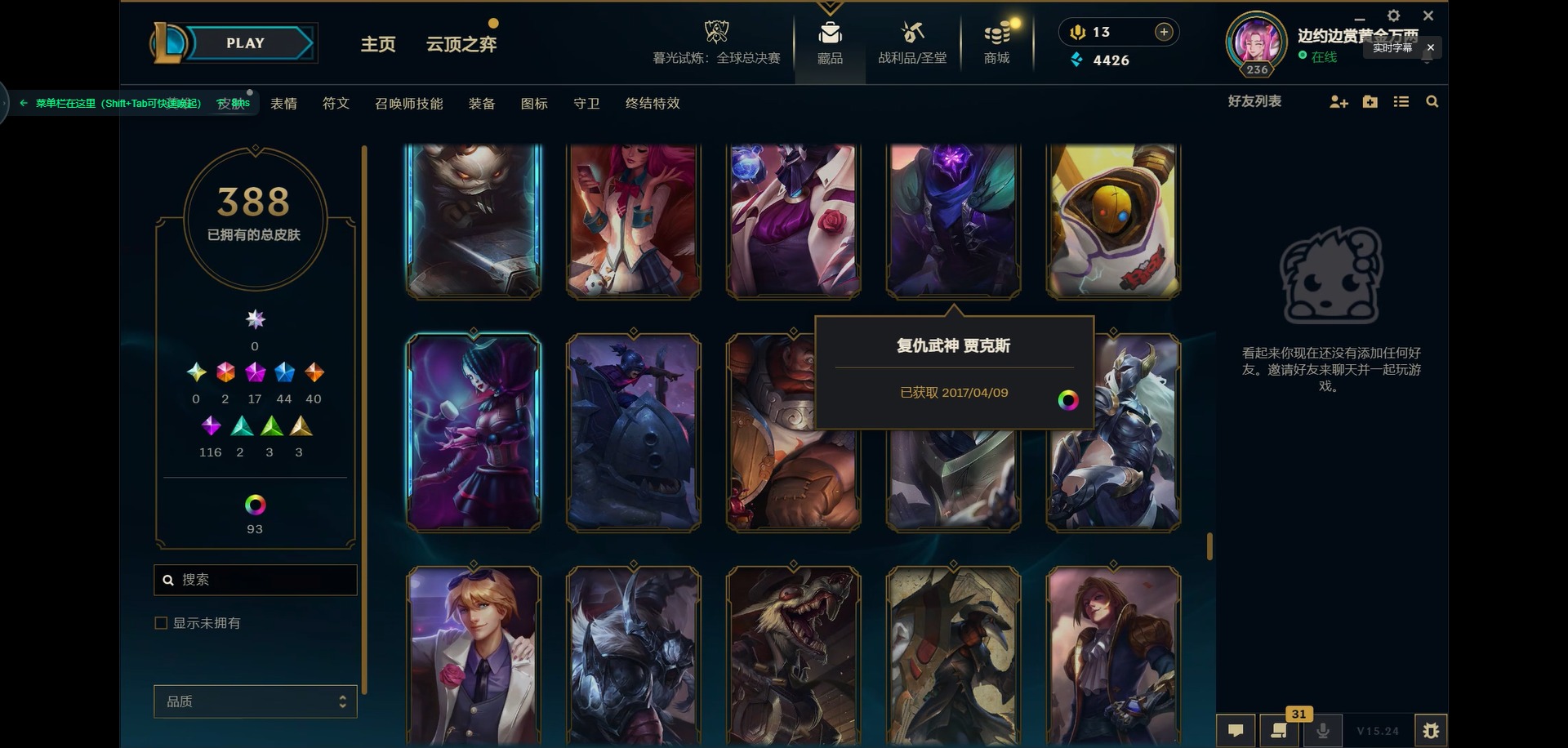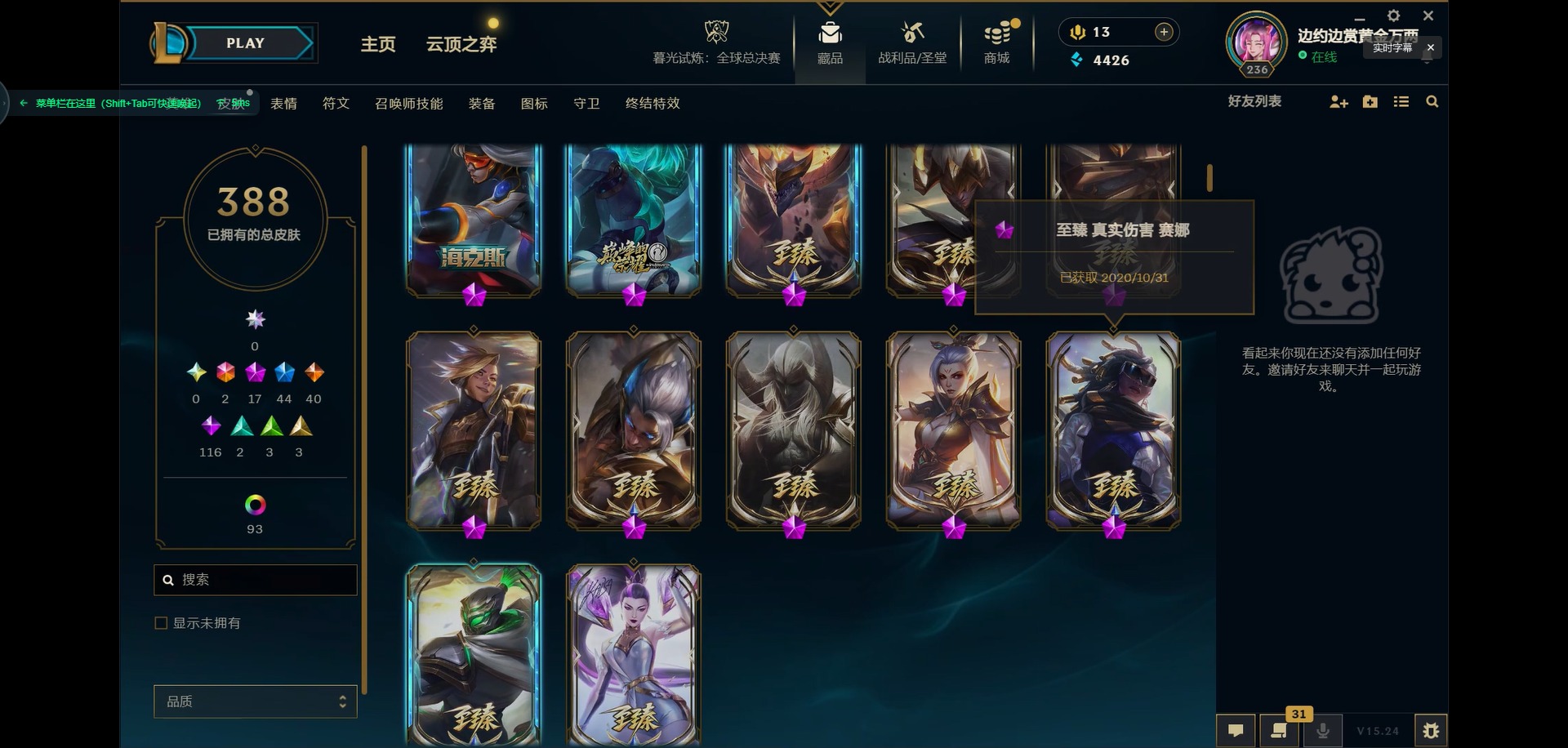 2终极 17神话 44限定 40传说 116史诗 388皮肤 115炫彩 161英雄 可二次 可修改实名 【至臻】至臻 k/da all out卡莎至臻 暗星 墨菲特至臻 王国机神玄武 盖伦至臻 黑夜使者 李青至臻 征服者 贾克斯至臻 腥红之月 亚托克斯至臻 玉剑传说 武剑仙至臻 真