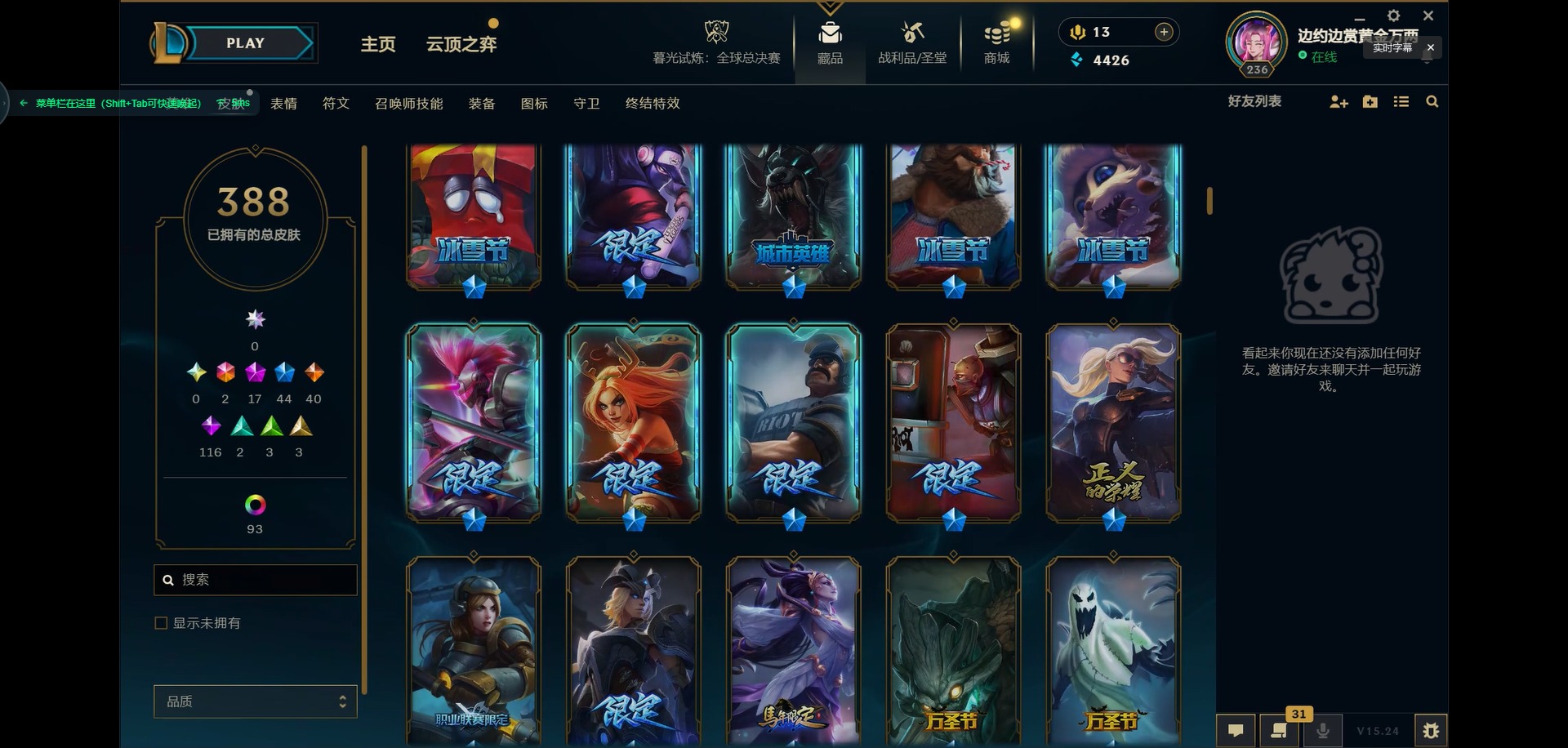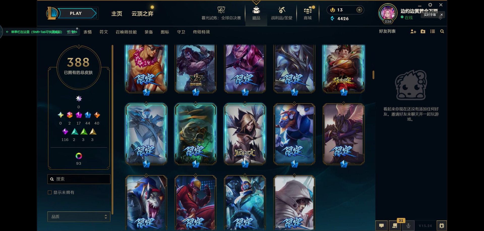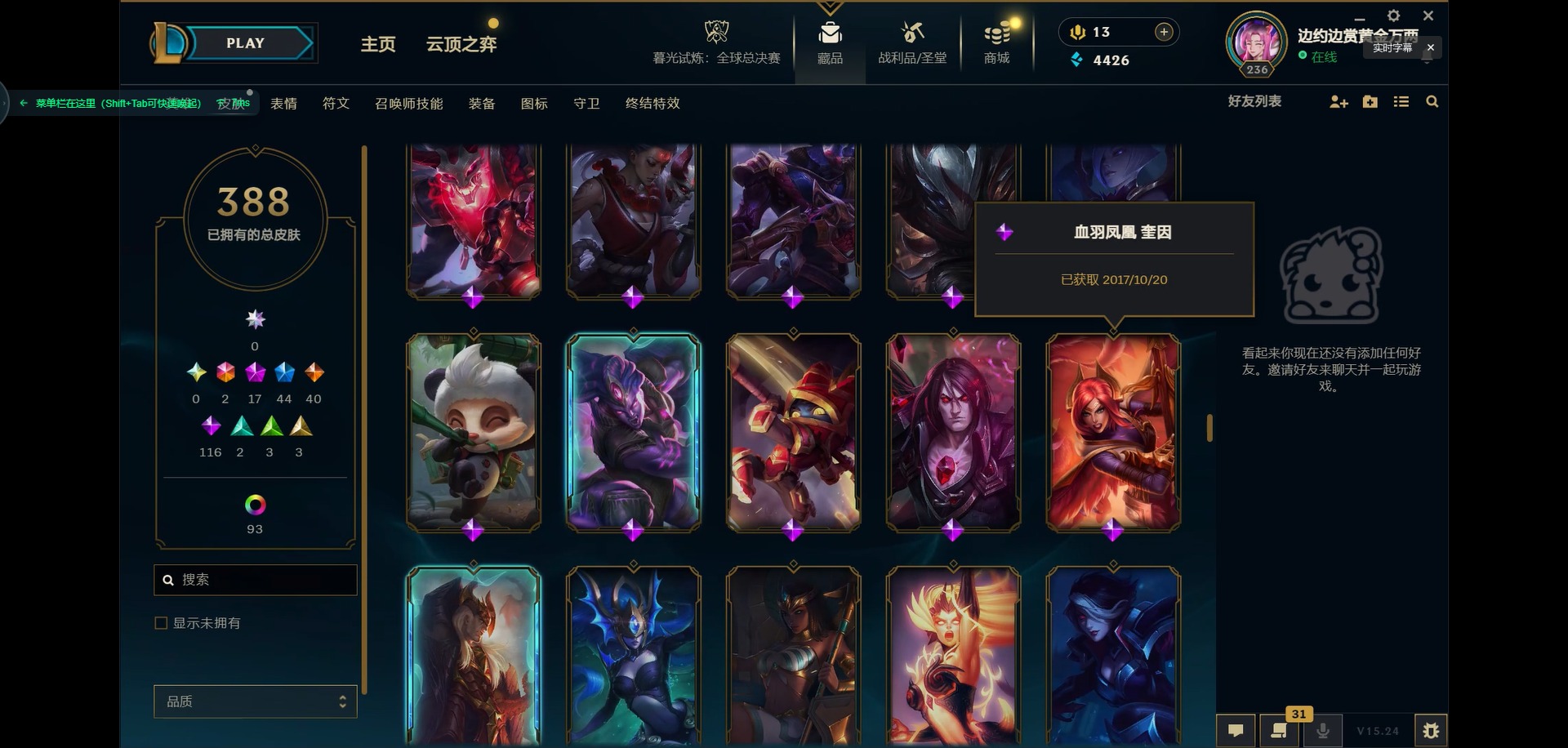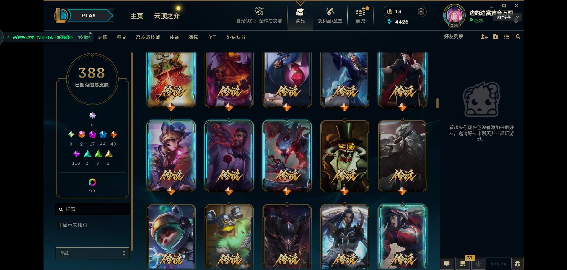 2终极 17神话 44限定 40传说 116史诗 388皮肤 115炫彩 161英雄 可二次 可修改实名 【至臻】至臻 k/da all out卡莎至臻 暗星 墨菲特至臻 王国机神玄武 盖伦至臻 黑夜使者 李青至臻 征服者 贾克斯至臻 腥红之月 亚托克斯至臻 玉剑传说 武剑仙至臻 真