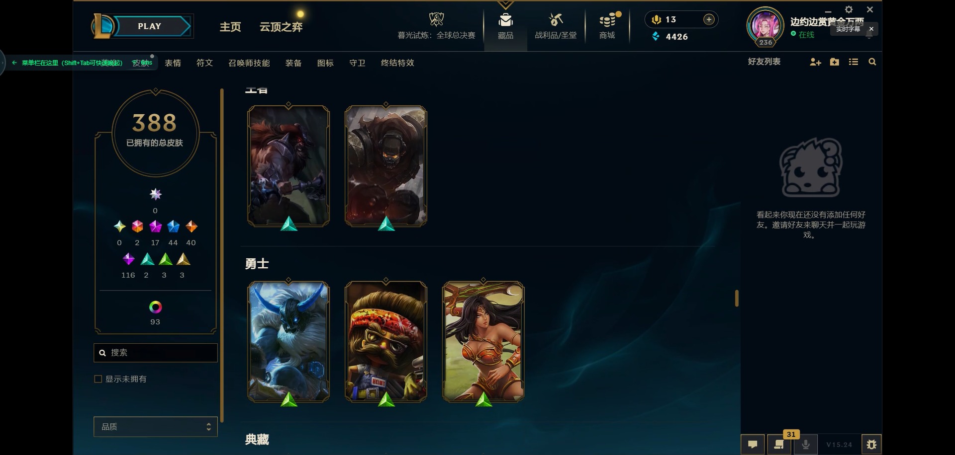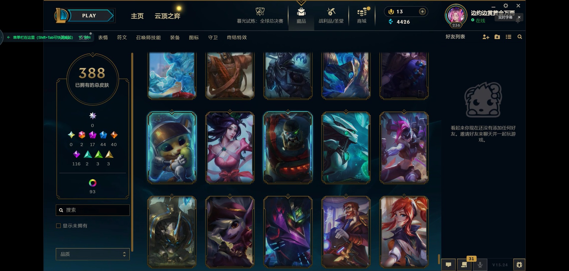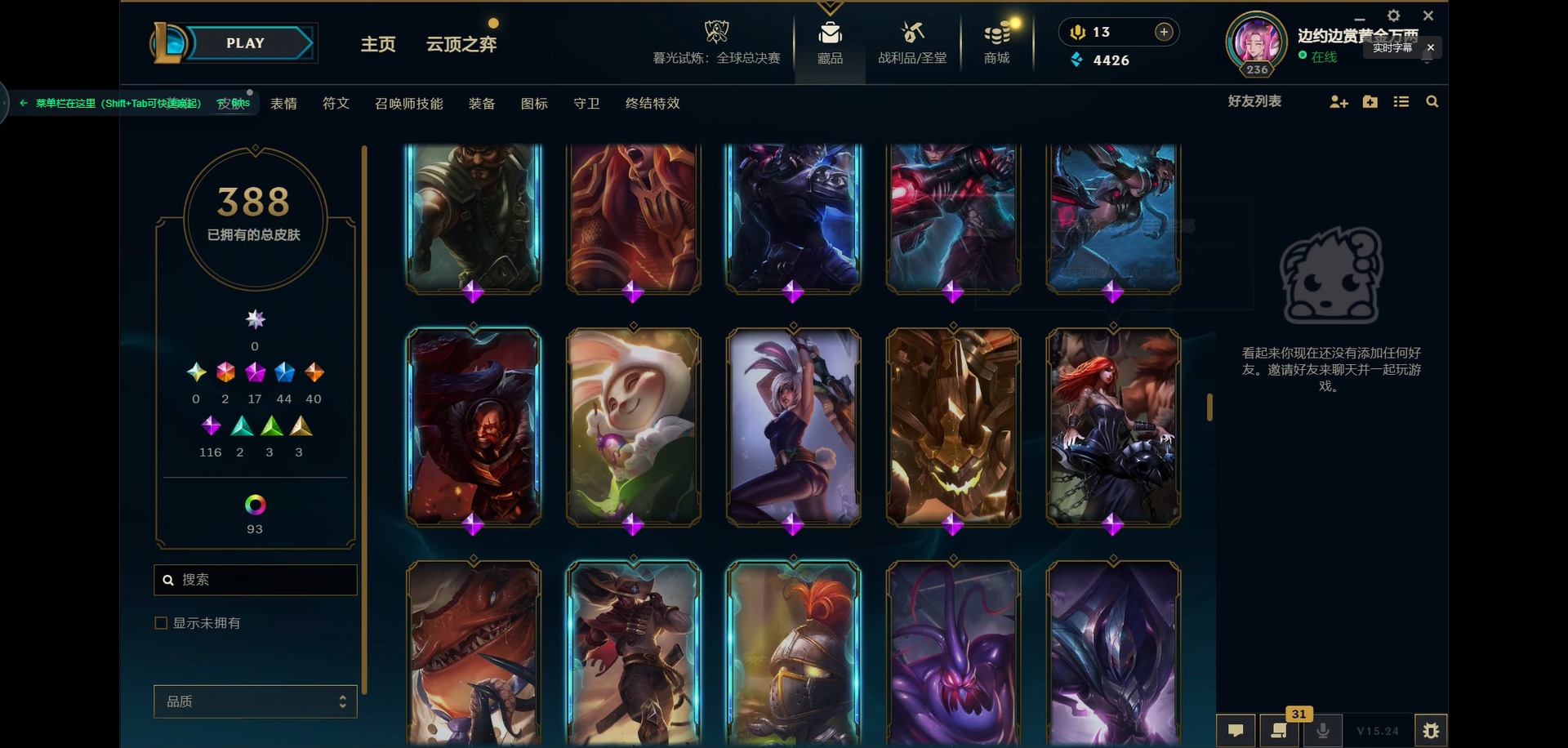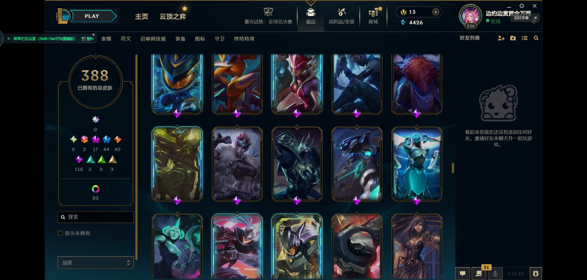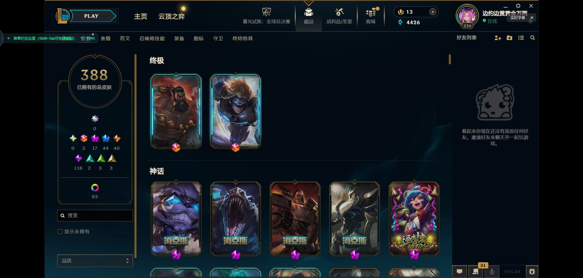 2终极 17神话 44限定 40传说 116史诗 388皮肤 115炫彩 161英雄 可二次 可修改实名 【至臻】至臻 k/da all out卡莎至臻 暗星 墨菲特至臻 王国机神玄武 盖伦至臻 黑夜使者 李青至臻 征服者 贾克斯至臻 腥红之月 亚托克斯至臻 玉剑传说 武剑仙至臻 真