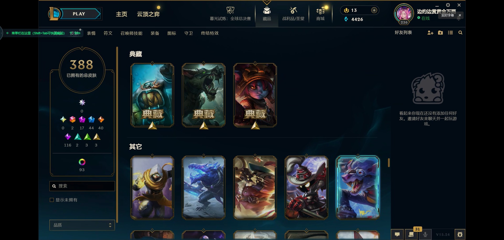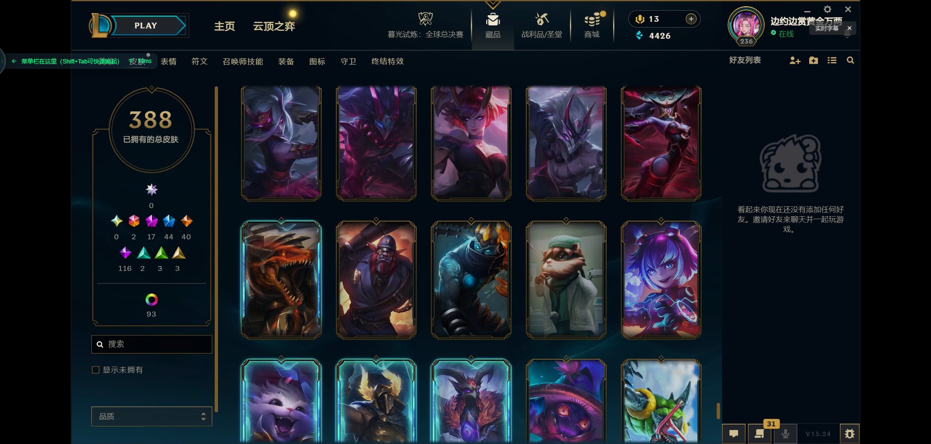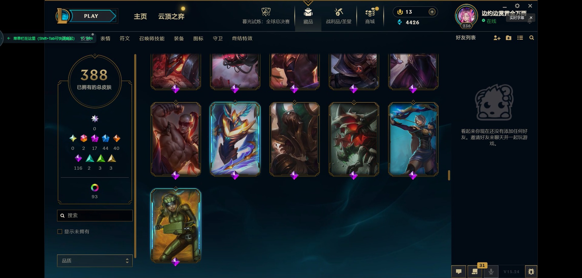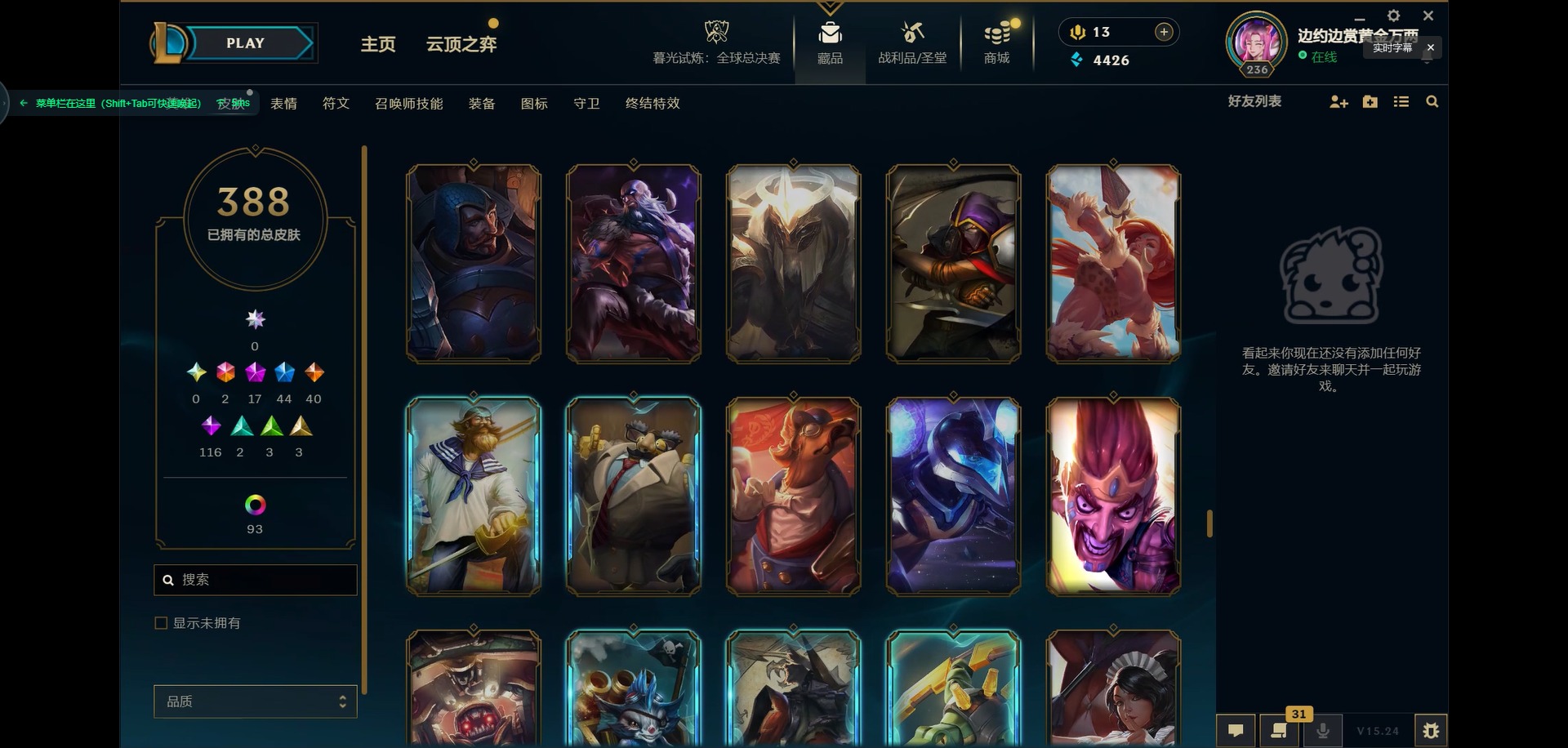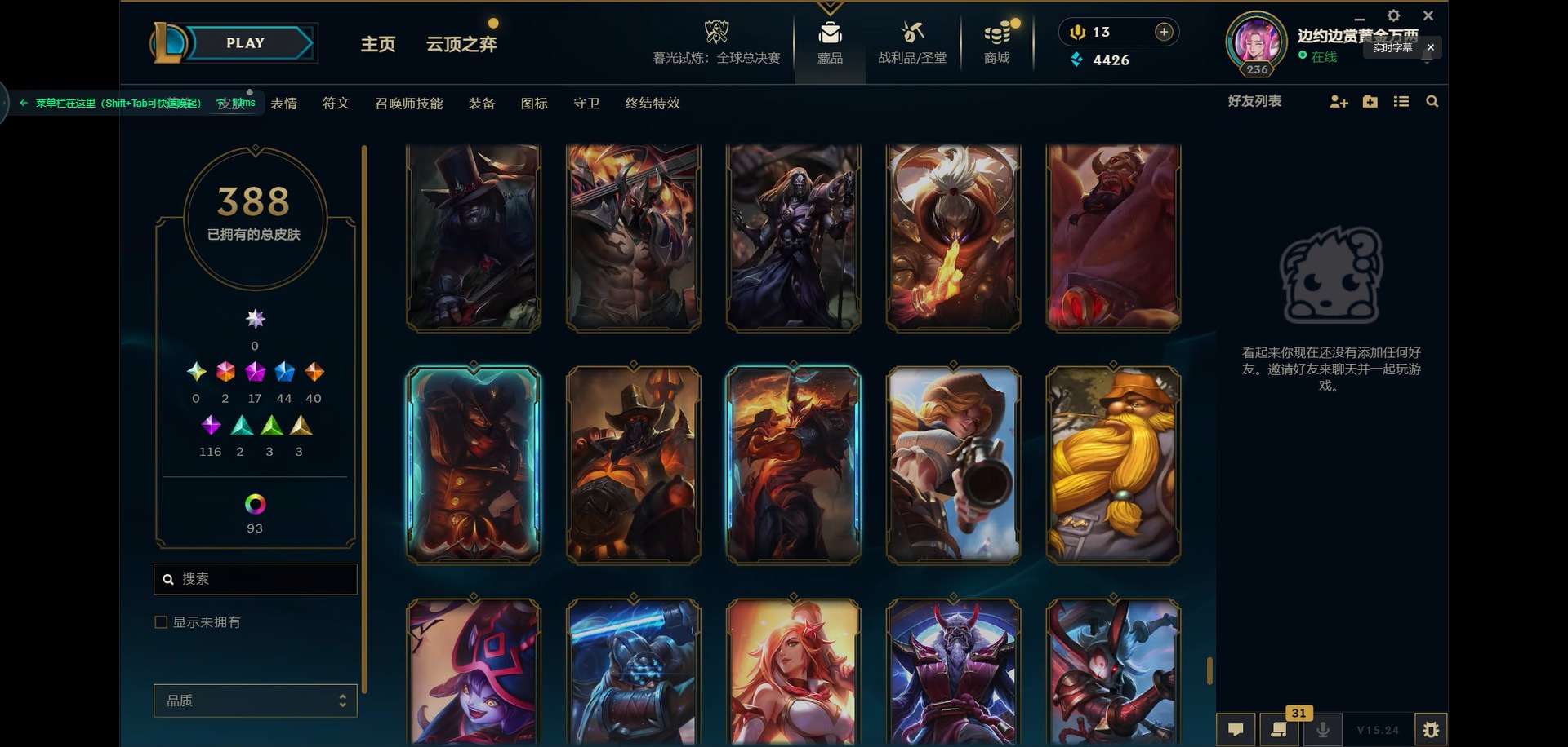 2终极 17神话 44限定 40传说 116史诗 388皮肤 115炫彩 161英雄 可二次 可修改实名 【至臻】至臻 k/da all out卡莎至臻 暗星 墨菲特至臻 王国机神玄武 盖伦至臻 黑夜使者 李青至臻 征服者 贾克斯至臻 腥红之月 亚托克斯至臻 玉剑传说 武剑仙至臻 真