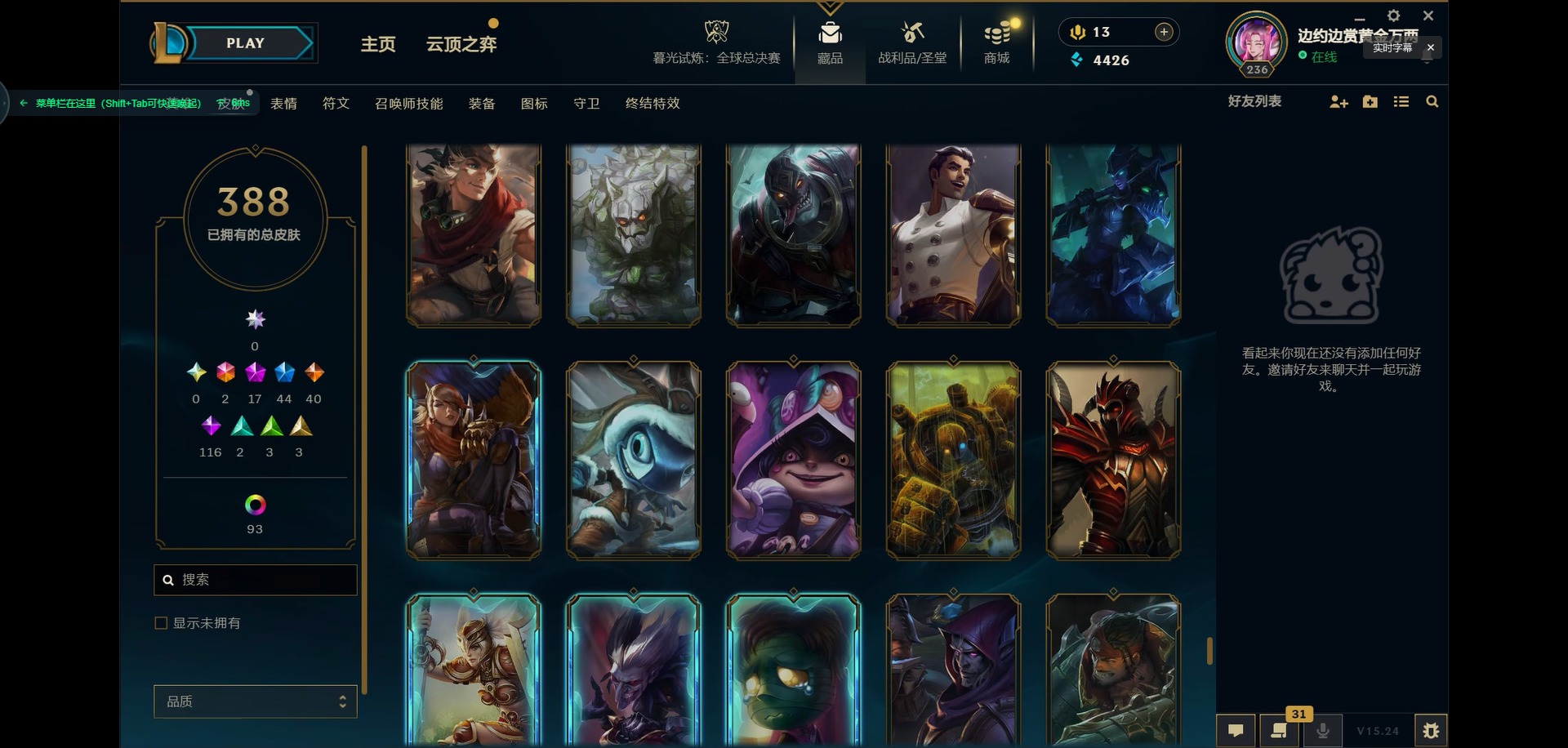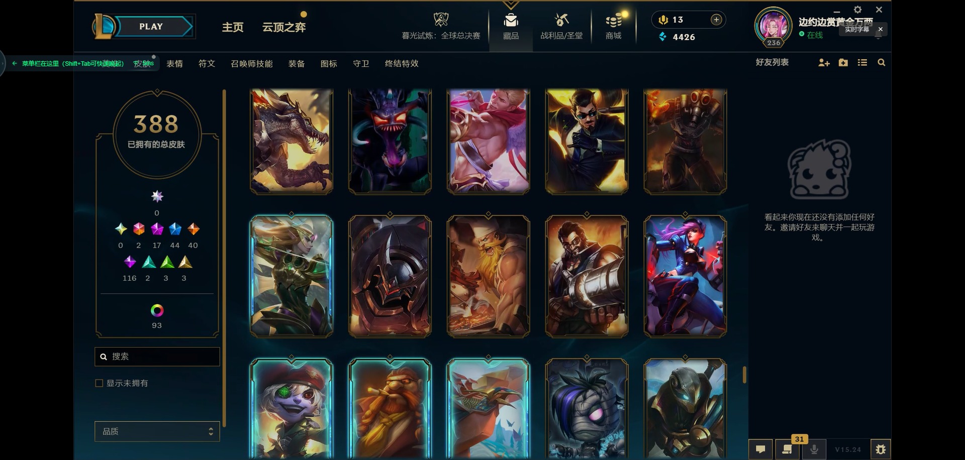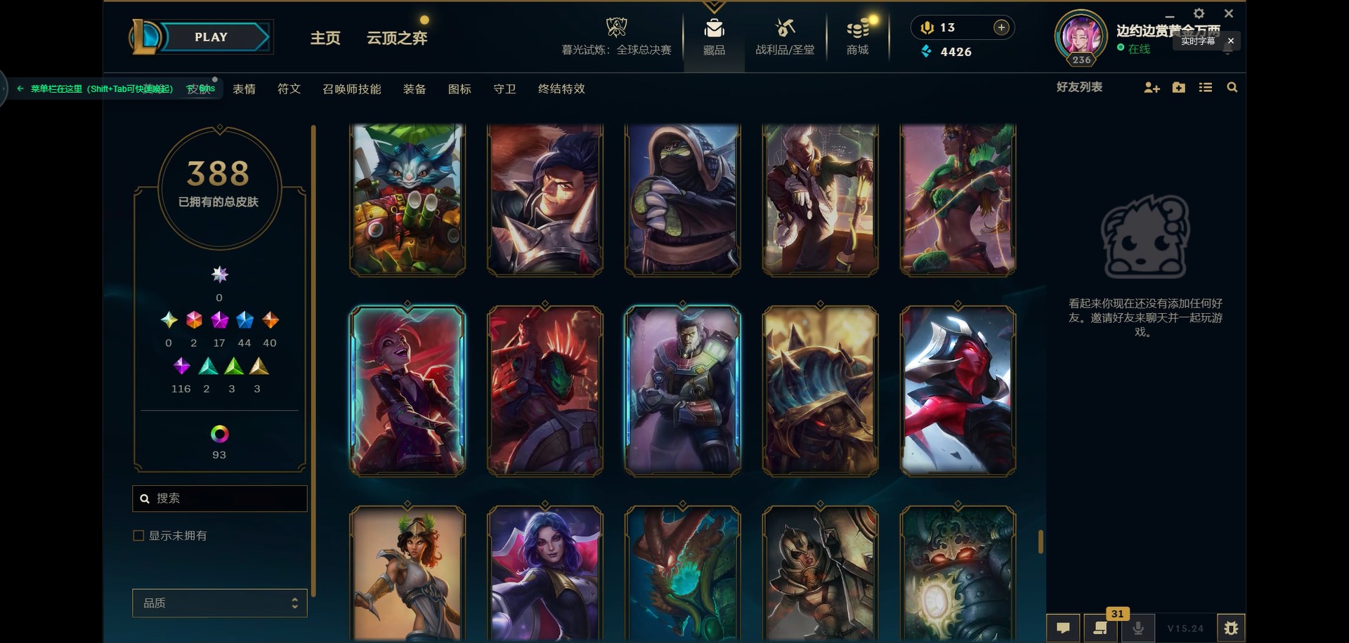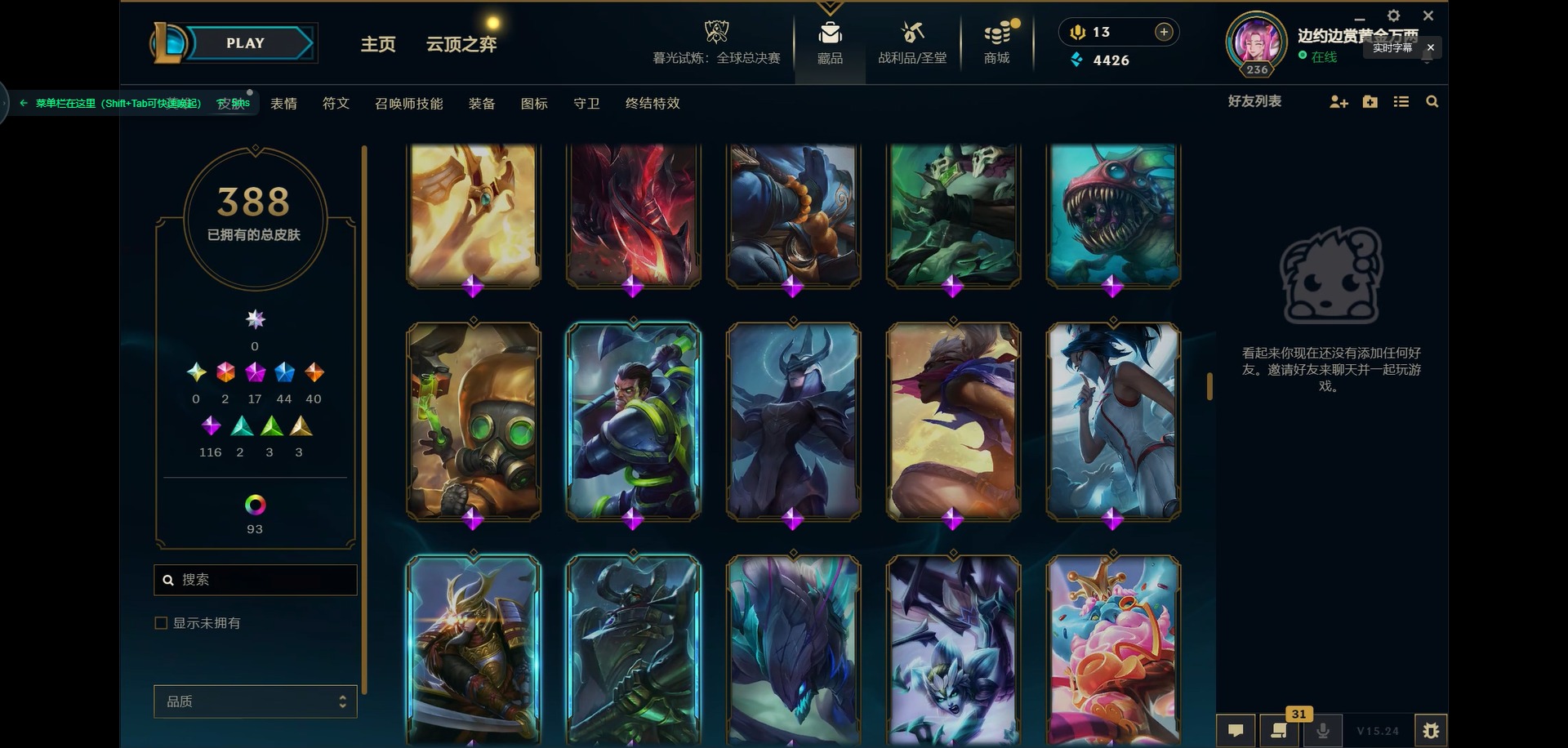 2终极 17神话 44限定 40传说 116史诗 388皮肤 115炫彩 161英雄 可二次 可修改实名 【至臻】至臻 k/da all out卡莎至臻 暗星 墨菲特至臻 王国机神玄武 盖伦至臻 黑夜使者 李青至臻 征服者 贾克斯至臻 腥红之月 亚托克斯至臻 玉剑传说 武剑仙至臻 真