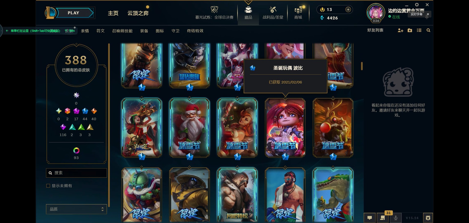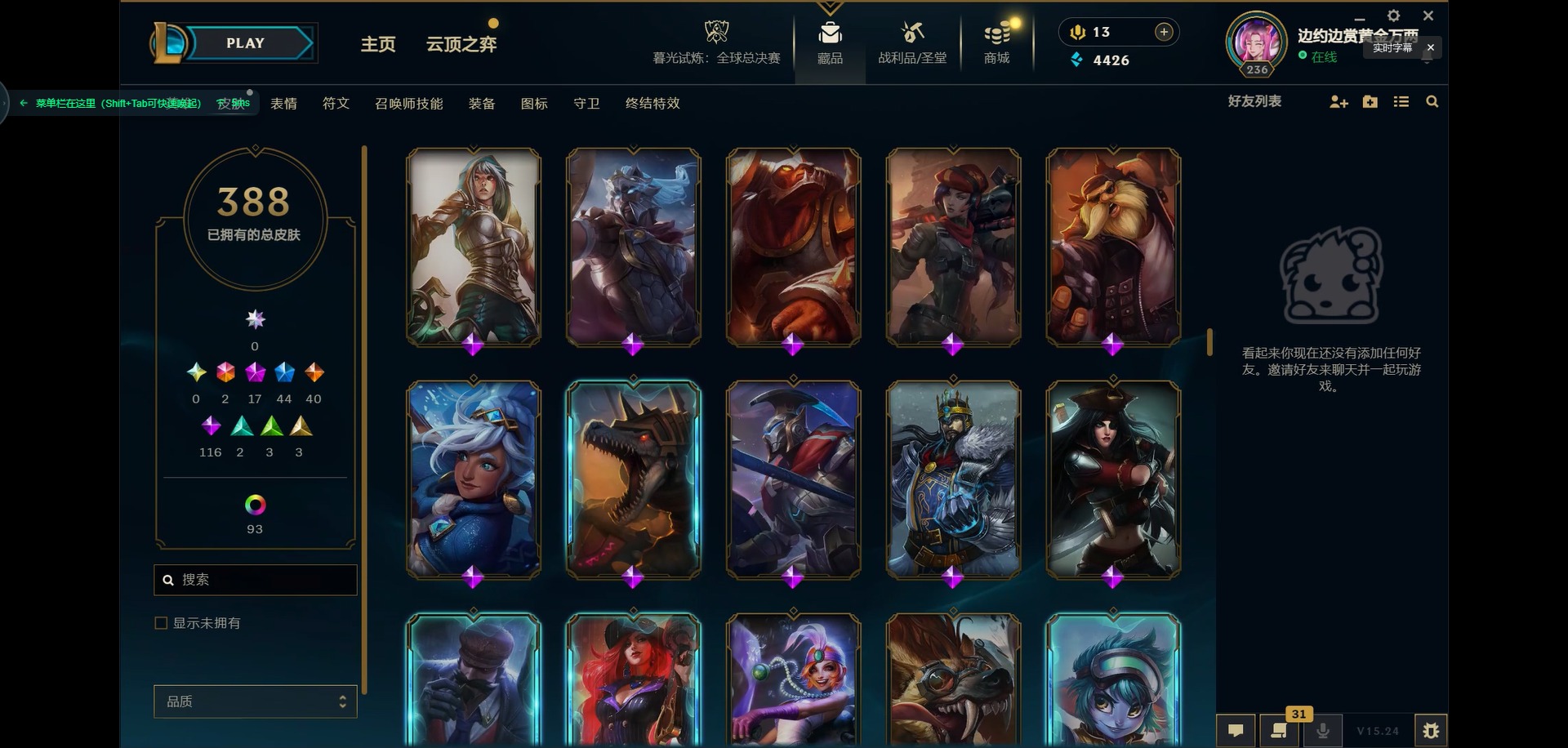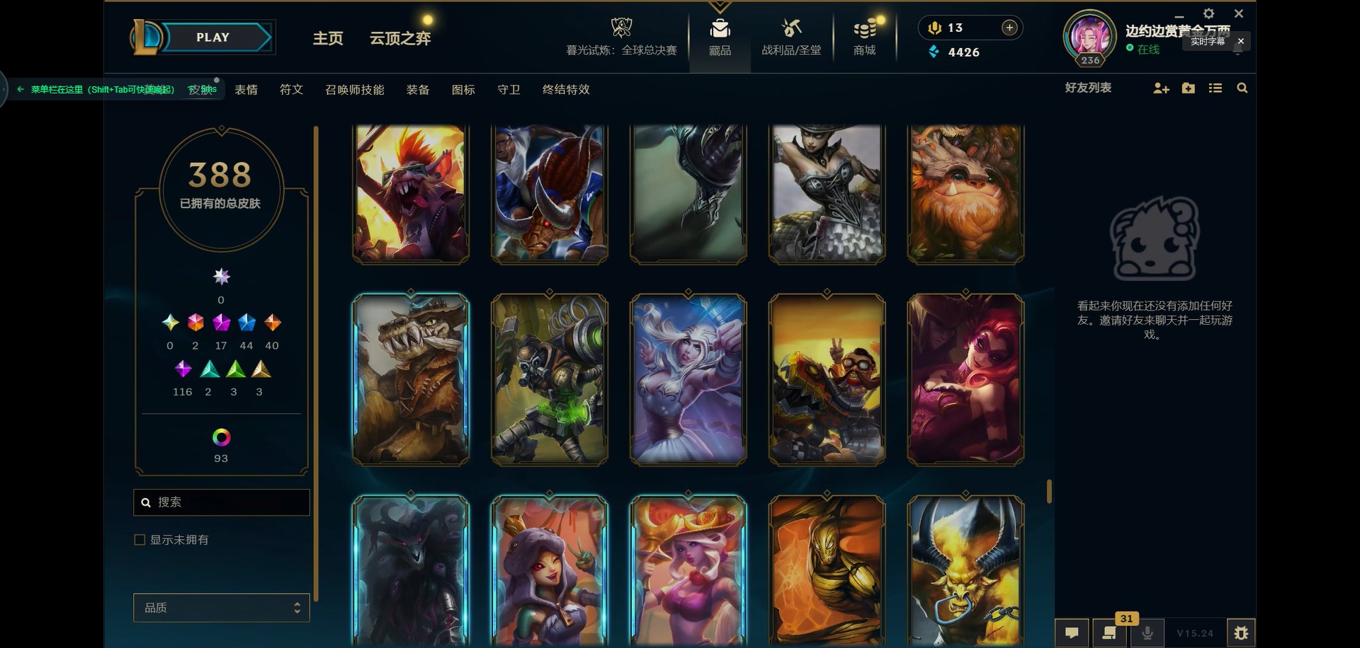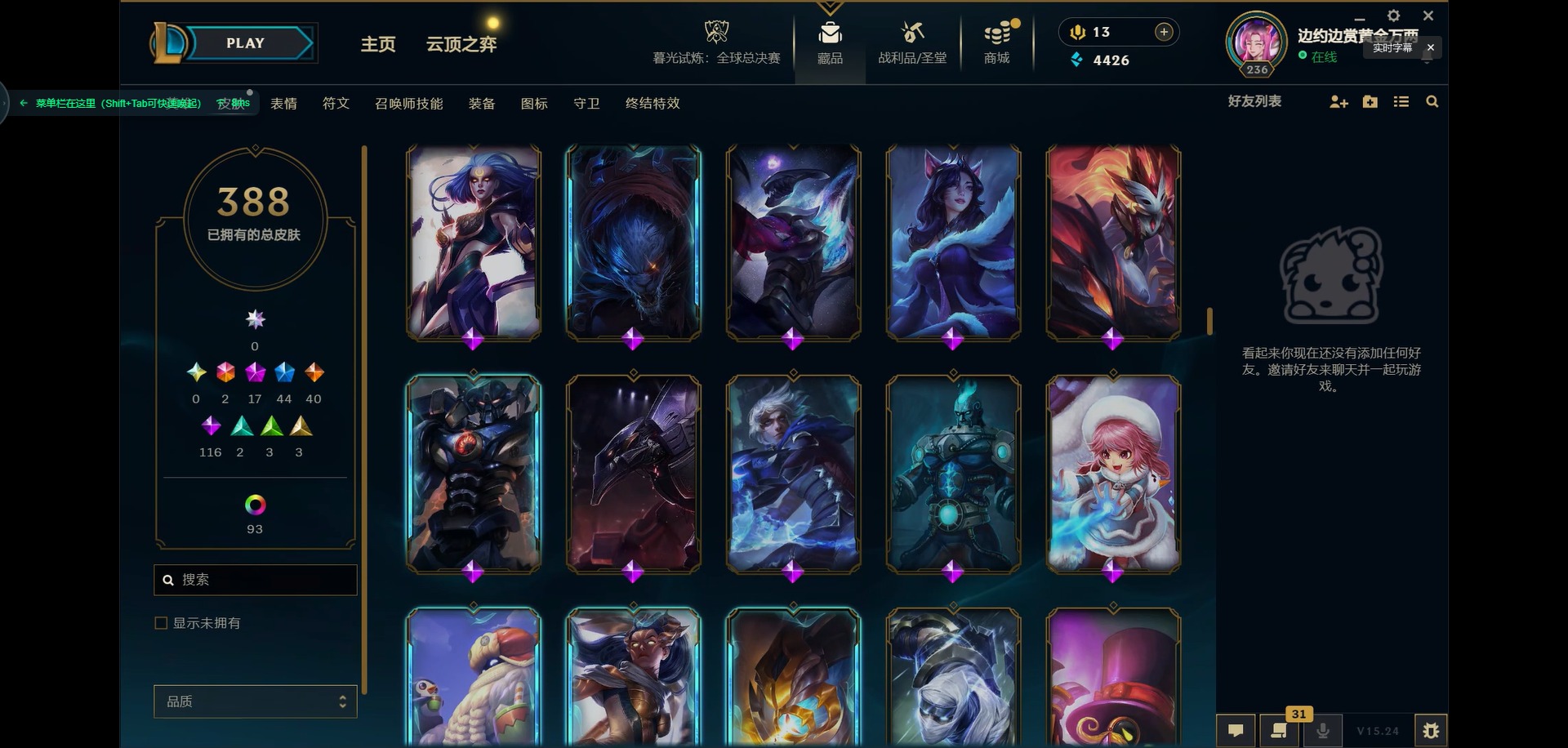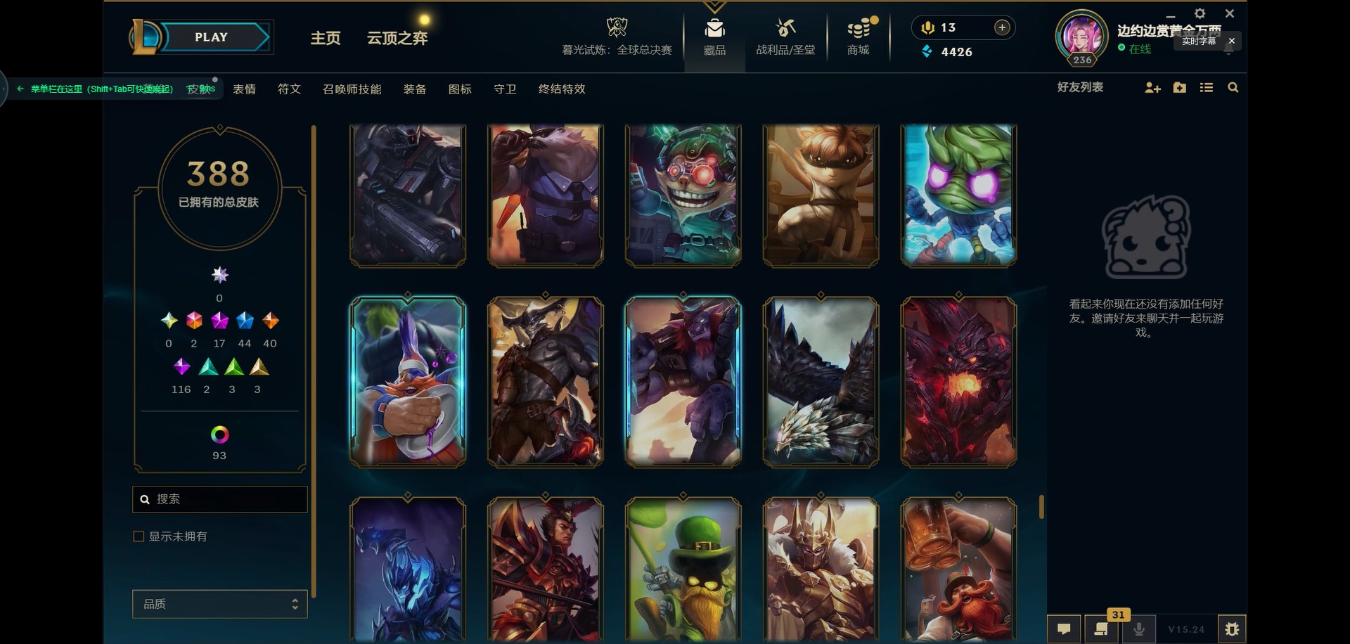 2终极 17神话 44限定 40传说 116史诗 388皮肤 115炫彩 161英雄 可二次 可修改实名 【至臻】至臻 k/da all out卡莎至臻 暗星 墨菲特至臻 王国机神玄武 盖伦至臻 黑夜使者 李青至臻 征服者 贾克斯至臻 腥红之月 亚托克斯至臻 玉剑传说 武剑仙至臻 真