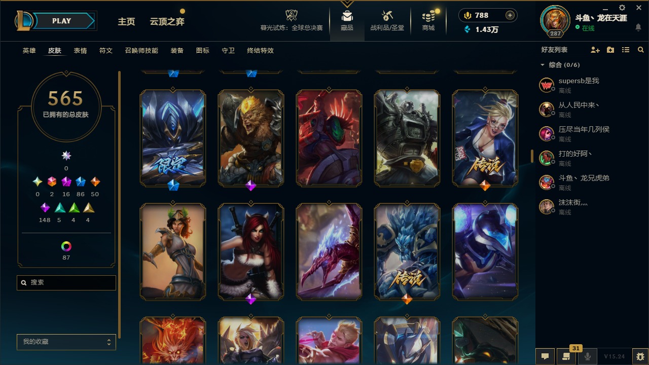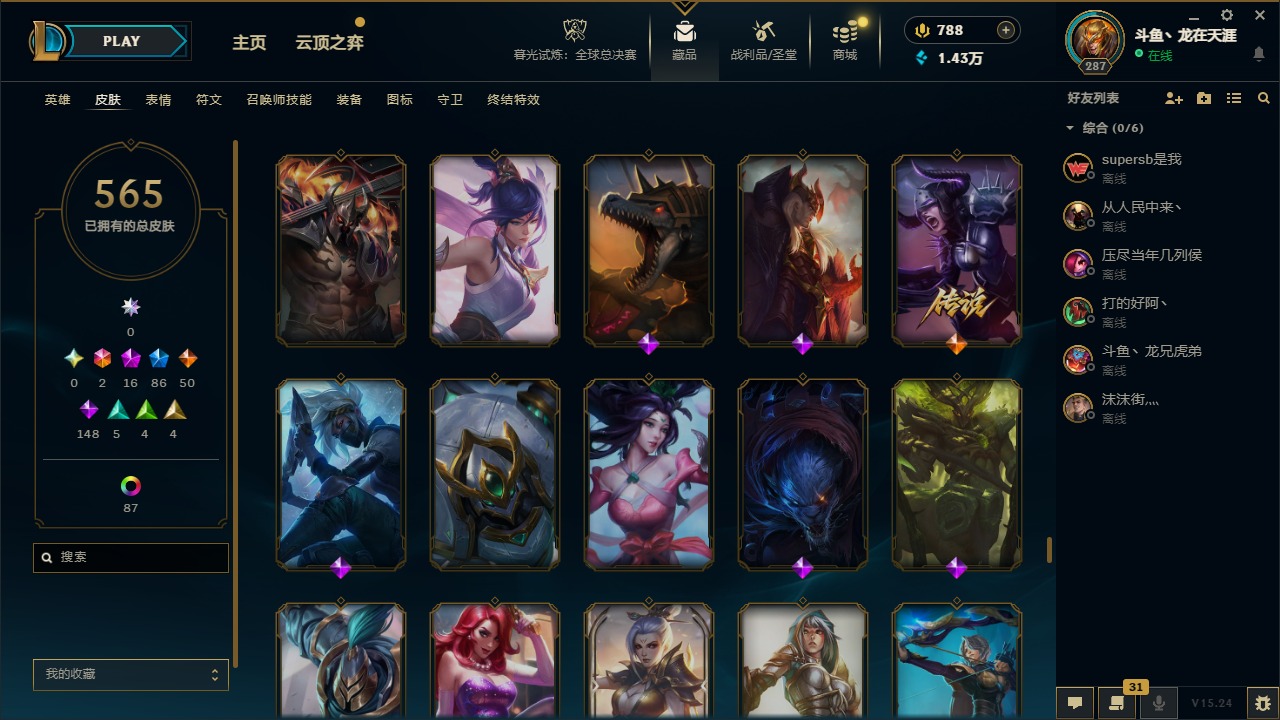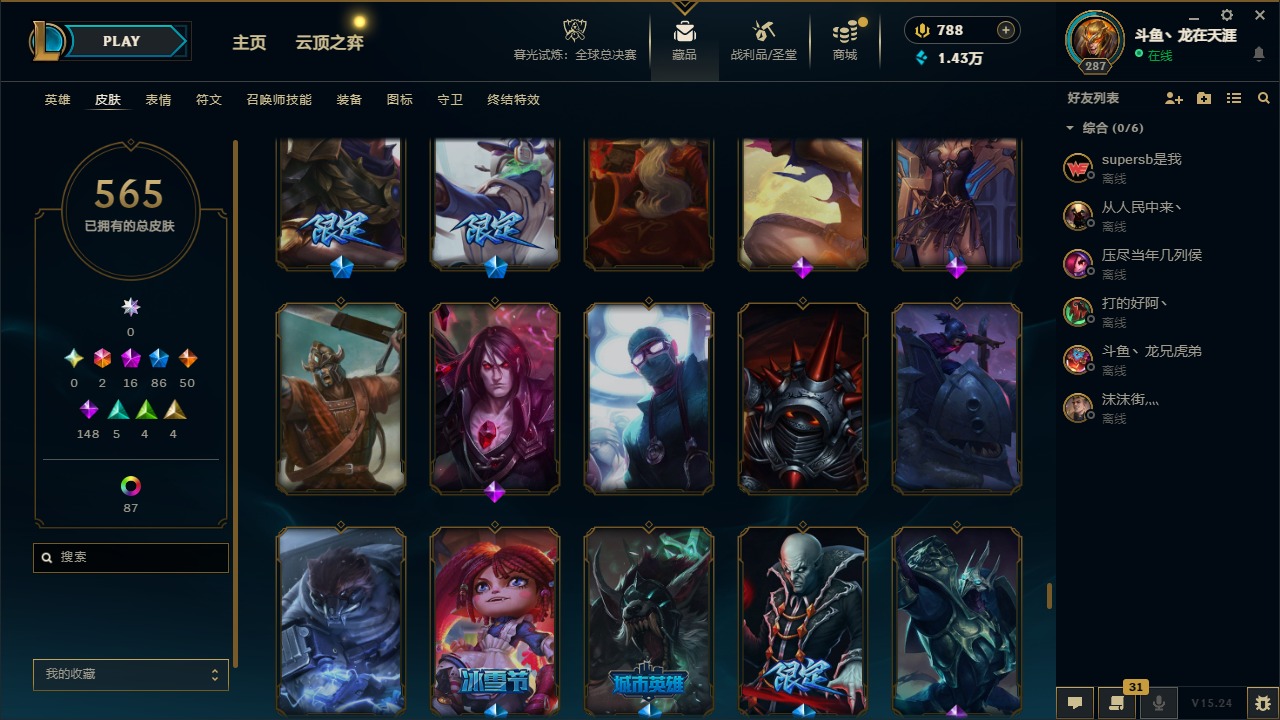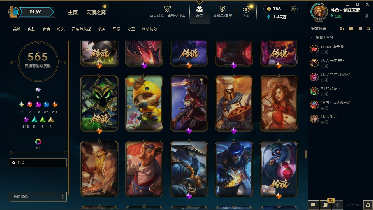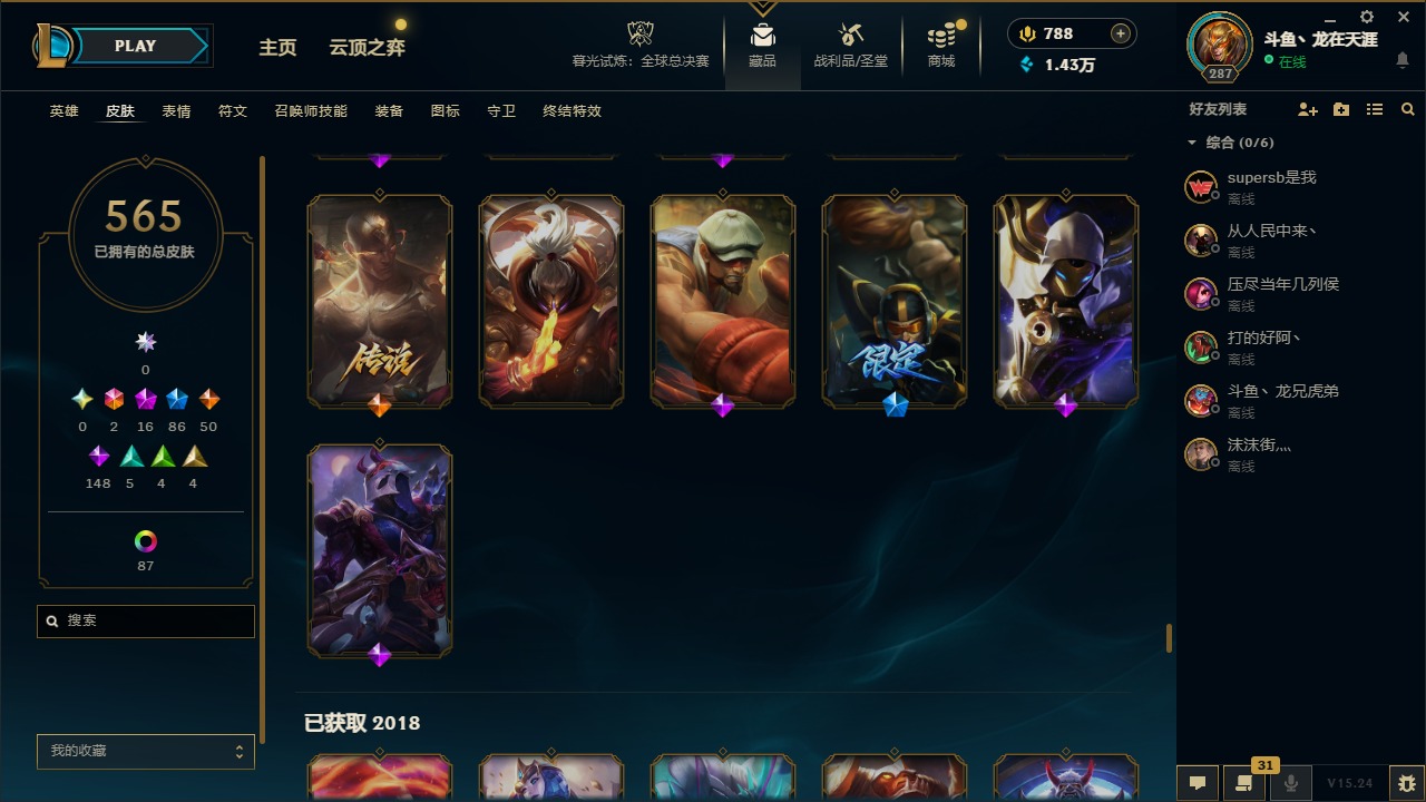 2终极 16神话 86限定 50传说 148史诗 565皮肤 106炫彩 172英雄 可二次 可修改实名 【至臻】至臻 王国机神玄武 盖伦至臻 黑夜使者 李青至臻 腥红之月 亚托克斯至臻 魔女 婕拉至臻 玉剑传说 武剑仙至臻 未来战士 卢锡安至臻 凯旋将军 德莱厄斯至臻 绒毛菲兹