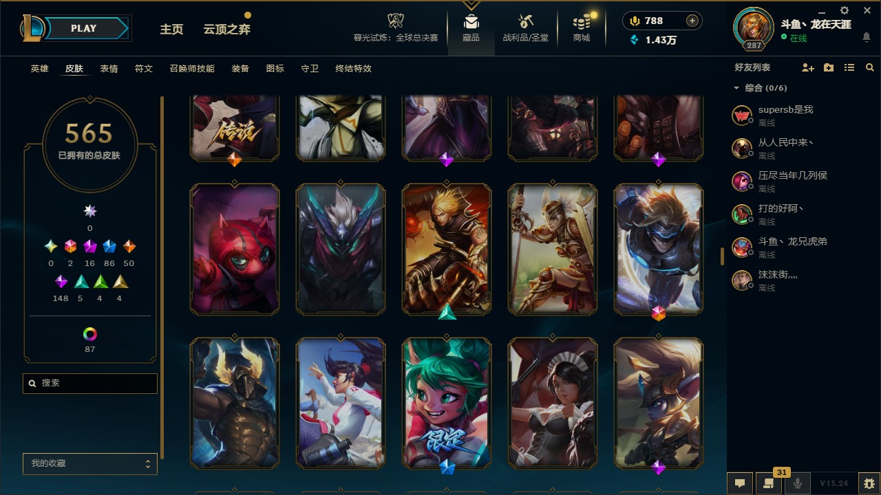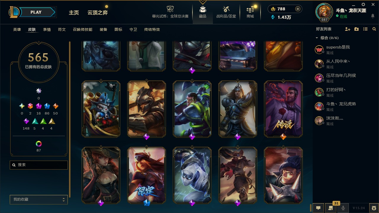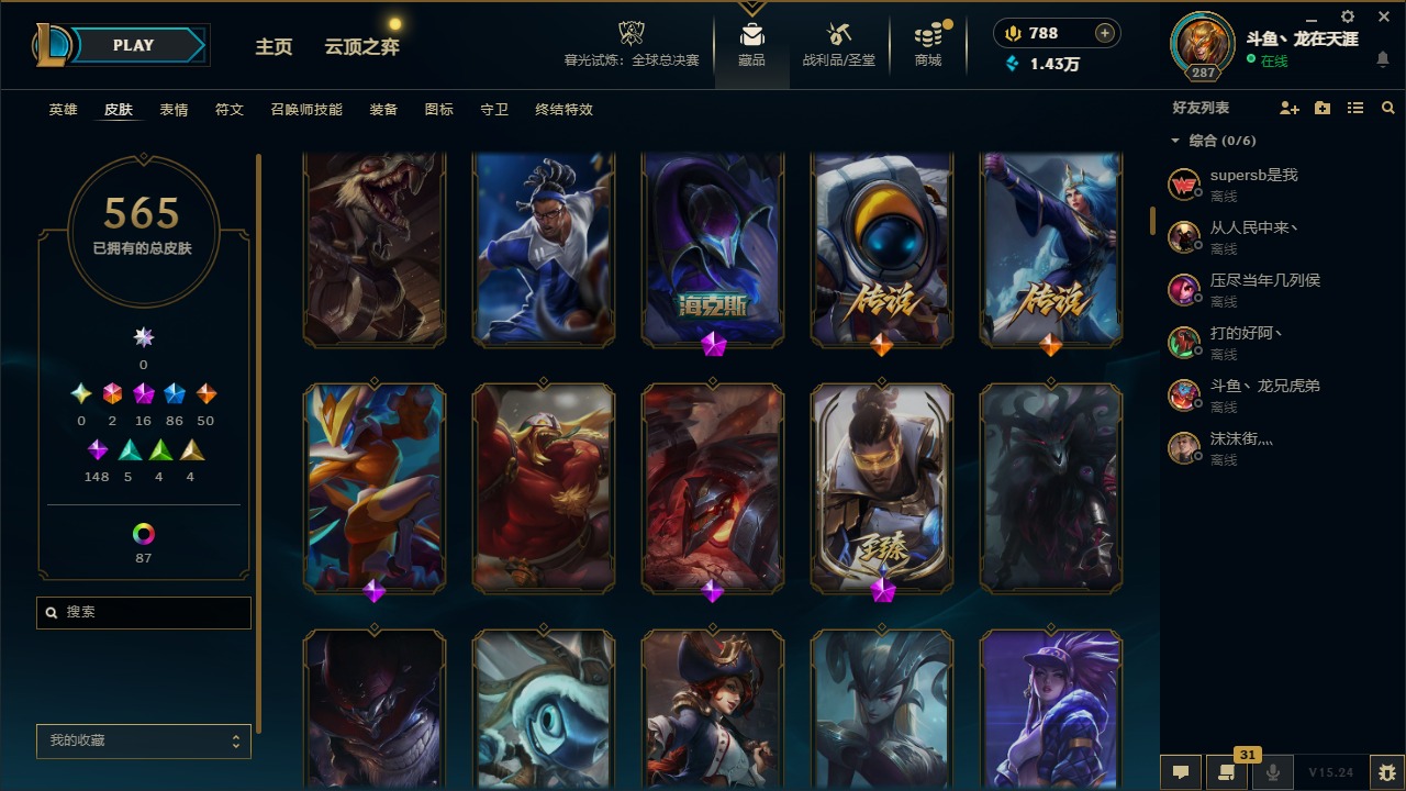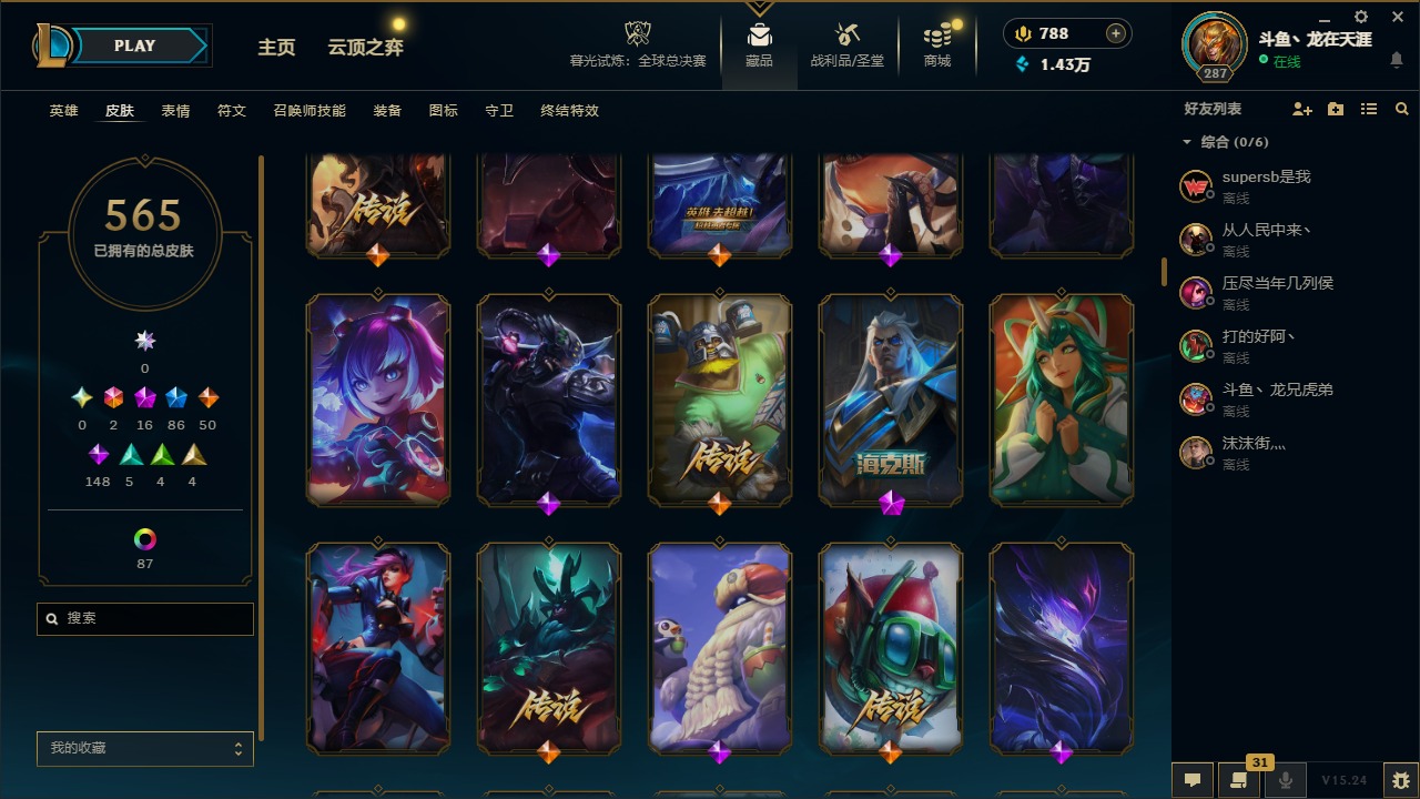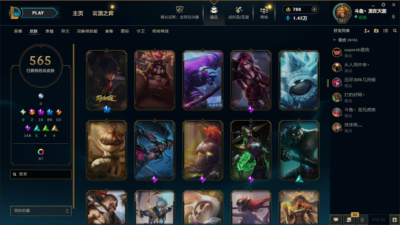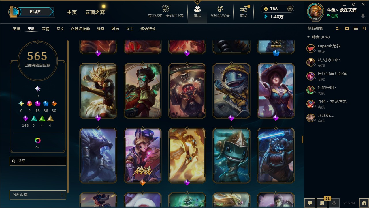2终极 16神话 86限定 50传说 148史诗 565皮肤 106炫彩 172英雄 可二次 可修改实名 【至臻】至臻 王国机神玄武 盖伦至臻 黑夜使者 李青至臻 腥红之月 亚托克斯至臻 魔女 婕拉至臻 玉剑传说 武剑仙至臻 未来战士 卢锡安至臻 凯旋将军 德莱厄斯至臻 绒毛菲兹