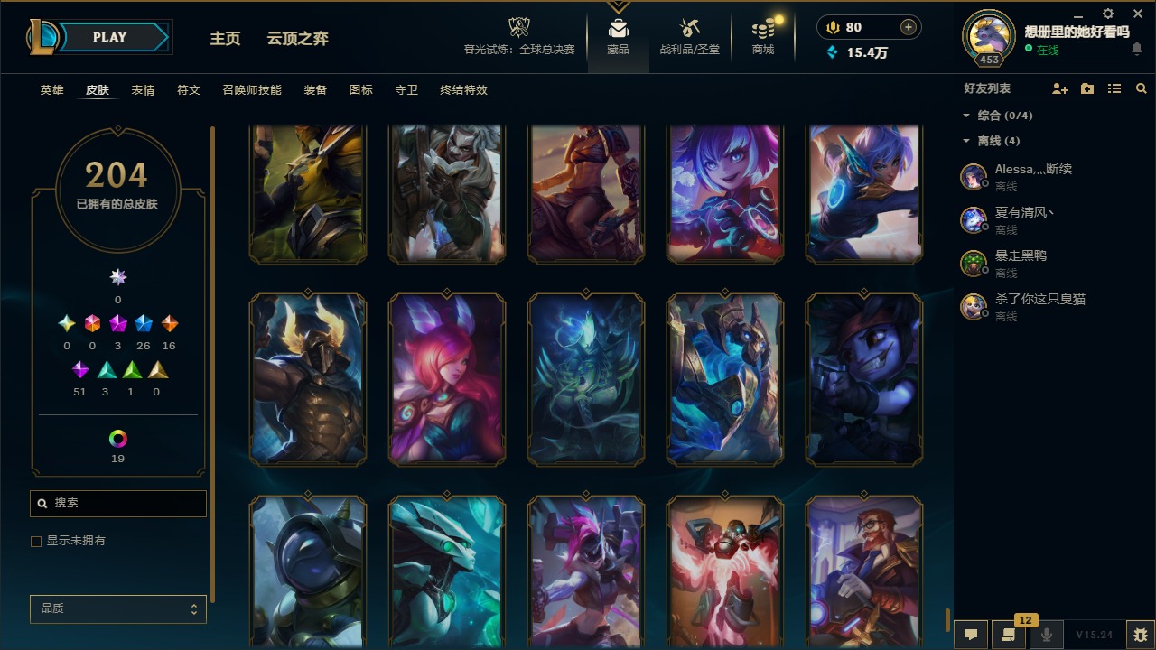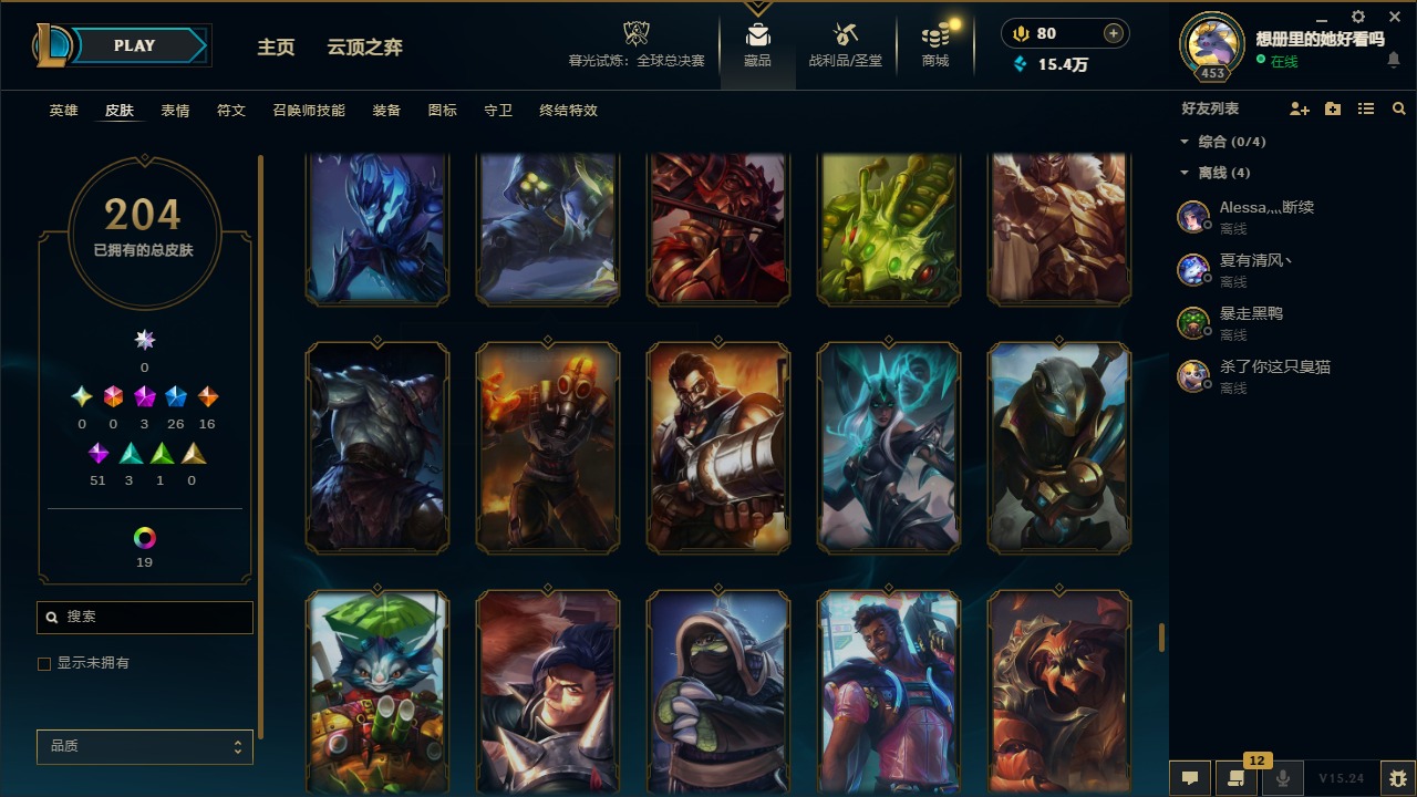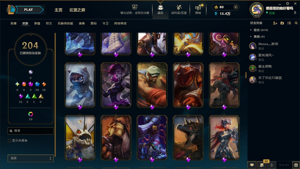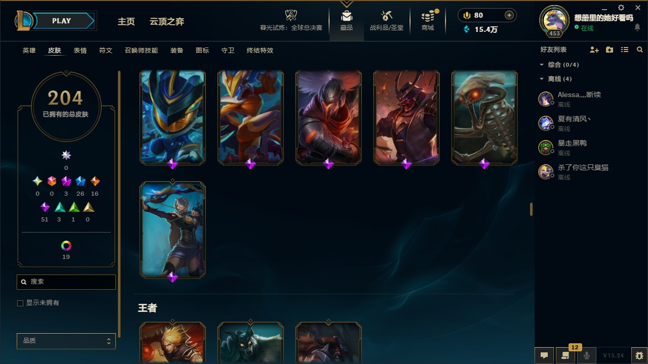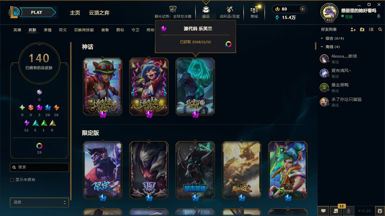 [14653324]3神话 26限定 16传说 51史诗 204皮肤 24炫彩 172英雄 可二次 可修改实名 【赛季限定皮】:胜利女神-菲奥娜胜利之运 崔斯特胜利女神 娑娜胜利巨口 克格莫胜利之王 泰达米尔胜利之剑 亚托克斯胜利呛神 卢锡安胜利机器人 布里茨 【冠军限定系列】:s1fnc 迦娜s2 暗杀星 蒙多s5 skt t1 滑板鞋 【冰雪节限定】:胡桃夹子 萨科魄罗骑士 瑟庄妮圣诞驯鹿 克格莫幸福女神 乐芙兰 【泳池派对】:泳池派对 吉格斯泳池派对 雷克顿 【年限】:天龙之子 斯莫德虎痴之拳 蔚北辰之威 内瑟斯 【周年】:4周年 锐雯10周年 安妮 【其他限定/神话皮】:十五周年纪念 希维尔暗裔英雄 盖伦源代码 乐芙兰防暴天使 凯尔暗影 沃里克都铎王朝 图奇冠军之隐 劫警用试作体k-9 内瑟斯