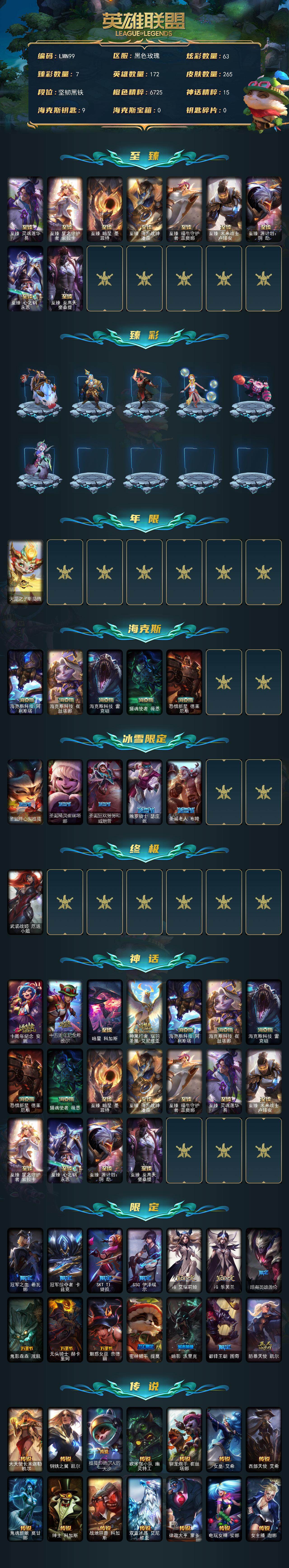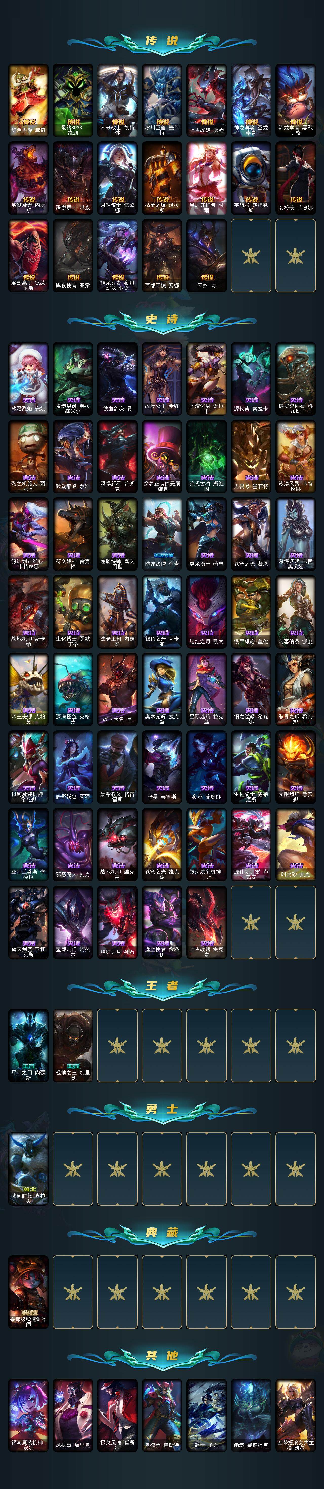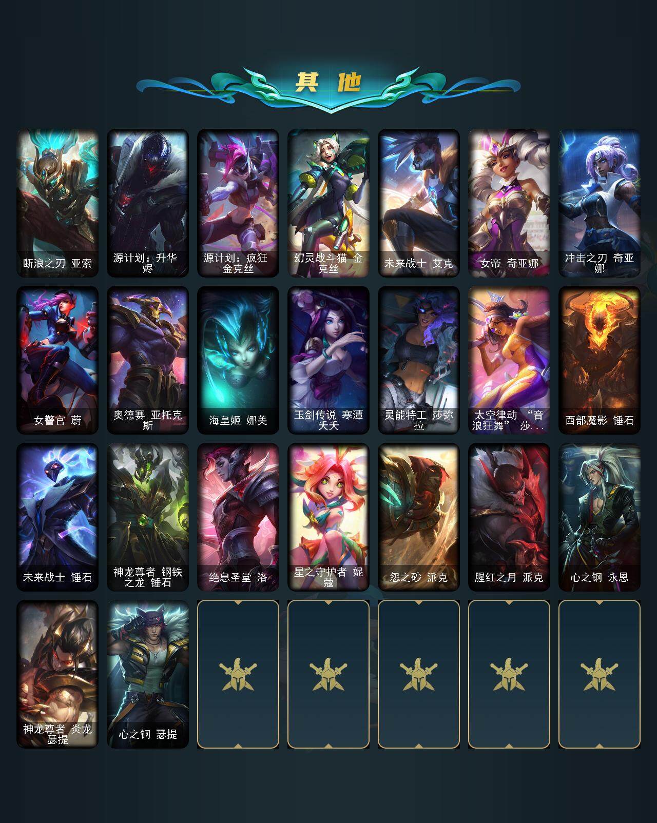 【lmn99】172英雄/265皮肤/1终极/18神话/20限定/7臻彩/63炫彩/33传说/54史诗/黑铁/至臻灵魂莲华易/至臻星之守护者索拉卡/至臻暗星墨菲特/至臻飞升战神潘森/至臻福牛守护者菲奥娜/至臻未来战士卢锡安/至臻源计划阴劫/至臻心之钢永恩/至臻至高天奎桑提/无畏骑士瑟庄妮赤子初心/冠军之志瑞兹凯旋圣装/灰烬守护者慎余烬觉醒/泳池派对辛德拉荔枝枝连击/可爱可爱粉红红布里茨/魔女阿卡丽虚荣/净雪之月莫甘娜冬虹/天龙之子斯莫德/海克斯科技阿利斯塔/海克斯科技崔丝塔娜/海克斯科技雷克顿/摄魂使者薇恩/恐惧新星德莱厄斯/圣诞开心鬼提莫/圣诞精灵崔丝塔娜/圣诞狂欢努努和威朗普/魄罗骑士瑟庄妮/圣诞老人布隆/武装战姬厄运小姐/十周年纪念安妮/十五周年纪念希维尔/暗星科加斯/神凰行者瑞羽圣凰艾尼维亚/冠军之血希瓦娜/冠军掠夺者卡兹克/sktt1婕拉/ssg伊泽瑞尔/ig艾瑞莉娅/ig乐芙兰/暗裔英雄盖伦/鬼影森森茂凯/无头骑士赫卡里姆/魅惑女巫奈德丽/密林猎手提莫/暗影沃里克/都铎王朝图奇/防暴天使凯尔/大天使长米迦勒凯尔/钢铁之翼凯尔/提莫约德尔人的一大步/欧米伽小队幽灵特工/驯龙炮手崔丝塔娜/女皇艾希/西部天使艾希/鬼魂新娘莫甘娜/绅士科加斯/战地巨兽科加斯/双重冰晶艾尼维亚/律政大亨蒙多/电玩女神娑娜/女主播迦娜/红色男爵库奇/最终boss维迦/未来战士凯特琳/冰川巨兽墨菲特/上古战魂魔腾/神龙尊者圣龙李青/驯龙学者黑默丁格/炼狱魔犬内瑟斯/屠龙勇士潘森/月蚀骑士蕾欧娜/枯萎之壤泽拉斯/星之守护者阿狸/宇航员诺提勒斯/女校长菲奥娜/灌篮高手德莱厄斯/黑夜使者亚索/神龙尊者夜月幻龙亚索/西部天使赛娜/天煞劫/冰霜烈焰安妮/摄魂男爵弗拉基米尔/铁血剑豪易/战场公主希维尔/圣洁化身索拉卡/源代码索拉卡/侏罗纪化石科加斯/殇之机器人阿木木/武动巅峰萨科/恐惧新星普朗克/穿着正装的恶魔维迦/绝代智将斯维因/无畏号墨菲特/沙漠风暴卡特琳娜/源计划雄心卡特琳娜/符文战神雷克顿/龙骑统帅嘉文四世/防弹武僧李青/屠龙勇士薇恩/苍穹之光薇恩/深海妖姬卡西奥佩娅/战地机甲斯卡纳/生化博士黑默丁格/法老王朝内瑟斯/银色之牙阿卡丽/腥红之月凯南/铁甲雄心盖伦/刺客信条锐雯/帝王斑蝶克格莫/深海怪鱼克格莫/战国大名慎/奥术光辉拉克丝/星际迷航拉克丝/钢之逆鳞希瓦娜/骸骨之爪希瓦娜/银河魔装机神希瓦娜/暗影妖狐阿狸/黑帮教父格雷福斯/暗星韦鲁斯/夜鸦菲奥娜/生化骑士德莱厄斯/无限烈焰黛安娜/亚特兰蒂斯辛德拉/邪恶魔人扎克/战地机甲维克兹/苍穹之光维克兹/银河魔装机神千珏/源计划雷卢锡安/时之砂艾克/霸天剑魔亚托克斯/星际之门阿兹尔/腥红之月锤石/虚空使者俄洛伊/上古战魂雷克塞/星空之门内瑟斯/战地之王加里奥/冰河时代奥拉夫/宗师级锻造训练师/银河魔装机神安妮/风执事加里奥/探戈灵魂崔斯特/奥德赛崔斯特/赵云子龙/幽魂费德提克/五杀摇滚女声主唱凯尔/黑暗骑士阿利斯塔/哞利斯塔/黯晶巨牛阿利斯塔/部落精神瑞兹/星界圣骑赛恩/腥红之月希维尔/约德尔海贼团崔丝塔娜/神龙尊者苍龙艾希/勇敢的心泰达米尔/梦魇泰达米尔/武神贾克斯/玉剑传说苍鸾/腥红之月基兰/科学狂人辛吉德/惊天魔盗伊芙琳/北风冻原图奇/横行霸道图奇/绝影神偷图奇/幽灵幻影卡尔萨斯/铬金铠甲拉莫斯/极度深寒拉莫斯/联盟之喙艾尼维亚/小丑工作坊萨科/嗜血行刑蒙多/虚空前世卡萨丁/源计划正义艾瑞莉娅/光明哨兵艾瑞莉娅/玉剑传说风仙子/幽灵船长普朗克/冰壶选手维迦/绿野仙踪维迦/巡逻警官特朗德尔/屠龙勇士特朗德尔/铁锈斑斑布里茨/戴一个表布里茨/战场boss布里茨/银白呛骑布里茨/奥德赛墨菲特/战斗学院卡特琳娜/腥红之月卡特琳娜/烈焰古树茂凯/绿茵门神茂凯/鳄霸雷克顿/黯晶巨鳄雷克顿/屠龙勇士嘉文四世/战斗学院孙悟空/苍穹之光布兰德/独眼海盗兰博/上古魔蛇卡西奥佩娅/创世之神内瑟斯/太空律动狗头内瑟斯/法国女仆奈德丽/银河魔装机神奈德丽/宇航员波比/乡村农夫古拉加斯/狂热球迷古拉加斯/光明骑士古拉加斯/英仙座珀尔修斯潘森/光执事伊泽瑞尔/灵能特工伊泽瑞尔/龙骑士莫德凯撒/地狱送葬约里克/空手道凯南/海上霸主盖伦/德玛西亚警官盖伦/烧烤女神蕾欧娜/荣誉使者玛尔扎哈/刺客信条泰隆/血色精锐泰隆/未来战士锐雯/玉剑传说武剑仙/毛毛虫克格莫/小蜜蜂克格莫/炎爆慎/未来战士慎/暗星泽拉斯/战斗教授格雷福斯/失落大陆菲兹/兔宝宝菲兹/绒毛菲兹/雷霆领主沃利贝尔/坚韧不屈沃利贝尔/雷喵喵尔/初号机维克托/造物主维克托/野兽女王瑟庄妮/死亡骑士瑟庄妮/少校吉格斯/糖果大战吉格斯/糖果女巫璐璐/邪恶女巫璐璐/灵魂收割者德莱文/泳池派对德莱文/破败军团德莱文/魂蔷薇德莱文/血石骑士赫卡里姆/创世之神赫卡里姆/奥德赛卡兹克/西部魔影德莱厄斯/战斗学院杰斯/死亡之鹰奎因/鬼影森森婕拉/kdaallout卡莎/银河魔装机神纳尔/灵魂莲华亚索/断浪之刃亚索/源计划升华烬/源计划疯狂金克丝/幻灵战斗猫金克丝/未来战士艾克/女帝奇亚娜/冲击之刃奇亚娜/女警官蔚/奥德赛亚托克斯/海皇姬娜美/玉剑传说寒潭夭夭/灵能特工莎弥拉/太空律动音浪狂舞莎弥拉/西部魔影锤石/未来战士锤石/神龙尊者钢铁之龙锤石/绝息圣堂洛/星之守护者妮蔻/怨之砂派克/腥红之月派克/心之钢永恩/神龙尊者