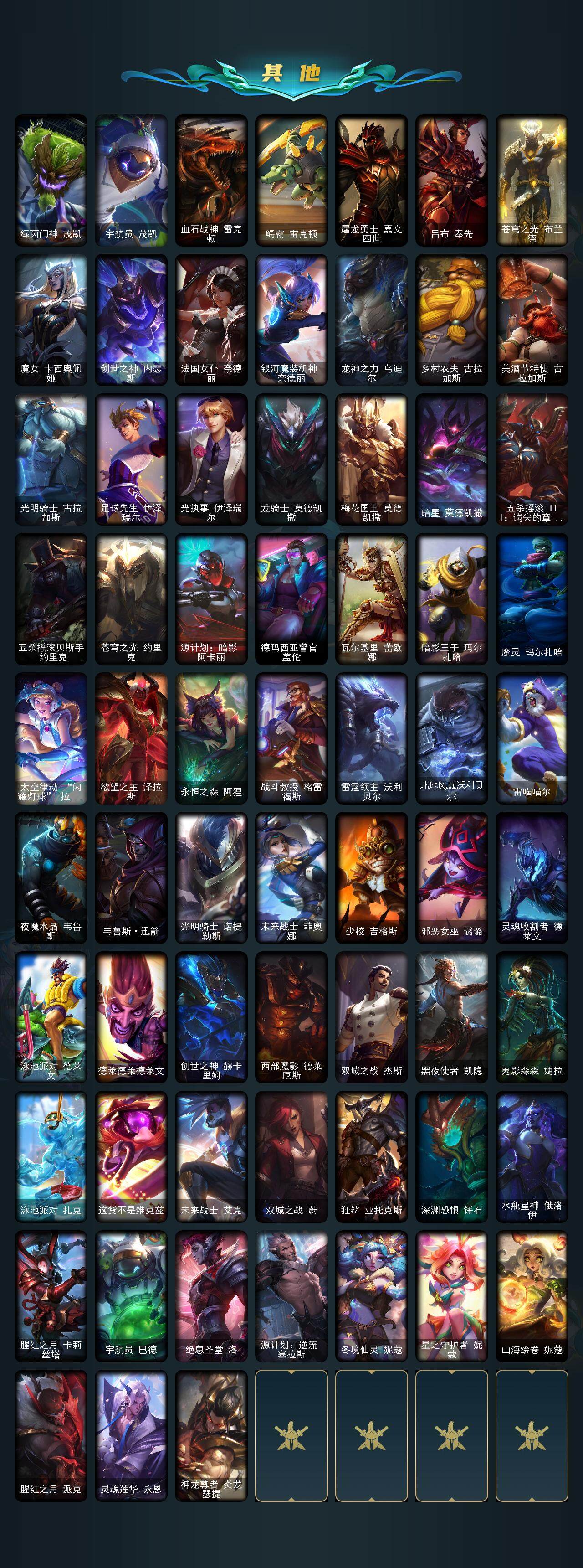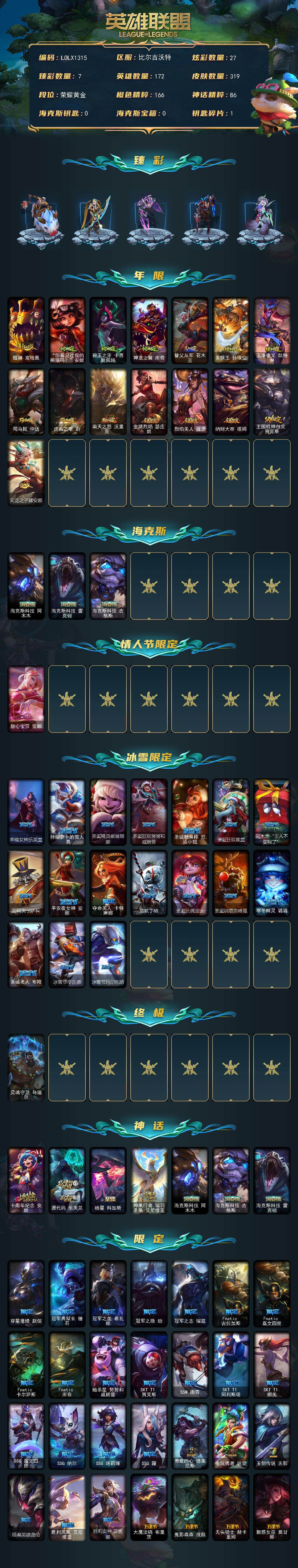 【lolx1315】172英雄/319皮肤/1终极/7神话/76限定/7臻彩/27炫彩/37传说/63史诗/黄金/天龙之子 卡莎 飞龙乘云/无畏骑士瑟庄妮赤子初心/冠军之箭艾希凯旋圣装/天煞劫恒星游历者/玉剑传说无劫胭脂/魔女 阿卡丽 虚荣/净雪之月莫甘娜冬虹/龙年醒狮克格莫/蛇年安妮/碧玉之牙卡西奥佩娅/神龙之翼库奇/马年锐雯/猴年美猴王孙悟空/猴年凯特琳/鸡年司马懿仲达阿兹尔/鸡年蔚/南天