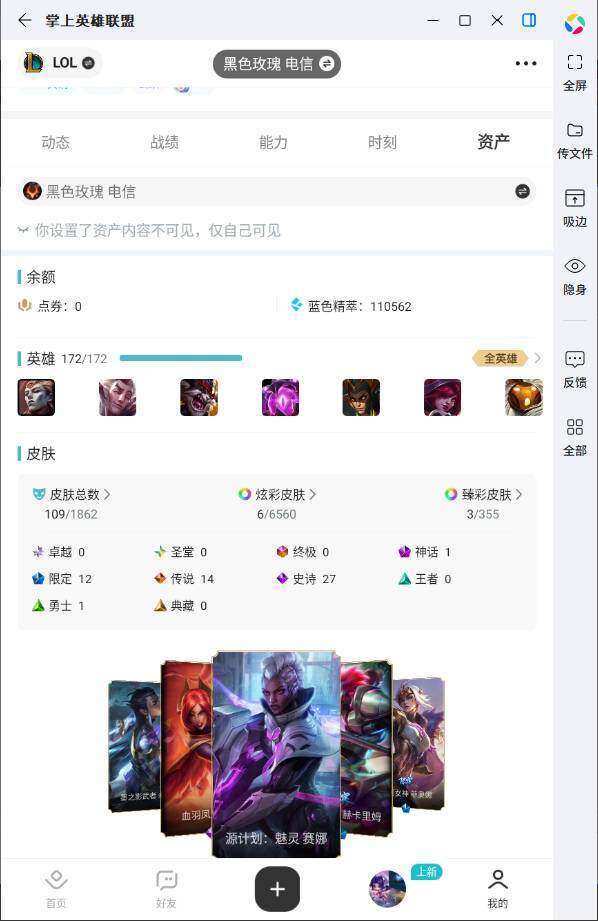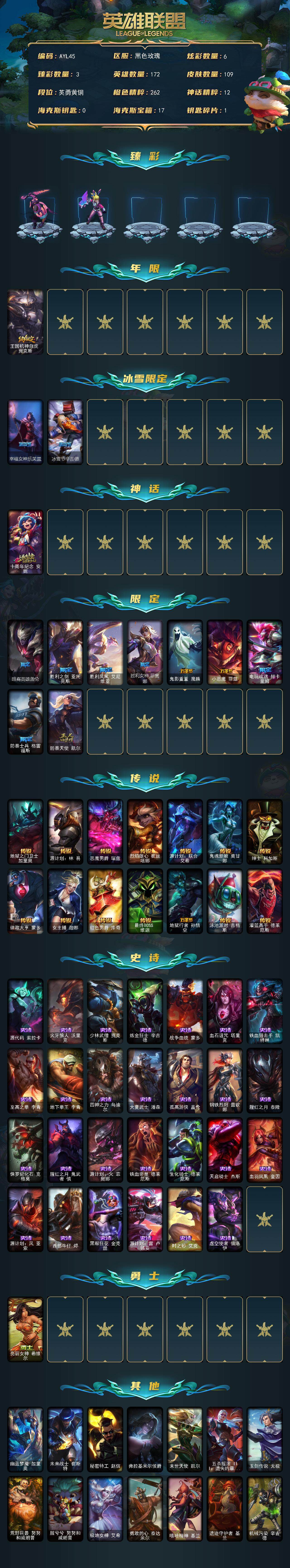 【店主推荐捡漏号!可直接换绑】青铜段位-172英雄-109皮肤-6炫彩-0终极-1神话-12限定-14传说-27史诗 【臻彩皮肤】:源计划毁灭派克幻灭,幻灵战斗兔锐雯梦幻强袭,魔女阿卡丽虚荣 【年限皮肤】:王国机神白虎贾克斯 【冰雪限定】:幸福女神乐芙兰,冰雪节辛吉德 【神话皮肤】:十周年纪念安妮 【限定皮肤】:暗裔英雄盖伦,胜利之剑亚托克斯,胜利凤凰艾尼维亚,胜利女神菲奥娜,鬼影重重魔腾,小恶魔菲兹,电玩战魂赫卡里姆,防暴士兵格雷福斯,防暴天使凯尔 【传说皮肤】:地狱之门卫士加里奥,源计划林易,恶魔男爵瑞兹,烈焰雄心崔丝塔娜,源计划联合艾希,鬼魂新娘莫甘娜,绅士科加斯,律政大亨蒙多,女主播迦娜,红色男爵库奇,最终boss维迦,地狱行者孙悟空,泳池派对吉格斯,灌篮高手德莱厄斯 【史诗皮肤】:源代码索拉卡,火牙狼人沃里克,少林武僧贾克斯,炼金狂士辛吉德,战争血统蒙多,血石诅咒塔里克,铁血狙击手凯特琳,至高之拳李青,地下拳王李青,四神之力乌迪尔,大夏武士潘森,孤高游侠盖伦,钢铁烈阳蕾欧娜,腥红之月泰隆,侏罗纪化石克格莫,腥红之月鬼武者慎,源计划火菲奥娜,铁血帝皇德莱厄斯,生化骑士德莱厄斯,天启骑士杰斯,血羽凤凰奎因,源计划风亚索,西部牛仔烬,黑帮狂花金克丝,源计划雷卢锡安,时之砂艾克,虚空使者俄洛伊 【勇士皮肤】:亮丽女神希维尔 【其他皮肤1】:幽蓝梦魇加里奥,未来战士崔斯特,秘密特工赵信,弗拉基米尔侯爵,末世天使凯尔,五杀摇滚iii遗失的章节凯尔,玉剑传说无极,荒野巨兽努努和威朗普,脏兮兮努努和威朗普,极地女神艾希,勇敢的心泰达米尔,嘻哈精神基兰,遗迹守护者基兰,机械污染辛吉德,假面女皇伊芙琳,情绪摇滚阿木木,健美教练蒙多,深海一号卡萨丁,莲花之令艾瑞莉娅,大力水手普朗克,樱花乱舞卡尔玛,紫水晶意志塔里克,冰壶选手维迦,赏金猎人卡特琳娜,烈焰古树茂凯,图腾古树茂凯,血石战神雷克顿,猎天使魔女薇恩,荒漠之咬卡西奥佩娅,蛇发女妖卡西奥佩娅,远土之灵斯卡纳,诺克萨斯波比,乡村农夫古拉加斯,电玩勇者伊泽瑞尔,五杀摇滚吉他手莫德凯撒,地狱送葬约里克,喵里克,五杀摇滚iii遗失的章节约里克,源计划暗影阿卡丽,银色闪电凯南,烧烤女神蕾欧娜,毛毛虫克格莫,炎爆慎,游侠法师拉克丝,杀出重围格雷福斯,全金属狂潮维克托,糖果女巫璐璐,血石骑士赫卡里姆,幽魂骑士赫卡里姆,电玩女神卡莎,源计划魅灵赛娜,水瓶星神俄洛伊,腥红之月派克,墨之影武者永恩
