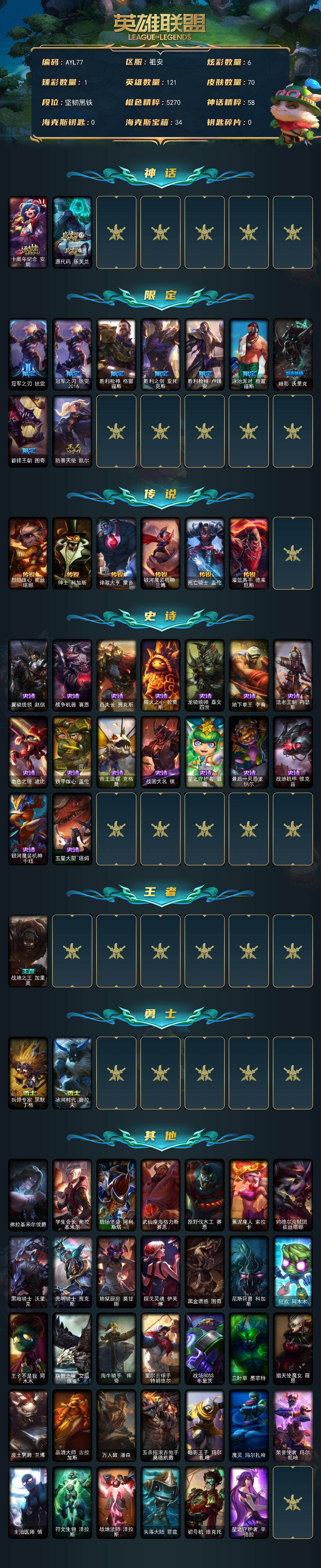 121英雄-70皮肤-可二次【店主推荐捡漏号!可直接换绑】 黑铁段位-121英雄-70皮肤-6炫彩-0终极-2神话-9限定-6传说-16史诗 【臻彩皮肤】:魔女阿狸饕餮 【神话皮肤】:十周年纪念安妮,源代码乐芙兰 【限定皮肤】:冠军之刃锐雯,冠军之刃锐雯2016,胜利呛神格雷福斯,胜利之剑亚托克斯,胜利呛神卢锡安,泳池派