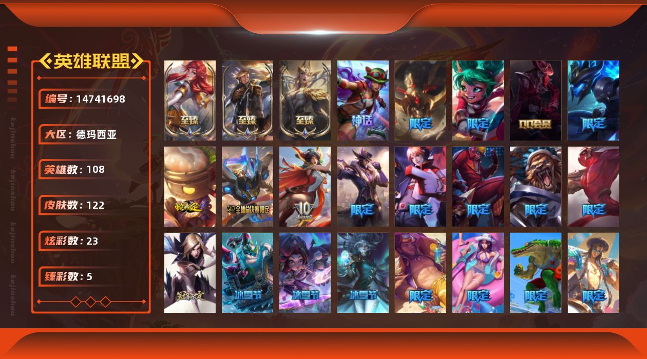 [14741698]白银段位-108英雄-122皮肤-23炫彩-0终极-6神话-23限定-16传说-8史诗 【热门头像】:爱情之歌头像,kda阿卡丽头像 【至臻皮肤】:至臻魔女乐芙兰,至臻暗裔英雄嘉文四世,至臻灵能特工伊泽瑞尔,至臻战斗学院拉克丝,至臻t1塞拉斯 【臻彩皮肤】:冠军典狱长锤石凯旋圣装,西部魔影卢锡安贝利尔之怠,星之守护者辛德拉未来之光,泳池派对辛德拉荔枝枝连击,幻灵战斗队长厄运小姐勇气赞歌 【年限皮肤】:点心宝贝阿木木 【冰雪限定】:邪恶圣诞老人维迦,北极星神黛安娜,北极星守望者佐伊 【神话皮肤】:十五周年纪念希维尔,至臻灵能特工伊泽瑞尔,至臻魔女乐芙兰,至臻战斗学院拉克丝 【限定皮肤】:冠军之矛卡莉丝塔,2022全球总决赛阿兹尔,暗杀星伊泽瑞尔,sktt1李青,ssw雷恩加尔,sktt1扎克,ig卡莎,t1永恩,神凰行者烈羽焰凰霞,暗裔英雄盖伦,胜利之运崔斯特,死亡誓约劫,泳池派对嘉文四世,泳池派对凯特琳,泳池派对雷克顿,波比的巧克力工坊,红桃杰克崔斯特,征服者阿利斯塔,海之歌永恩 【传说皮肤】:地狱之门卫士加里奥,大天使长米迦勒凯尔,欧米伽小队幽灵特工,恶魔之刃泰达米尔,光明哨兵薇恩,银河魔装机神兰博,苍穹之光韦鲁斯,女校长菲奥娜,神王德莱厄斯,黑夜使者亚索,西部魔影卢锡安,真实伤害艾克,暗星锤石,黎明使者永恩,西部魔影永恩,狼神英灵安蓓萨 【史诗皮肤】:战争机器赛恩,法国皇室厄运小姐,驯龙大师斯维因,至高之拳李青,暗黑女武神黛安娜,勇敢的心奎因,腥红之月烬,源计划阴劫 【王者皮肤】:西部牛仔崔斯特 【其他皮肤1】:幽蓝梦魇加里奥,龙族卫士加里奥,太空律动万能舞王崔斯特,黯晶巨牛阿利斯塔,伏虎之力希维尔,关羽云长,武神贾克斯,净雪之月莫甘娜,地狱火卡尔萨斯,莲华温泉娑娜,深海一号卡萨丁,神龙尊者星界之龙卡萨丁,柯基库奇,破败军团卡尔玛,宇航员茂凯,黑色玫瑰假面舞会伊莉丝,战斗学院孙悟空,妖怪艺术家布兰德,天蝎星神斯卡纳,黑夜使者内瑟斯,这货不是乌迪尔,未来战士潘森,心之钢伊泽瑞尔,喵里克,至高天阿卡丽,战斗学院盖伦,神圣守卫蕾欧娜,小蜜蜂玛尔扎哈,奥术师克格莫,永恒之森阿狸,魅惑之月阿狸,莲华温泉沃利贝尔,净雪之月韦鲁斯,未来战士菲奥娜,女帝菲奥娜,小蜜蜂吉格斯,睡衣守护者璐璐,咖啡甜心璐璐,愚乐之巫璐璐,破败军团德莱文,人马星神赫卡里姆,西部魔影德莱厄斯,战斗学