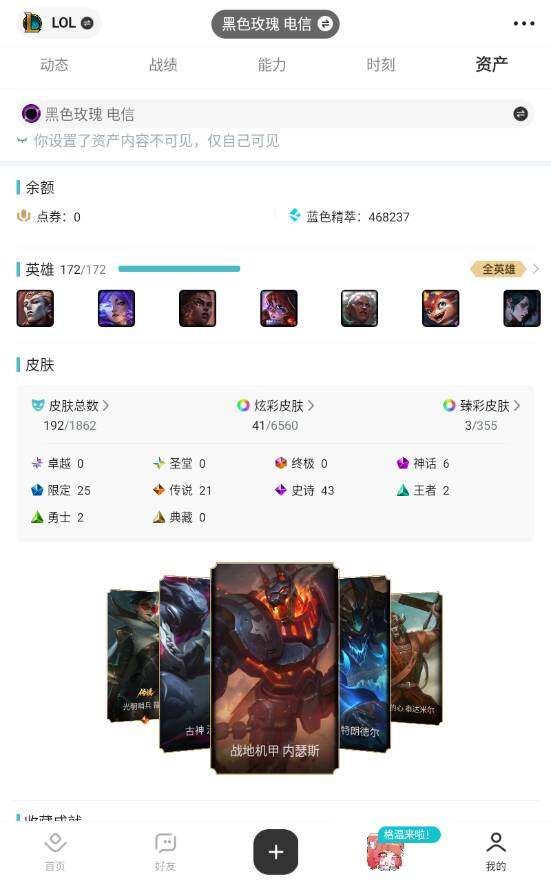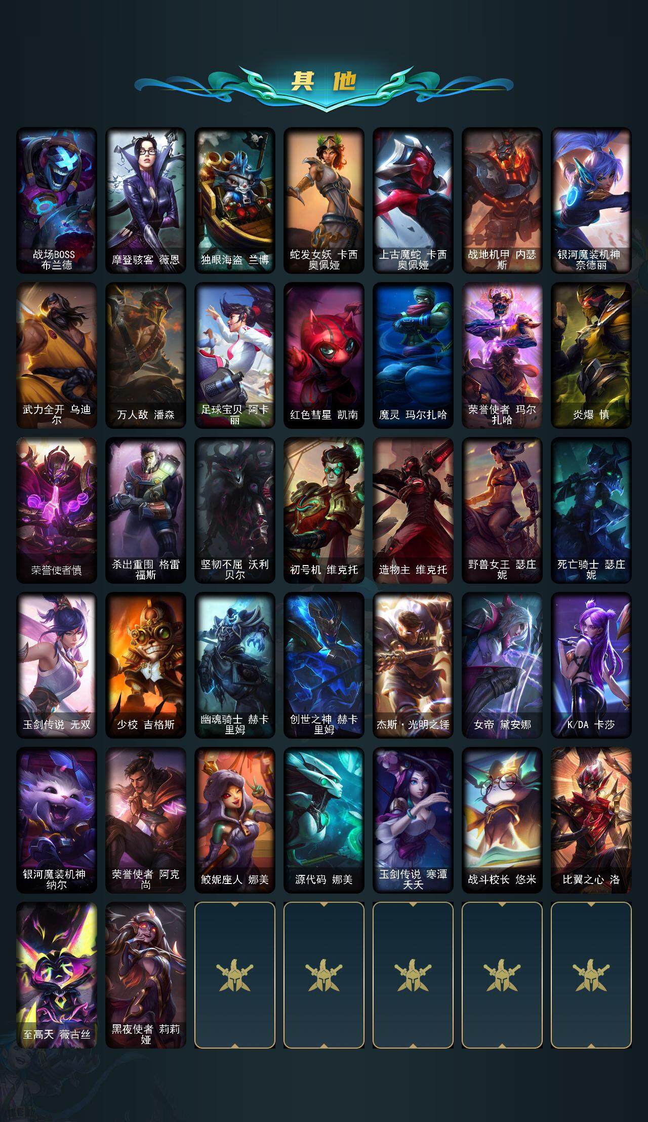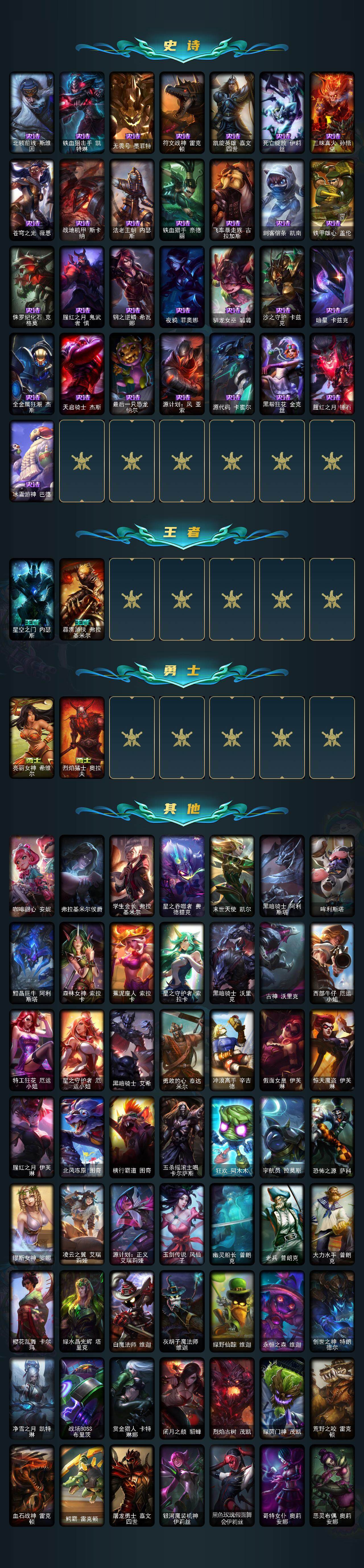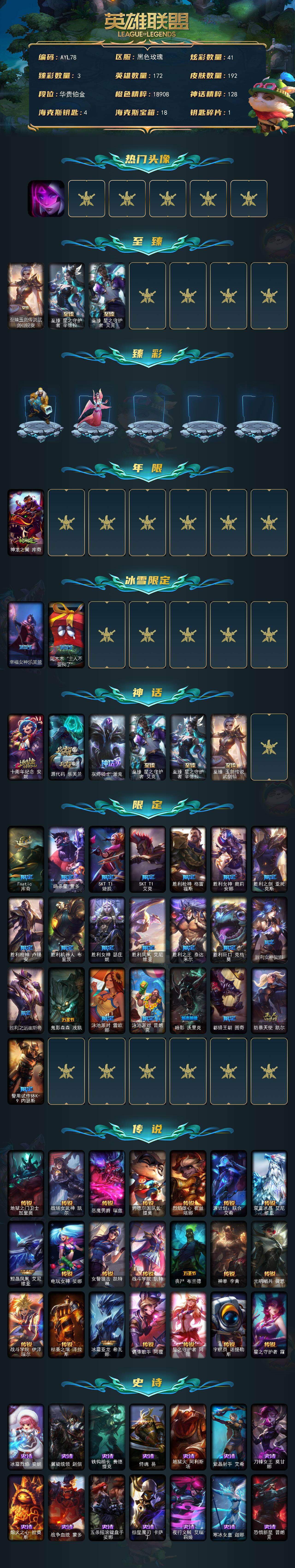 172英雄-192皮肤-铂金段位-172英雄-192皮肤-41炫彩-0终极-6神话-25限定-21传说-43史诗 【热门头像】:源计划刀妹头像 【至臻皮肤】:至臻玉剑传说武剑仙锐雯,至臻星之守护者辛德拉,至臻星之守护者艾克 【臻彩皮肤】:冰雪节格雷福斯炫金,玉剑传说苍鸾丁香 【年限皮肤】:神龙之翼库奇 【冰雪限定】:幸福女