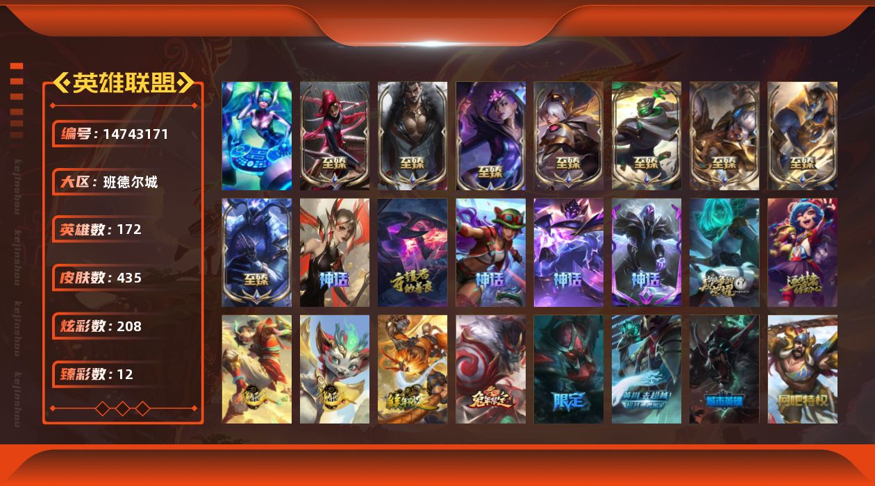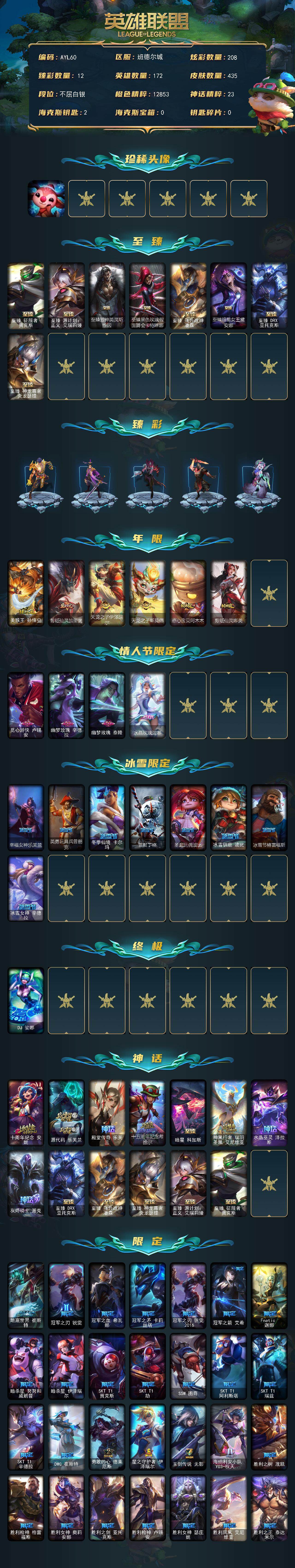 [14743171]【店主推荐捡漏号】白银段位-172英雄-435皮肤-208炫彩-1终极-16神话-62限定-40传说-114史诗 【珍稀头像】:至爱的鹿头像 【至臻皮肤】:至臻征服者贾克斯,至臻源计划正义艾瑞莉娅,至臻狼神英灵斯维因,至臻黑色玫瑰假面舞会卡特琳娜,至臻飞升战神潘森,至臻暗星女王黛安娜,至臻drx亚托克斯,至臻神龙尊者炎龙瑟提 【臻彩皮肤】:天龙之子卡莎飞龙乘云,神龙尊者圣龙李青龙腾云起,幻灵白鸽萨勒芬妮梦幻强袭,花仙子拉克丝纹白,玉剑传说无极麒麟,西部魔影卢锡安贝利尔之怠,灰烬守护者慎余烬觉醒,殿堂传奇乐芙兰登神,魔女阿卡丽虚荣,净雪之月莫甘娜冬虹 【年限皮肤】:美猴王孙悟空,剪纸仙灵加里奥,天龙之子伊泽瑞尔,天龙之子斯莫德,点心宝贝阿木木,剪纸仙灵娜美 【情人节限定】:觅心游侠卢锡安,幽梦玫瑰辛德拉,幽梦玫瑰泰隆,水晶玫瑰迦娜 【冰雪限定】:幸福女神乐芙兰,英勇玩具兵普朗克,冬季仙境卡尔玛,雪默丁格,圣诞玩偶波比,冰雪驯鹿波比,冰雪节格雷福斯,冰雪女神辛德拉 【终极皮肤】:dj娑娜 【神话皮肤】:十周年纪念安妮,源代码乐芙兰,殿堂传奇乐芙兰,十五周年纪念希维尔,暗星科加斯,神凰行者瑞羽圣凰艾尼维亚,水晶巫灵泽拉斯,灰烬骑士派克,至臻征服者贾克斯,至臻drx亚托克斯,至臻飞升战神潘森,至臻神龙尊者炎龙瑟提,至臻源计划正义艾瑞莉娅 【限定皮肤】:地底世界崔斯特,冠军之刃锐雯,冠军之血希瓦娜,冠军之矛卡莉丝塔,冠军之刃锐雯2016,冠军之箭艾希,fnatic迦娜,暗杀星努努和威朗普,暗杀星伊泽瑞尔,sktt1贾克斯,sktt1劫,ssw图奇,sktt1阿利斯塔,sktt1瑞兹,sktt1辛德拉,dwg崔斯特,勇敢的心德莱厄斯,星之守护者伊泽瑞尔,玉剑传说无影,海珀利安小队y03权天使卡蜜尔,胜利之树茂凯,胜利呛神格雷福斯,胜利女神奥莉安娜,胜利之剑亚托克斯,胜利呛神卢锡安,胜利女神瑟庄妮,胜利凤凰艾尼维亚,胜利之王泰达米尔,胜利巨口克格莫,南瓜头费德提克,小恶魔菲兹,无头骑士赫卡里姆,泳池派对格雷福斯,泳池派对雷克顿,破空呛骑孙悟空,暗影沃里克,野兽猎人泰达米尔,都铎王朝图奇,征服者诺提勒斯,防暴士兵格雷福斯,防暴天使凯尔,惊悚派对阿木木,双城之战2微光实验室辛吉德,双城之战2指挥官凯特琳 【传说皮肤】:铁哥们儿奥拉夫,地狱之门卫士加里奥,战地机甲厄加特,钢铁之翼凯尔