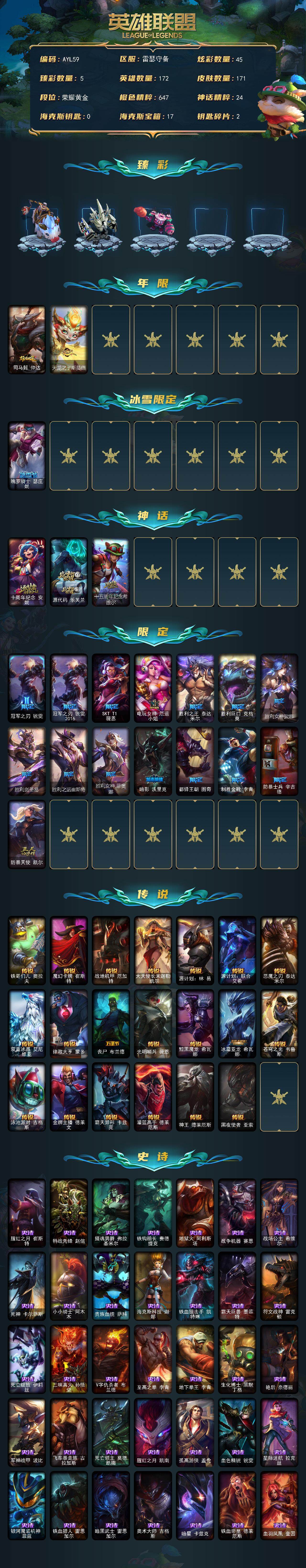 172英雄-171皮肤-可二次【店主推荐捡漏号!可直接换绑】黄金段位-172英雄-171皮肤-45炫彩-0终极-3神话-18限定-20传说-42史诗 【臻彩皮肤】:无畏骑士瑟庄妮赤子初心,冠军之刃锐雯2016凯旋圣装,霸天巨兽雪崩墨菲特,可爱可爱粉红红布里茨,魔女阿卡丽虚荣 【年限皮肤】:司马懿仲达,天龙之子斯莫德 【冰雪