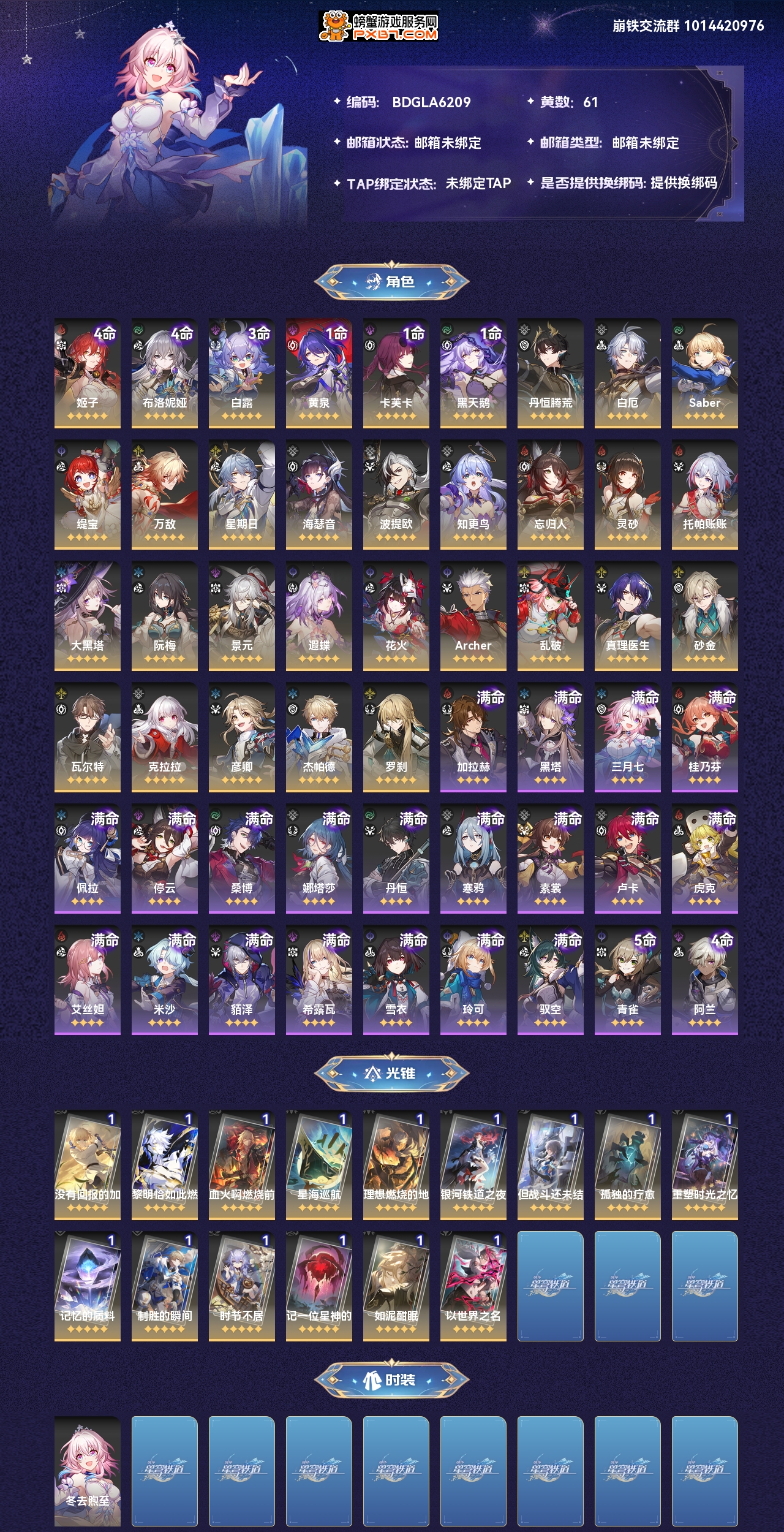 【崩坏·星穹铁道】【lyxq7718】冒险等级:70,女主,五星数量:47,绑定情况:手机号__五星角色:姬子 4命|布洛妮娅 4命|白露 3命|黄泉 1命|卡芙卡 1命|黑天鹅 1命|丹恒·腾荒|白厄|saber|缇宝|万敌|星期日|海瑟音|波提欧|知更鸟|忘归人|灵砂|托帕账账|大黑塔|阮·梅|景元|遐蝶|花火|archer|乱破|真理医生|砂金|瓦尔特|克拉拉|彦卿|杰帕德|罗刹__五星光锥:没有回报的加冕|黎明恰如此燃烧|血火啊,燃烧前路|星海巡航|理想燃烧的地狱|银河铁道之夜|但战斗还未结束|孤独的疗愈|重塑时光之忆|记忆的质料|制胜的瞬间|时节不居|记一位星神的陨落|如泥酣眠|以世界之名,【邮箱未绑定】