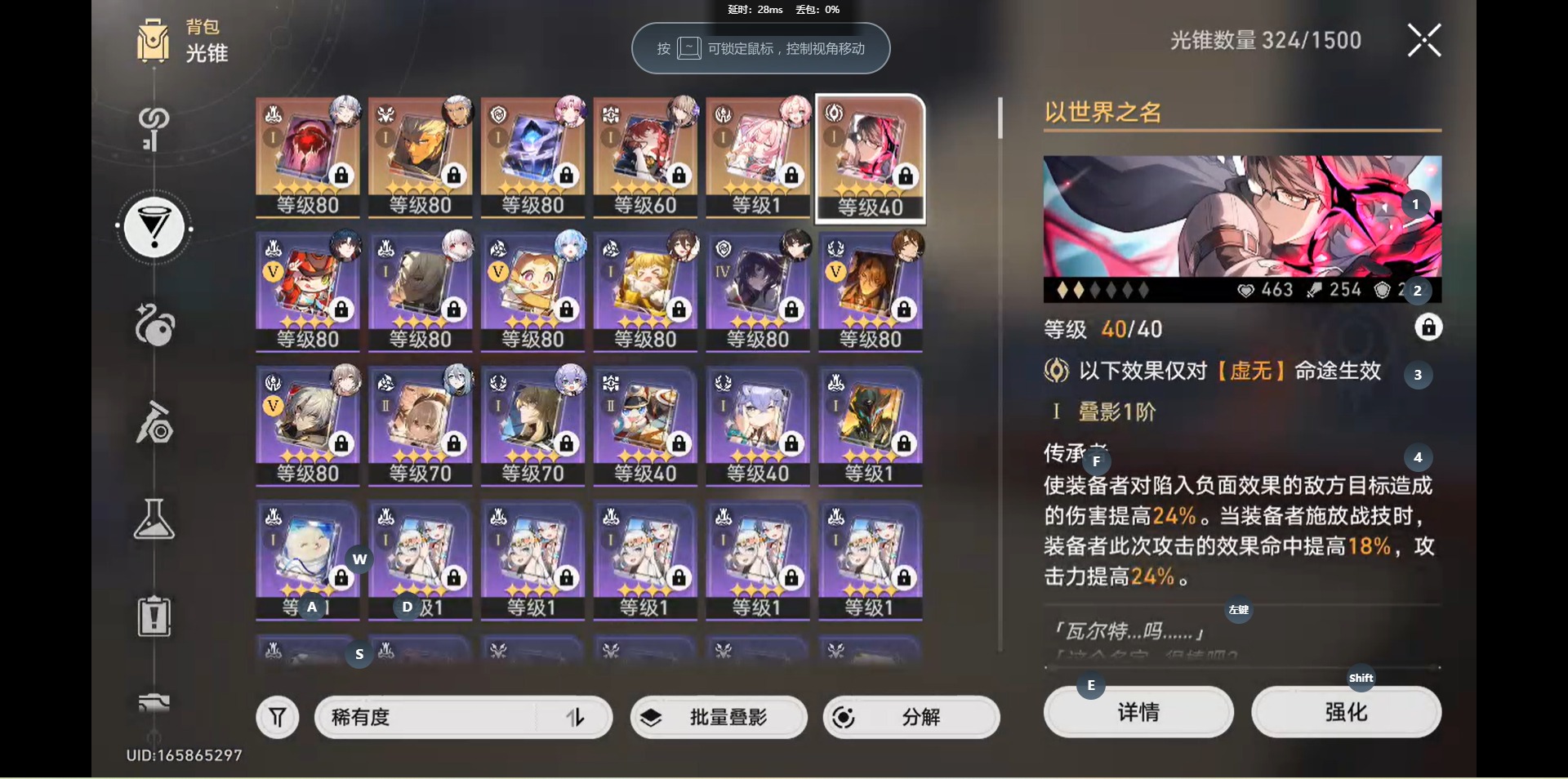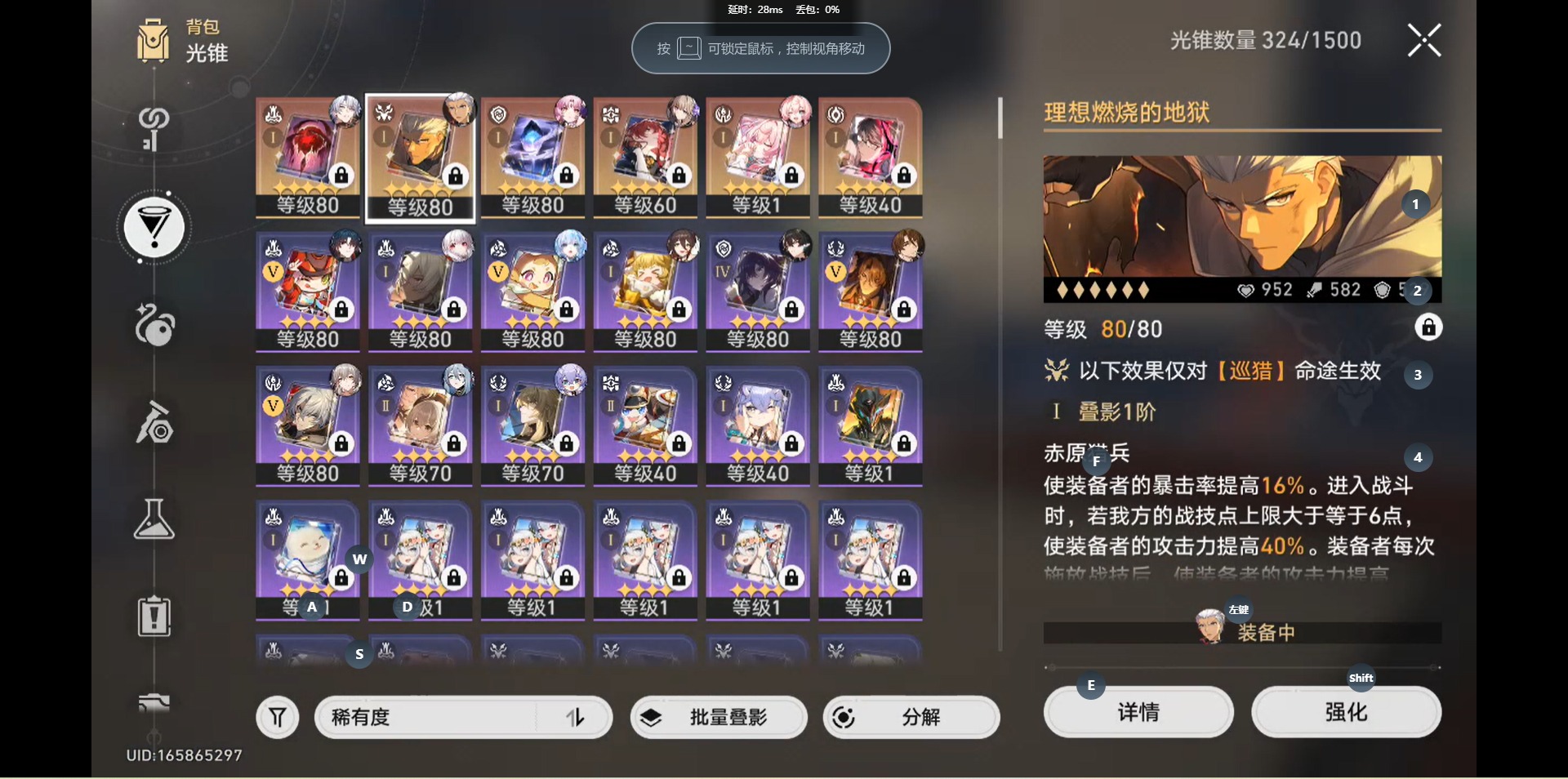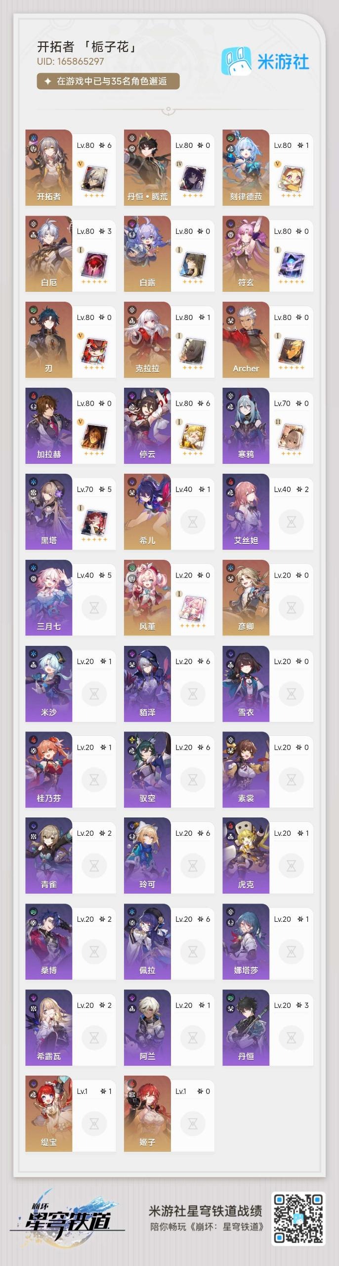 [14450263]【总黄数】:19 【3命金色角色】:3命白厄 【1命金色角色】:1命缇宝1命刻律德菈1命希儿1命克拉拉 【0命金色角色】:0命风堇0命archer0命丹恒·腾荒0命彦卿0命白露0命姬子0命刃0命符玄 【精1武器】:精1愿虹光永驻天空精1理想燃烧的地狱精1以世界之名精1银河铁道之夜精1记忆的质料精1记一位星神的陨落