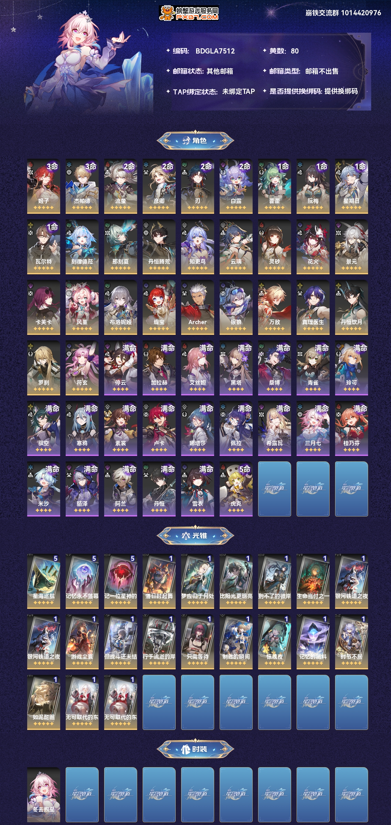【崩坏·星穹铁道】【lyxq7623】冒险等级:70,男主,五星数量:48,绑定情况:邮箱__五星角色:姬子 3命|杰帕德 3命|流萤 2命|彦卿 2命|刃 2命|白露 2命|藿藿 1命|阮·梅 1命|星期日 1命|瓦尔特 1命|刻律德菈|那刻夏|丹恒·腾荒|知更鸟|云璃|灵砂|花火|景元|卡芙卡|风堇|布洛妮娅|缇宝|archer|银狼|万敌|真理医生|丹恒·饮月|罗刹|符玄__五星光锥:星海巡航 5精|记忆永不落幕 5精|记一位星神的陨落 5精|落日时起舞|梦应归于何处|比阳光更明亮的|到不了的彼岸|生命当付之一炬|银河铁道之夜|游戏尘寰|但战斗还未结束|行于流逝的岸|只需等待|制胜的瞬间|惊魂夜|记忆的质料|时节不居|如泥酣眠|无可取代的东西,【邮箱不出售】1