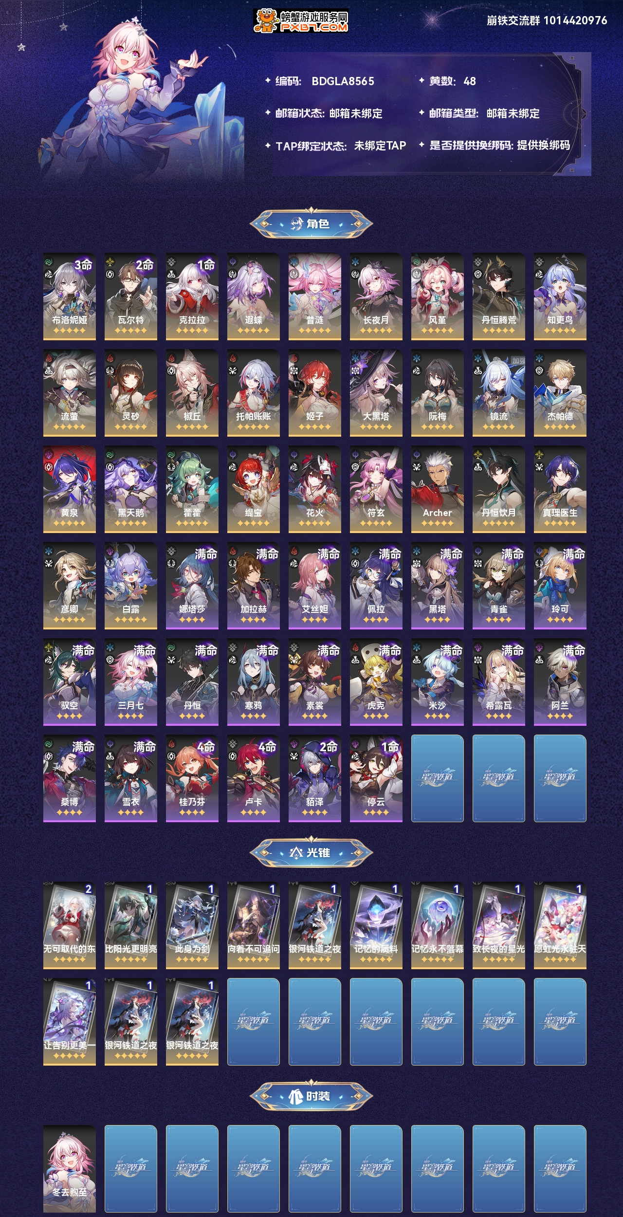 【崩坏·星穹铁道】【lyxq7778】冒险等级:70,女主,五星数量:39,绑定情况:手机号__五星角色:布洛妮娅 3命|瓦尔特 2命|克拉拉 1命|遐蝶|昔涟|长夜月|风堇|丹恒·腾荒|知更鸟|流萤|灵砂|椒丘|托帕账账|姬子|大黑塔|阮·梅|镜流|杰帕德|黄泉|黑天鹅|藿藿|缇宝|花火|符玄|archer|丹恒·饮月|真理医生|彦卿|白露__五星光锥:无可取代的东西 2精|比阳光更明亮的|此身为剑|向着不可追问处|银河铁道之夜|记忆的质料|记忆永不落幕|致长夜的星光|愿虹光永驻天空|让告别,更美一些,【邮箱未绑定】