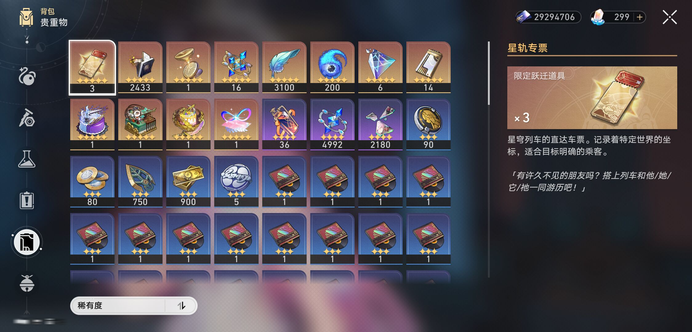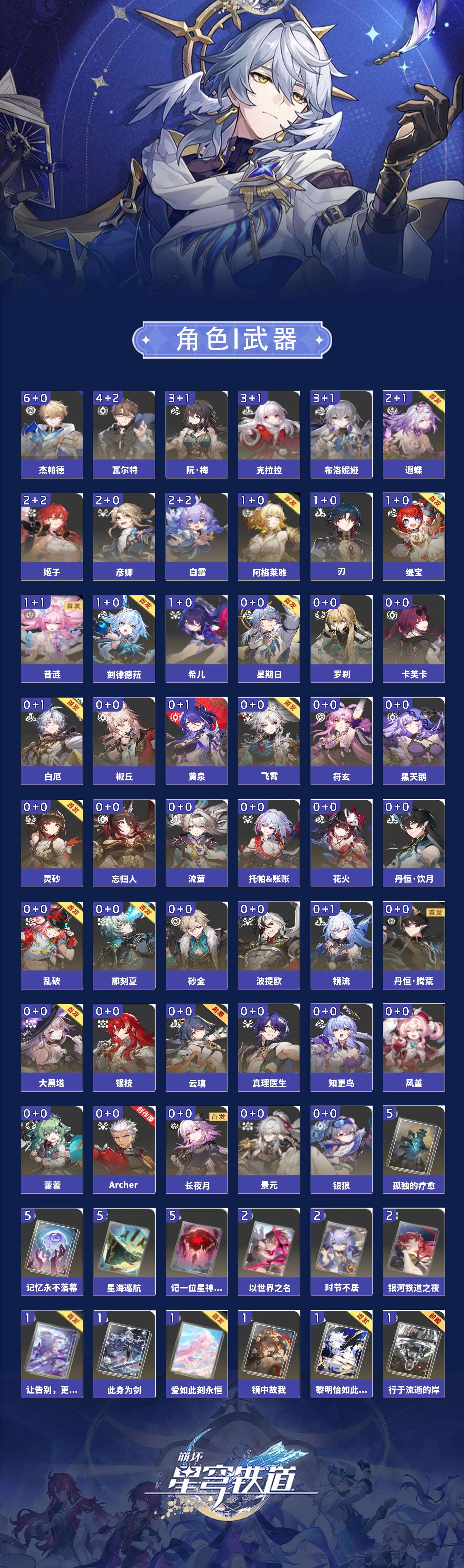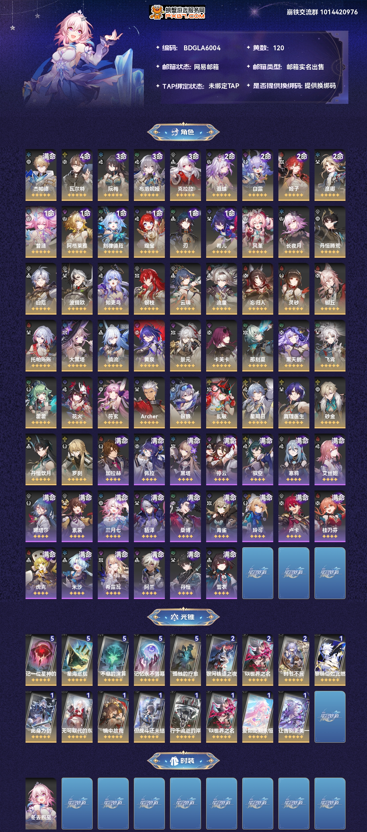 【崩坏·星穹铁道】【lyxq7766】冒险等级:70,男主,五星数量:63,绑定情况:邮箱__五星角色:杰帕德 6命|瓦尔特 4命|阮·梅 3命|布洛妮娅 3命|克拉拉 3命|遐蝶 2命|白露 2命|姬子 2命|彦卿 2命|昔涟 1命|阿格莱雅 1命|刻律德菈 1命|缇宝 1命|刃 1命|希儿 1命|风堇|长夜月|丹恒·腾荒|白厄|波提欧|知更鸟|银枝|云璃|流萤|忘归人|灵砂|椒丘|托帕账账|大黑塔|镜流|黄泉|景元|卡芙卡|那刻夏|黑天鹅|飞霄|藿藿|花火|符玄|archer|银狼|乱破|星期日|真理医生|砂金|丹恒·饮月|罗刹__五星光锥:记一位星神的陨落 5精|星海巡航 5精|不息的演算 5精|记忆永不落幕 5精|孤独的疗愈 5精|银河铁道之夜 2精|以世界之名 2精|时节不居 2精|黎明恰如此燃烧|此身为剑|无可取代的东西|镜中故我|但战斗还未结束|行于流逝的岸|爱如此刻永恒|让告别,更美一些,【邮箱已实名】