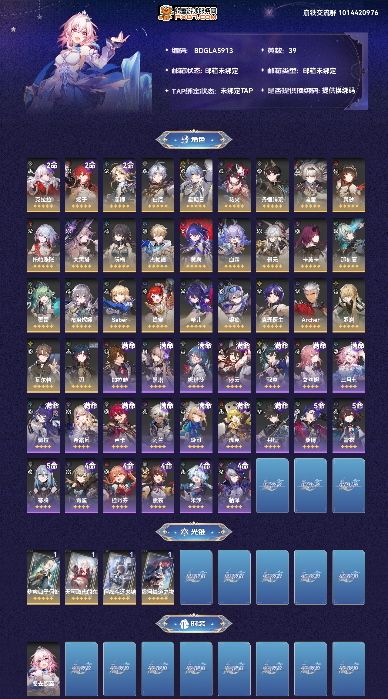 【崩坏·星穹铁道】【lyxq7801】冒险等级:69,女主,五星数量:33,绑定情况:手机号__五星角色:克拉拉 2命|姬子 2命|彦卿 2命|白厄|星期日|花火|丹恒·腾荒|流萤|灵砂|托帕账账|大黑塔|阮·梅|杰帕德|黄泉|白露|景元|卡芙卡|那刻夏|藿藿|布洛妮娅|saber|缇宝|希儿|银狼|真理医生|archer|罗刹|瓦尔特|刃__五星光锥:梦应归于何处|无可取代的东西|但战斗还未结束|银河铁道之夜,【邮箱未绑定】